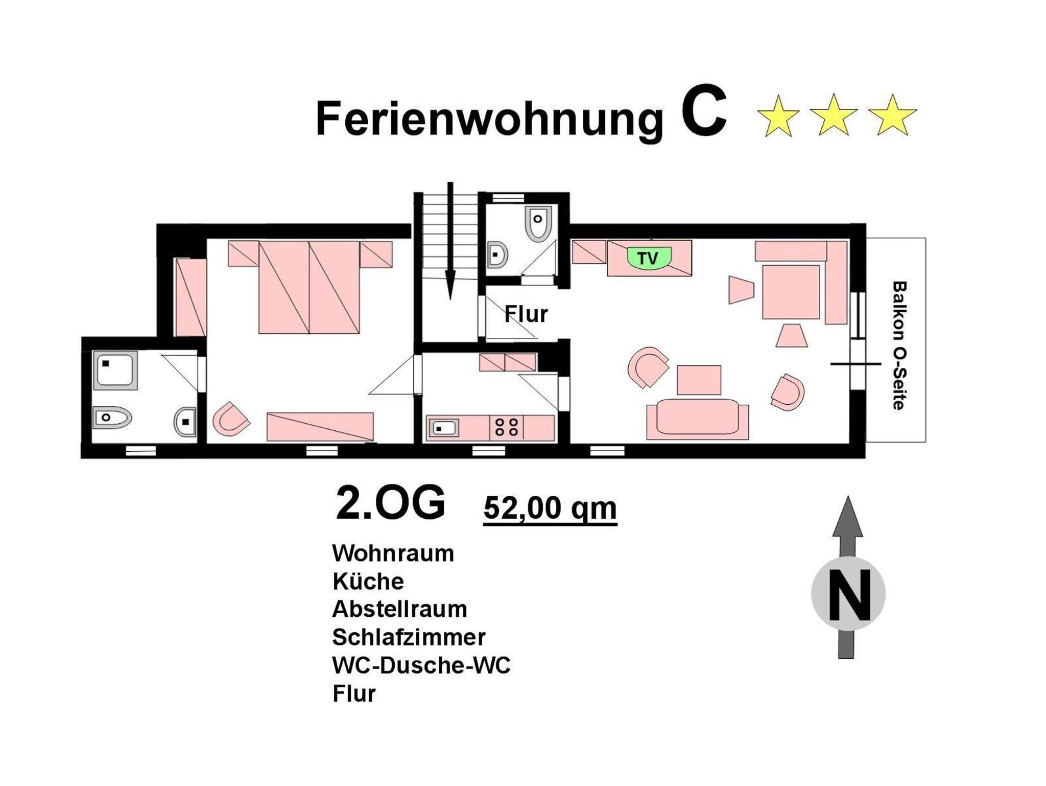 Wohnung C 3 Sterne 52 qm liegt im 2.Obergeschoss ist hell und geräumig. Küche-Wohn und Schlafzimmer sind getrennt. Dusche-WC und seperates WC. Ostbalkon mit Blick aufs Estergebirge. W-Lan