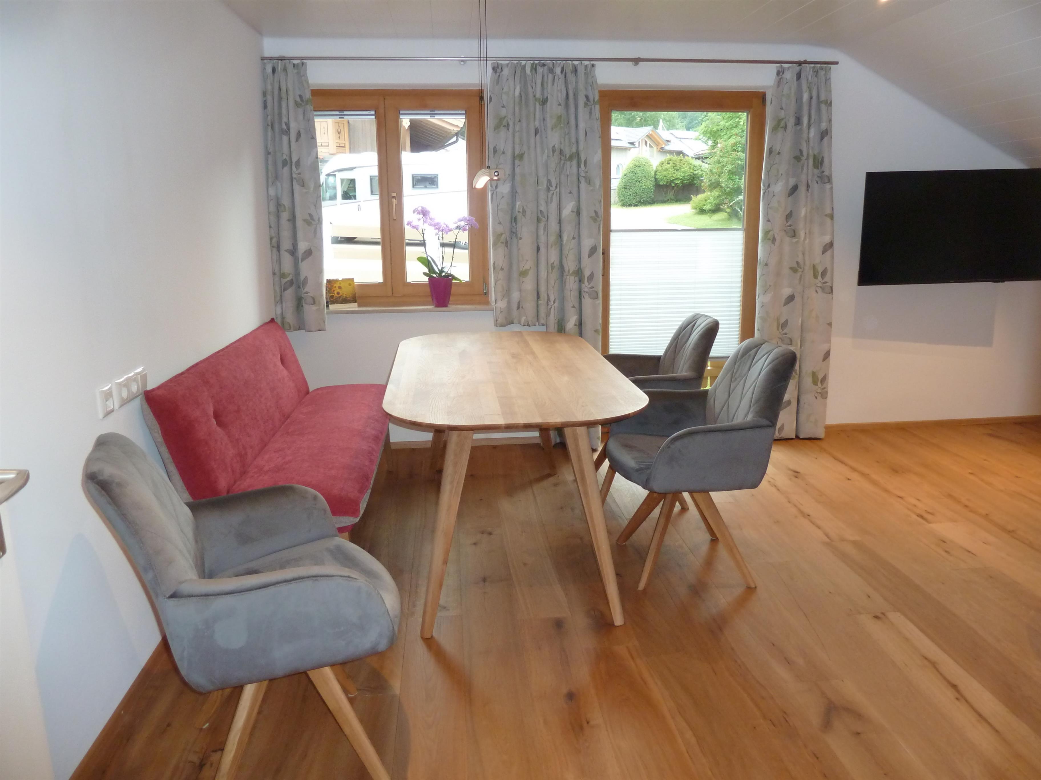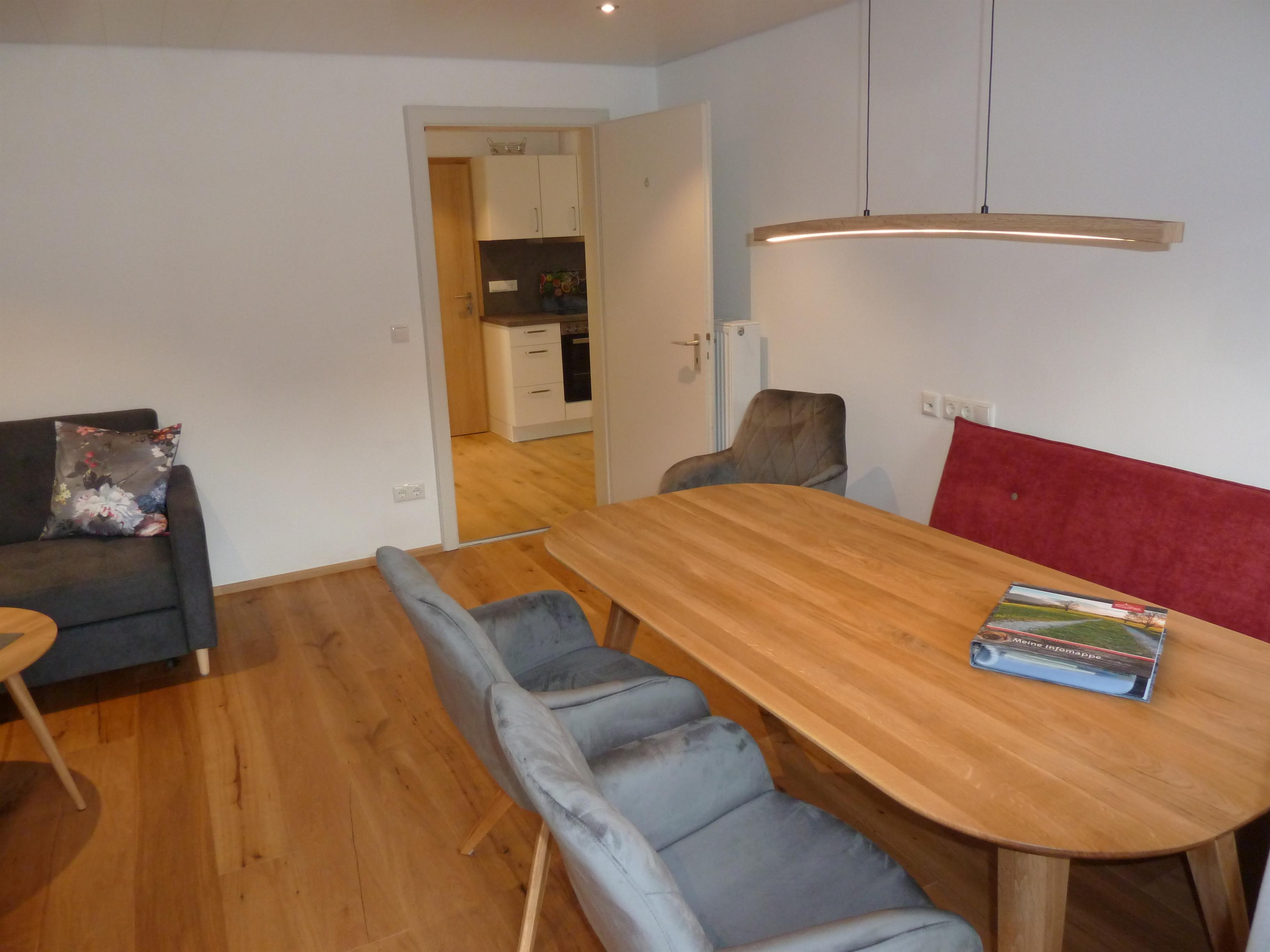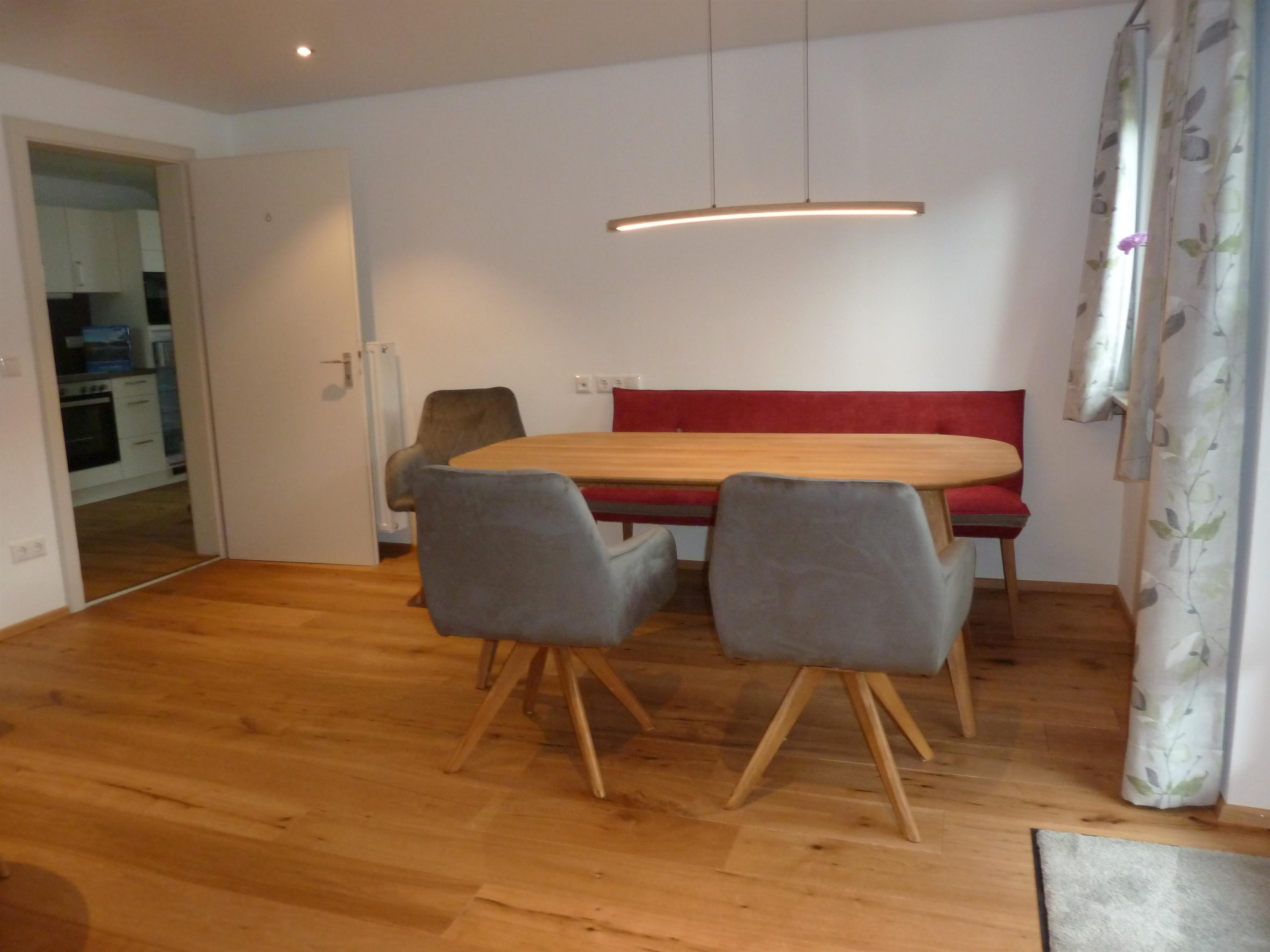 Im geräumigen Wohn-und Esszimmer mit Balkontüre, Smart TV und Lan Anschluss am großen Esstisch für 6 Personen, bequemer Bank und dreh Sesseln, laden zum gemütlichen beisammen sein ein. Komfortables Sofa (als Schlafgelegenheit möglich) und einen Schlafsessel (102cm*190cm).
