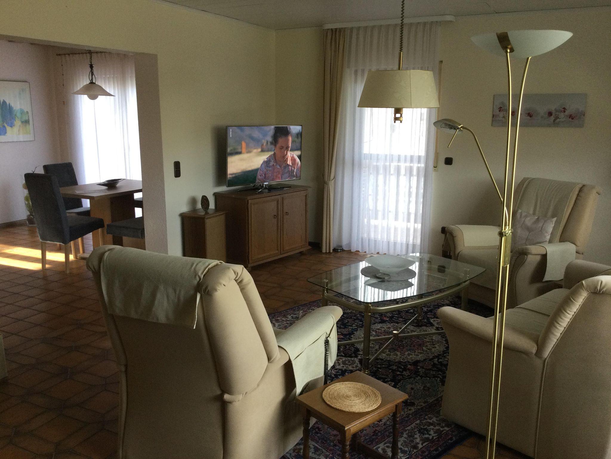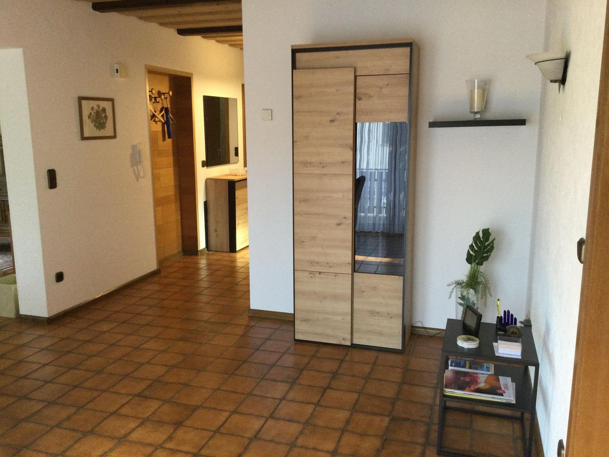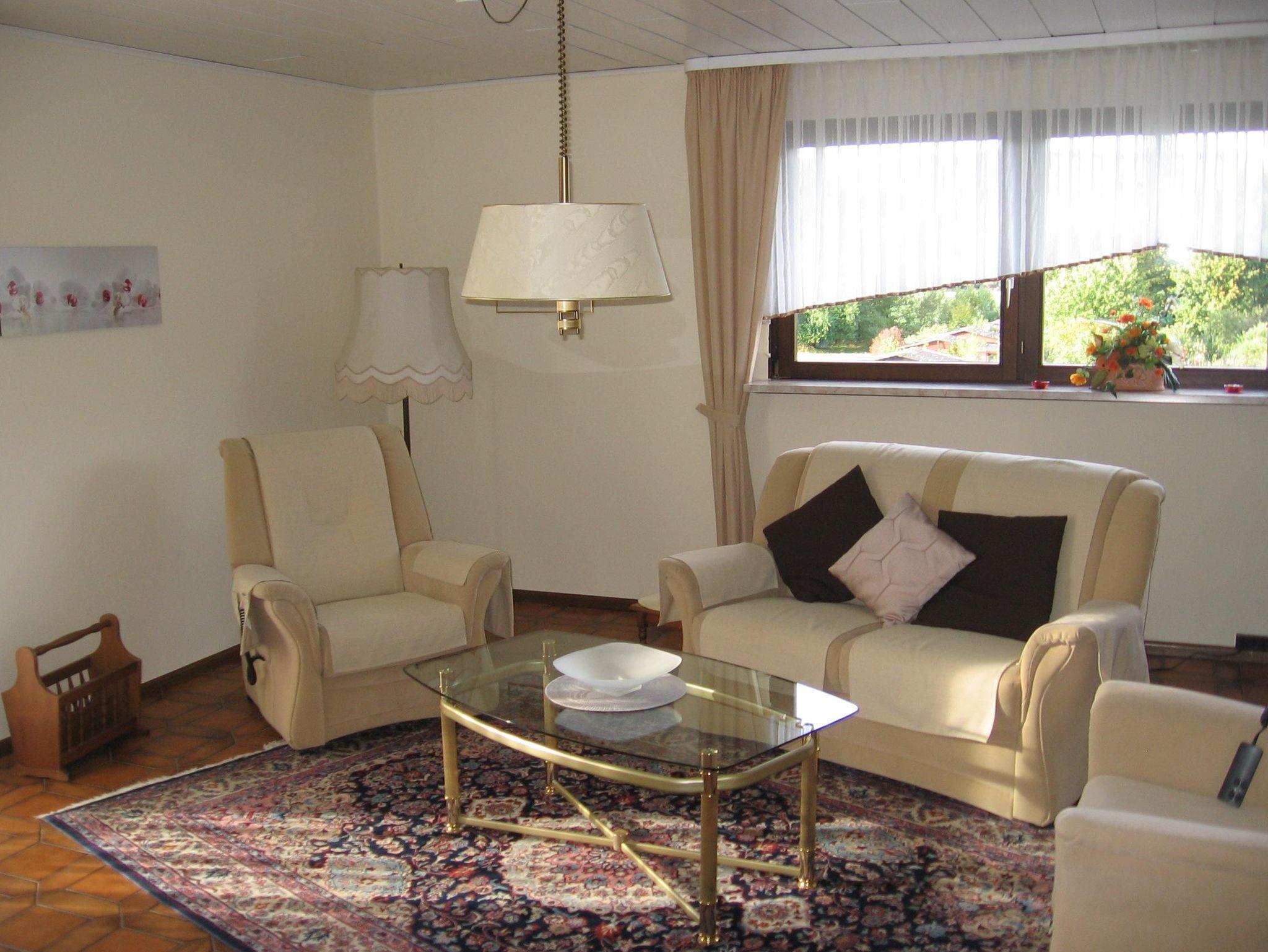 Ruhig gelegene Ferienwohnung mit großem Balkon im 1. Obergeschoss eines Zweifamilienhauses. 3 ZKB, Fußbodenheizung. SAT-TV im Wohn- und in einem Schlafzimmer. Eßzimmer (Eckbankgruppe) im großzügigen Dielenbereich und zusätzliche Eßbankgruppe in der Küche. Kinderhochstuhl und Kinderreisebett sind vorhanden. Badezimmer mit Wanne und separater Dusche und WC. Getrenntes Gäste-WC. 2 getrennte Schlafzimmer, eines mit Doppelbett und eines mit einem Einzelbett. WLAN, Nichtraucherwohnung.