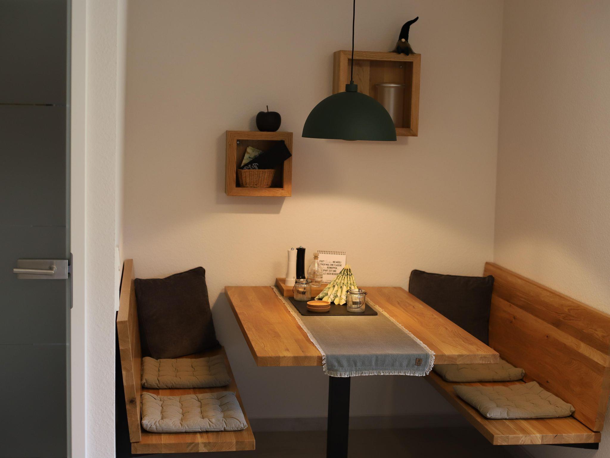 Ergänzt wird der Wohnraum durch eine einladende Nische mit gemütlicher Essecke, die auch einfach mal zum Verweilen einlädt.