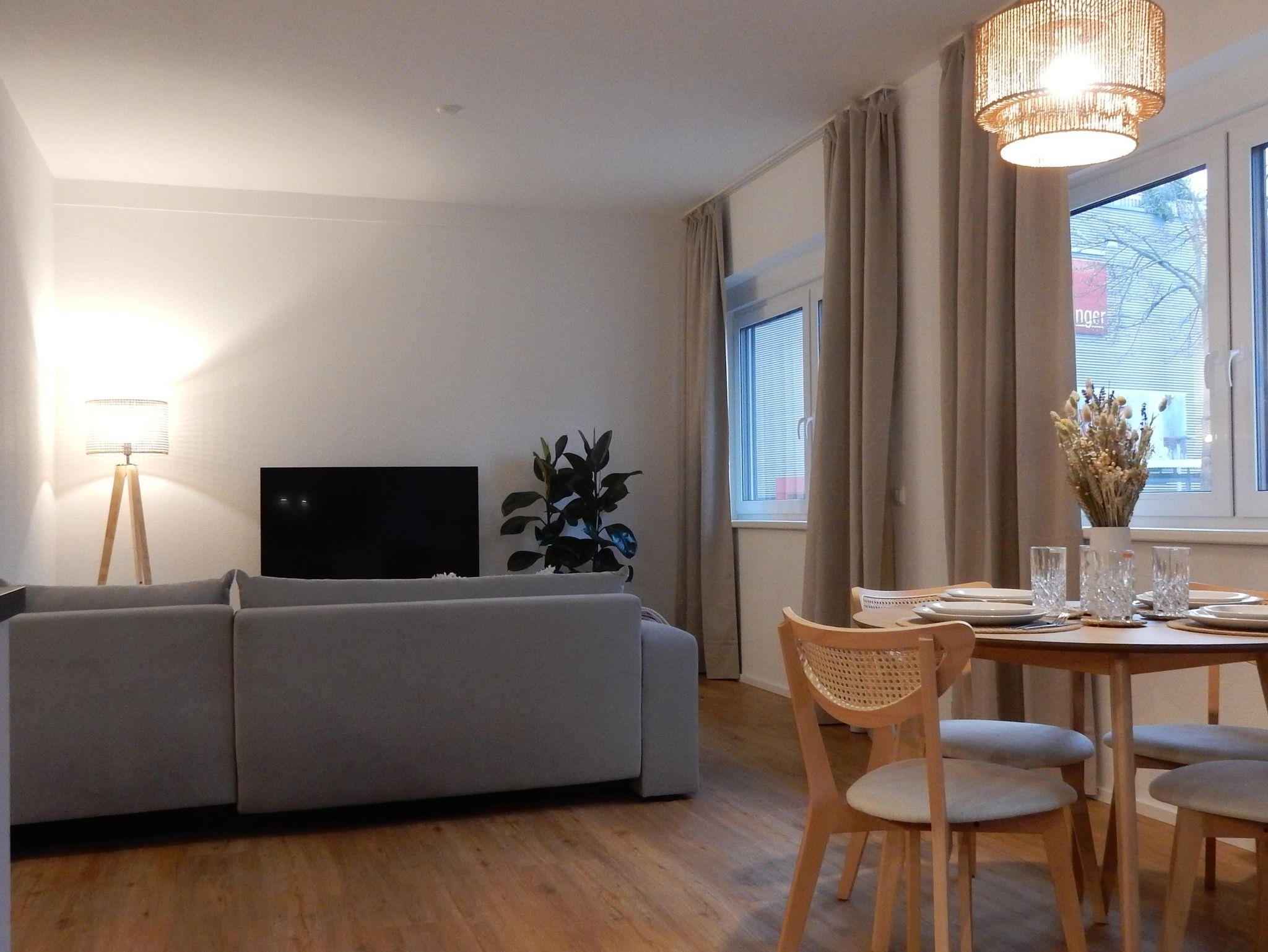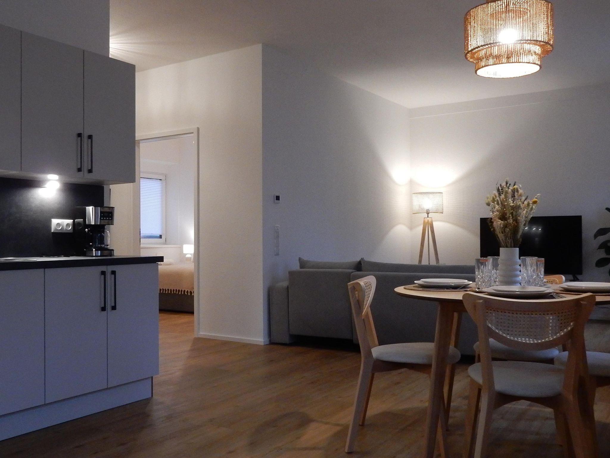 Unsere stilvolle Erdgeschosswohnung im skandinavischen Design ist Eure Wohlfühloase mit 70 qm Wohnfläche. Das helle Schlafzimmer mit King-Size Bett und die bequeme Schlafcouch bieten Platz für bis zu 4 Personen. Die moderne Wohnküche und das luxuriöse Badezimmer machen Euren Aufenthalt perfekt. Entspannt im gemütlichen Wohnzimmer und genießt Entertainment pur auf dem Smart-TV.