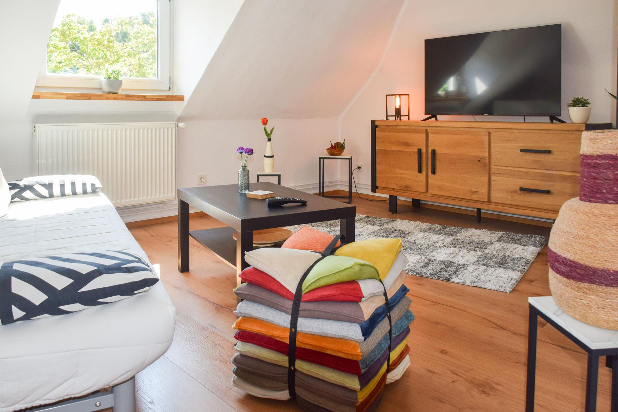 Die Wohnung verbindet behagliches Ambiente mit dem besonderen Charme der Dachschrägen und ist mit viel Liebe zum Detail gestaltet. Hier fühlen Sie sich sofort willkommen – ob für ein entspanntes Wochenende, eine längere Auszeit oder einen Kuraufenthalt.
