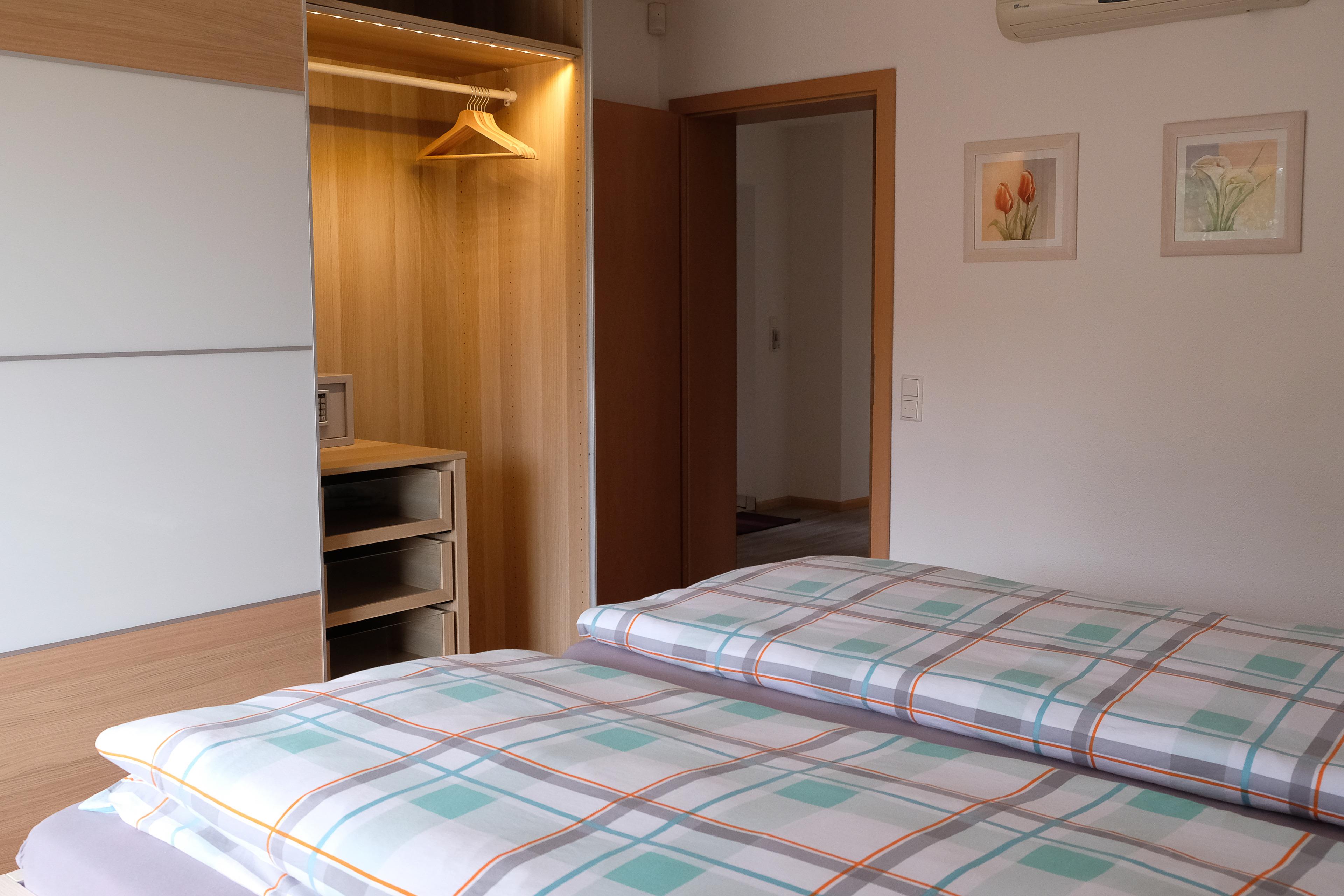 Im Schlafzimmer steht ein 2x2m großes Bett mit getrennten Matratzen und verstellbaren Lattenrosten. Weiterhin befindet sich im Schlafzimmer ein großer Schrank mit eingebautem Tresor (gebührenfrei).