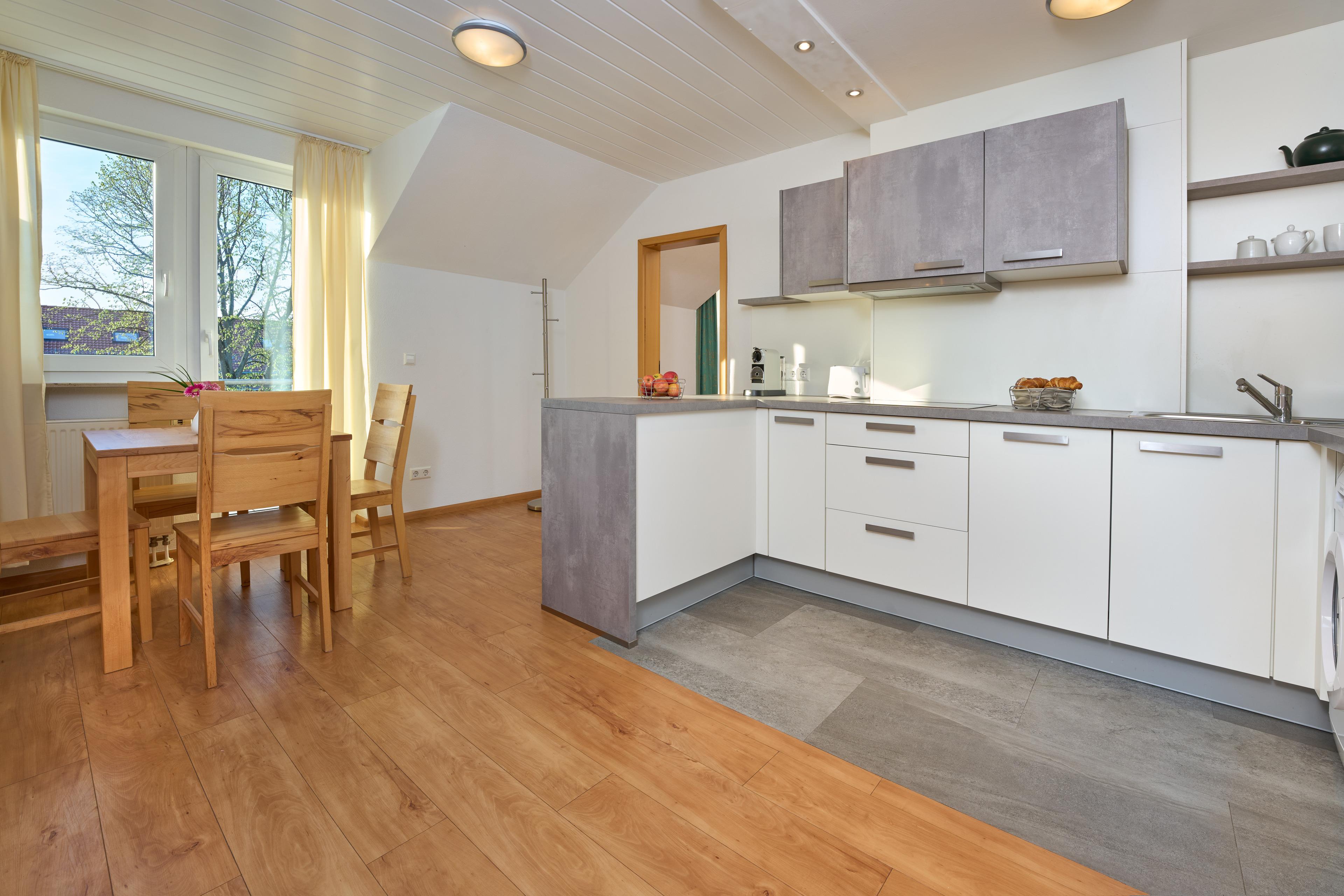 Das Appartement befindet sich im 2. OG. Die Küche hat ein Balkon, der Richtung Westen situiert ist. Das Wohn-Schlafzimmer auch ein Balkon, der ebenso Richtung Westen situiert ist. Es ist ein offenes, helles Appartement, in welchem Schlafzimmer im Wohnzimmer integriert ist. Die vollausgestattete Wohn-Küche ist von Wohn- und Schlafraum mit einer Tür abgetrennt. Das Doppelbett ist ein hochwertiges Boxspringbett. Im Wohn- und Schlafraum befindet sich auch ein Schlafsofa für max. 2 Personen. In der Küche gibt es eine Nespressokaffeemaschine, Kühlschrank mit einem Gefrierfach, Geschirrspülmaschine, Herd mit Backofen, ein Wasserkocher und ein Toaster. Im Appartement gibt es auch eine Waschmaschine. Die Einrichtung wie auch die Accessoires sind sehr eng mit dem Thema Vita Classica verknüpft. Diese Atmosphäre, die im Appartement zu bewundern und spüren gibt, lässt den Gast richtig entspannen. Die Holzart im Appartement ist die Asteiche.