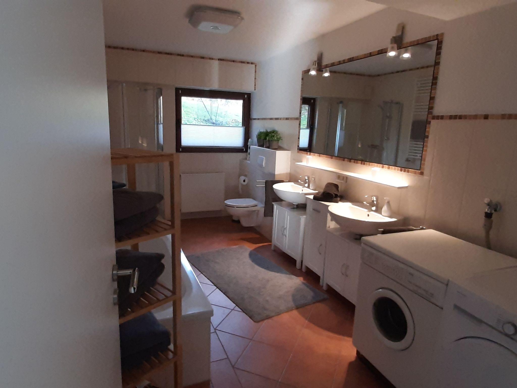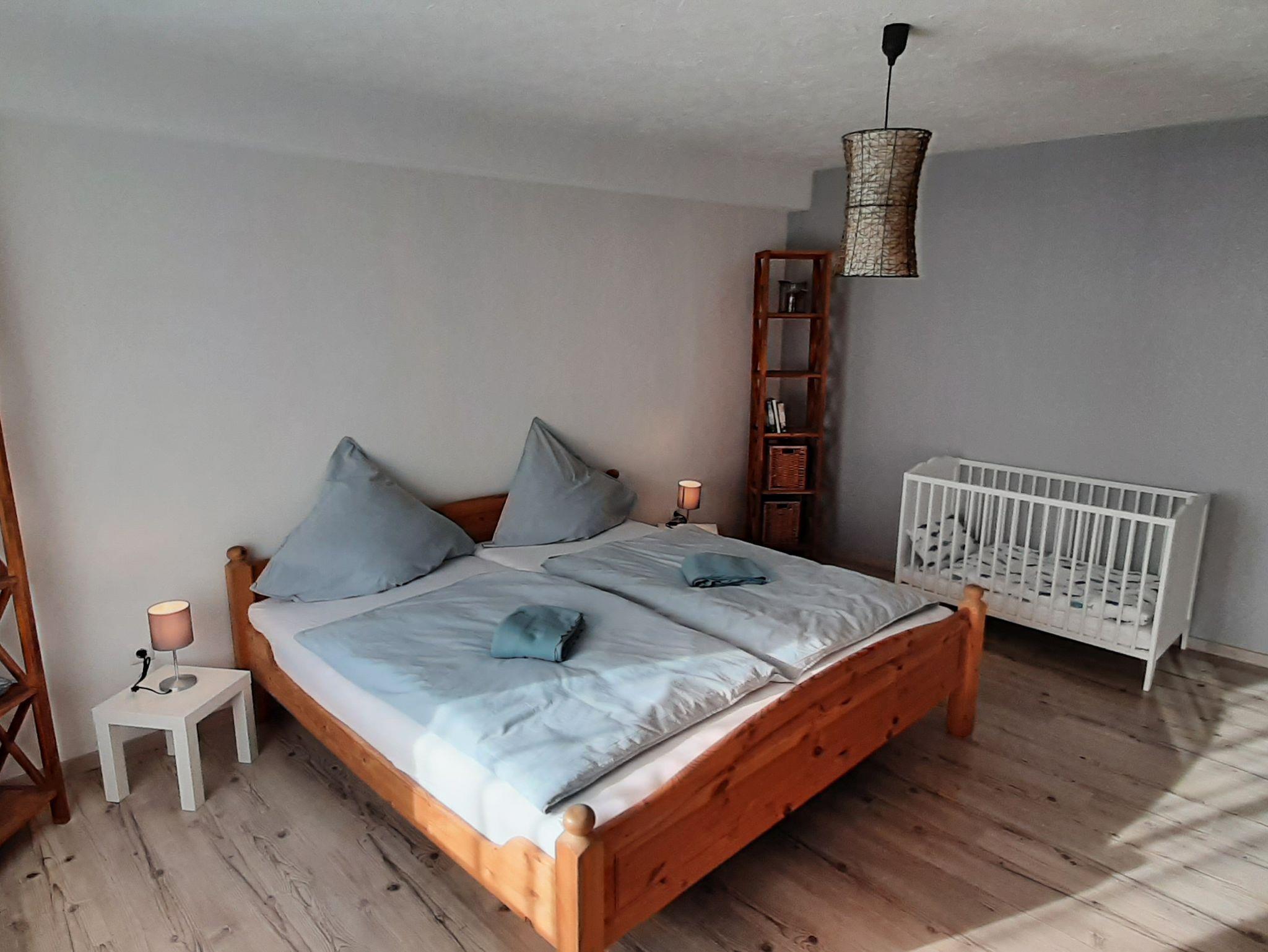 Unsere 80 m² große Ferienwohnung hat einen seperaten, ebenerdigen Eingang und ist für 1-5 Personen ausgestattet und verfügt über - Ess- und Wohnbereich mit Pelletofen- eine sehr gut ausgestattete Küche mit Spülmaschine, Kühlschrank mit Gefrierkombi - 1 Schlafzimmer mit Doppelbett 200x200 cm und Babybett 60x120 cm- 1 Kinderzimmer mit zwei Jugendbetten 90x200 cm - großes Bad mit Dusche und Badewanne.