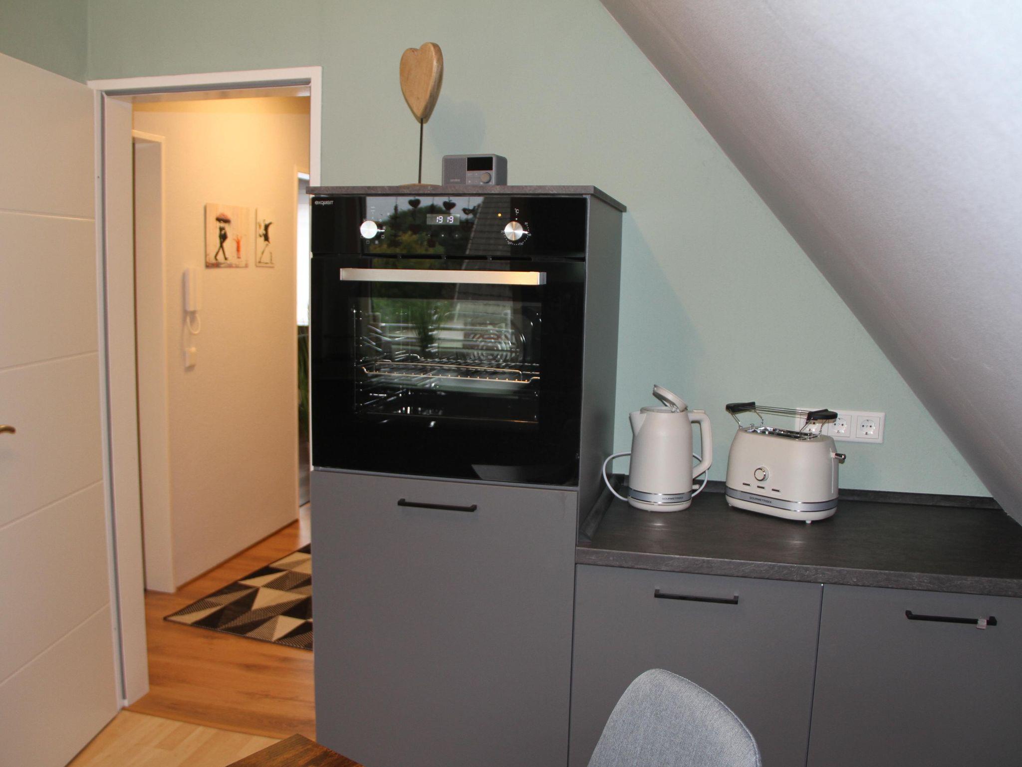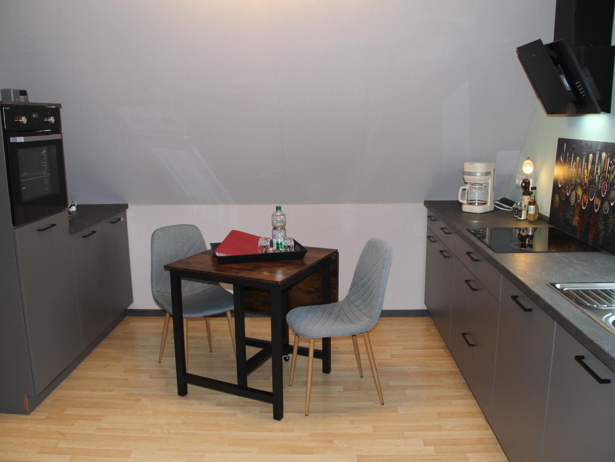 Die offene Wohnküche der Ferienwohnung ist mit allem ausgestattet (Backofen, Spülmaschine, Wasserkocher, Eierkocher, Toaster, Mikrowelle und natürlich einer Kaffeemaschine), so dass es Ihnen an nichts fehlen wird. Vom Wohnzimmer aus gelangen Sie auf den anliegenden Balkon, der zur Ostseite zeigt.