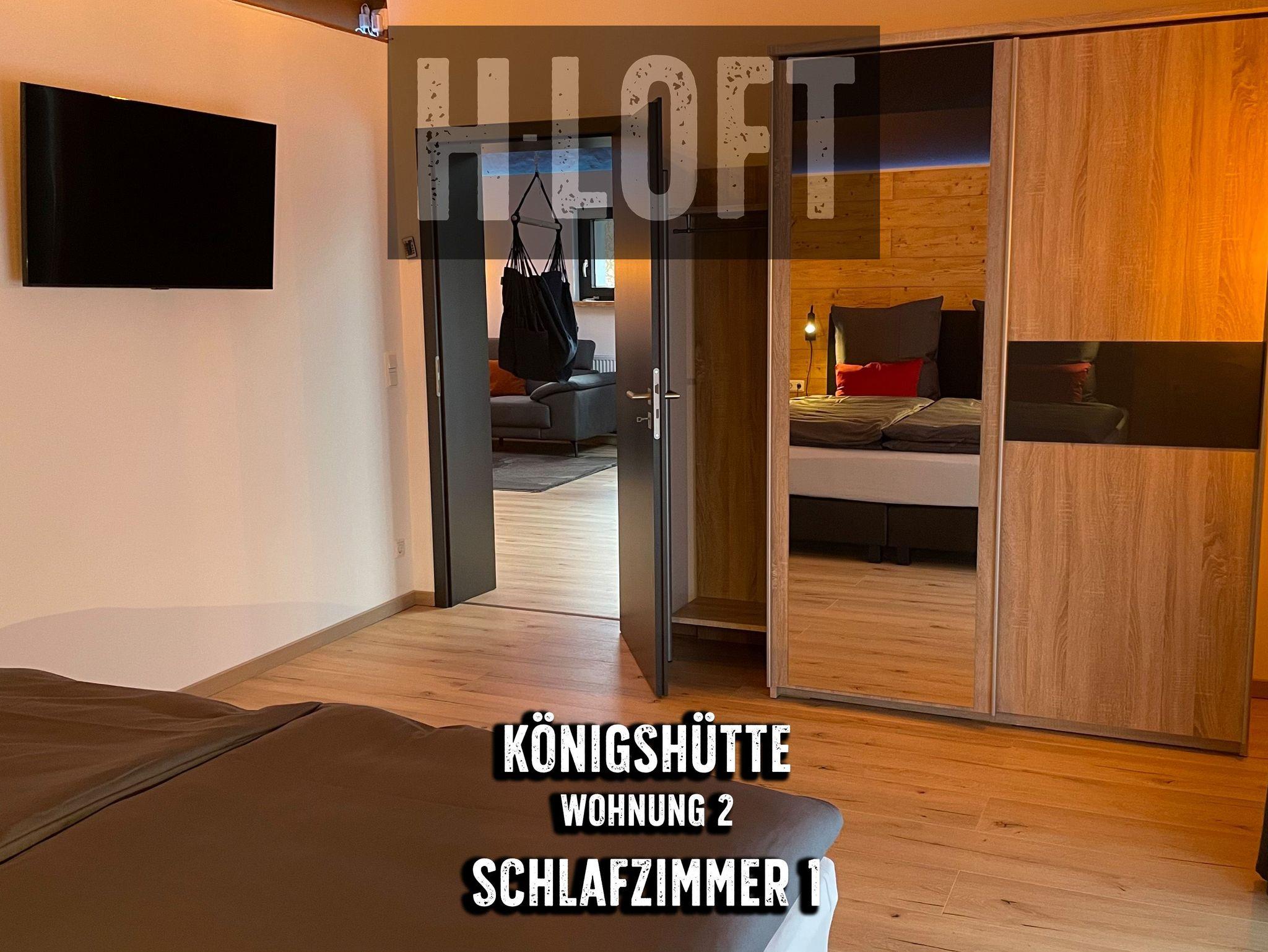 Unsere Königshütte befindet sich im Obergeschoss des Gebäudes. Sie ist ca. 90 qm groß und ist mit allem Komfort ausgestattet. Neben einem Balkon befindet sich in einem der 2 Badezimmer eine Infrarotsauna zur kostenfreien Benutzung. Die Königshütte kann mit der Kupferhütte über eine Tür verbunden werden. Im grossen Schlafzimmer stellen wir gern ein Baby- oder Gästebett für ein Kind zur Verfügung.