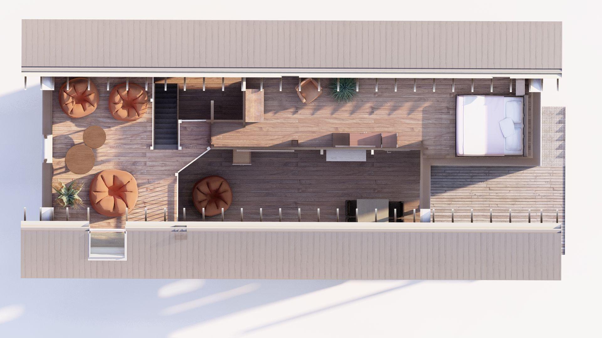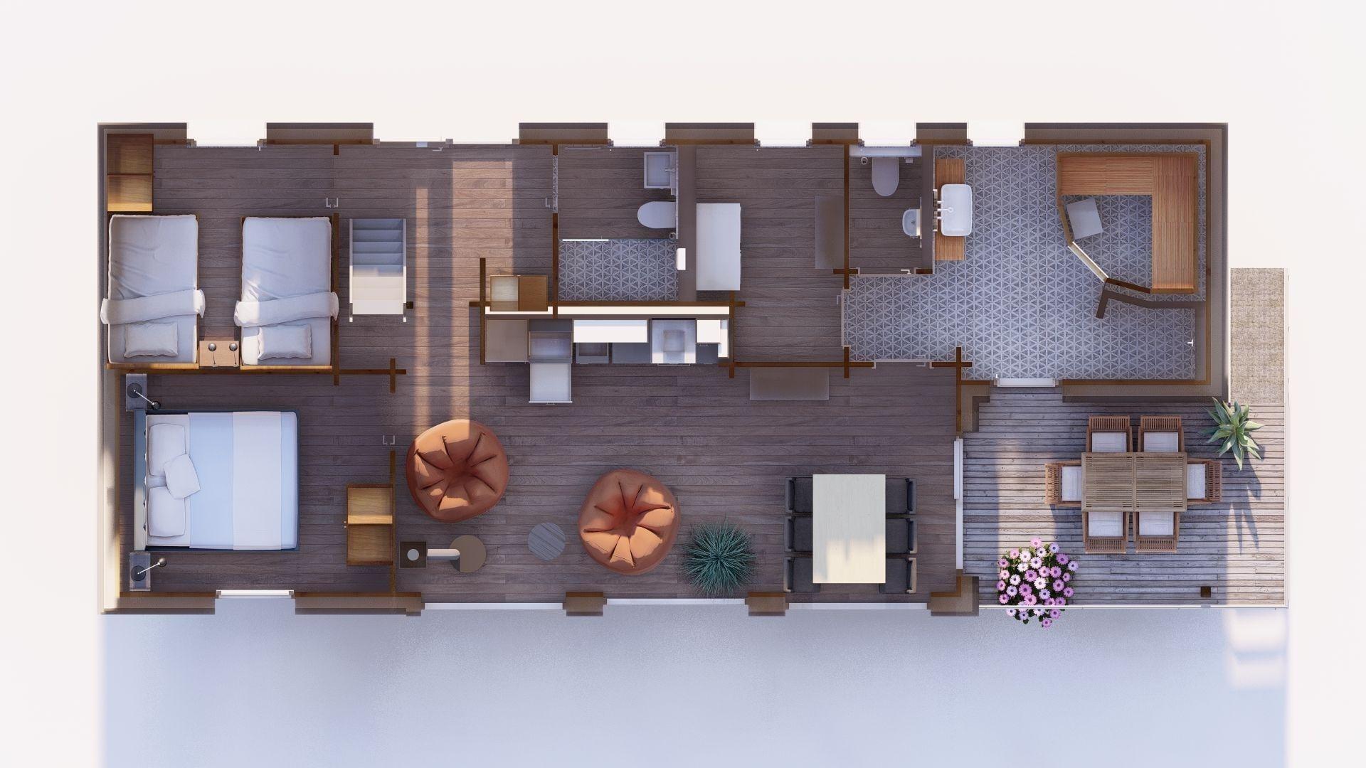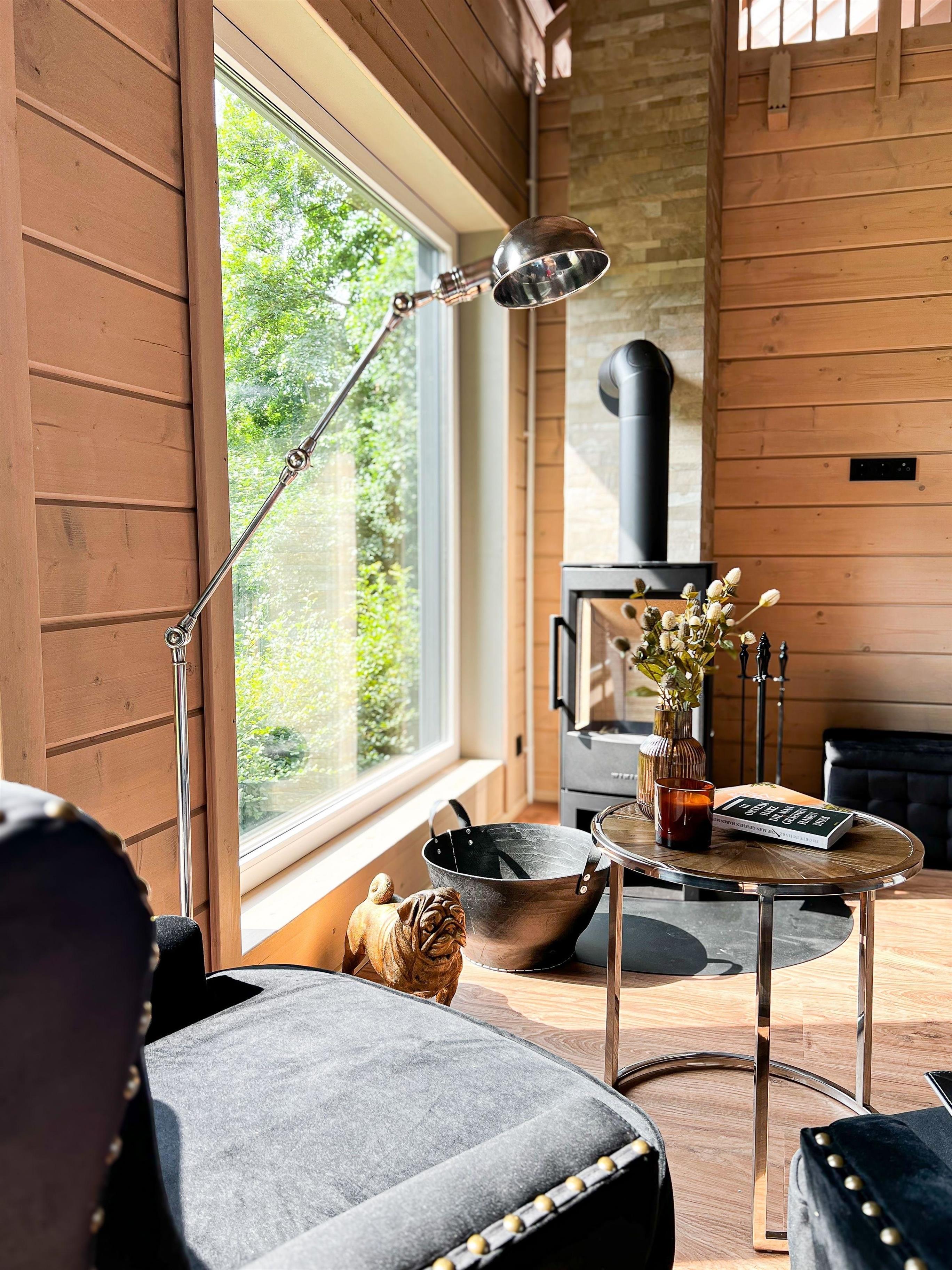 Der Wohnbereich ist geschmackvoll eingerichtet mit massiven Holzmöbeln und bequemen Beanbags, die zum Entspannen einladen. Ein Ofen sorgt für wohlige Wärme und gemütliche Stunden an kühlen Tagen. Für zusätzliche Entspannung steht Ihnen eine finnische Sauna zur Verfügung.
