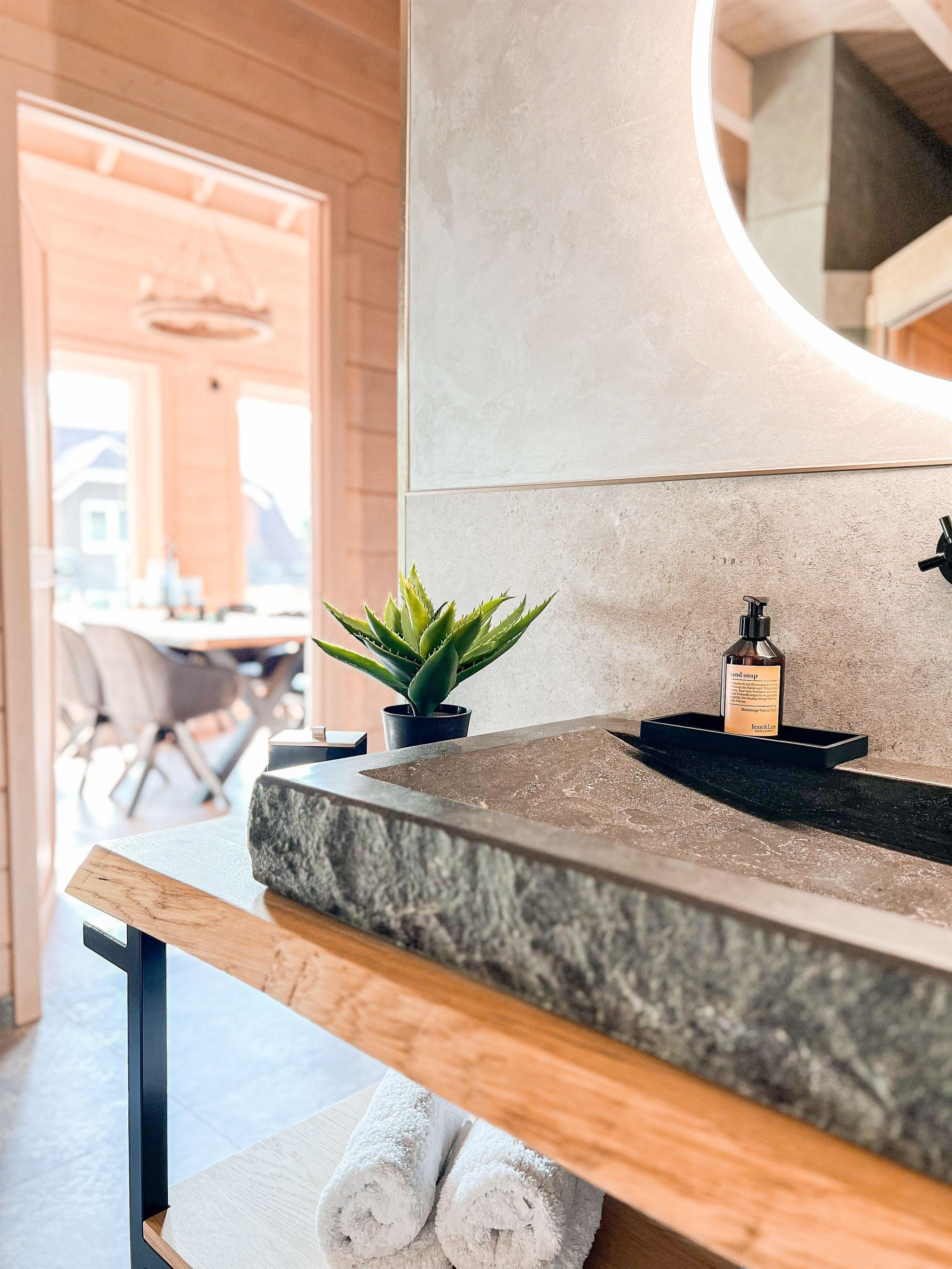 Es verfügt über drei gemütliche Schlafzimmer und zwei Bäder, die mit Natursteinbecken ausgestattet sind. Diese Anordnung sorgt für ausreichend Privatsphäre und Komfort für alle Gäste.
