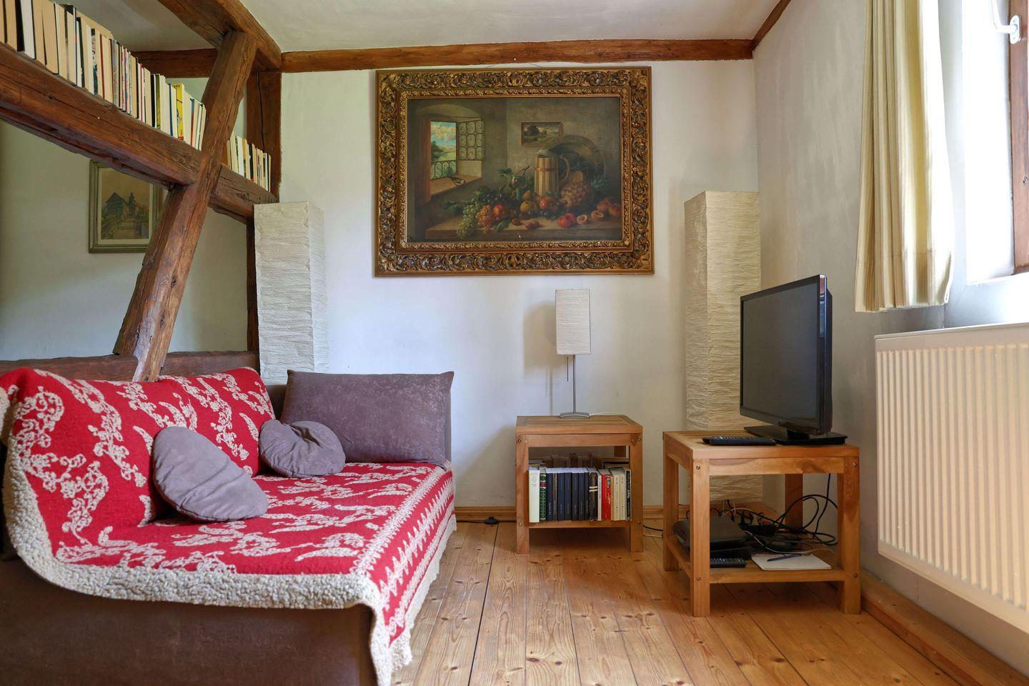 Willkommen in der denkmalgeschützten Lindenmühle, idyllisch gelegen im Schlosspark Glücksbrunn, direkt am Altensteiner Park. Diese Ferienwohnung im restaurierten Fachwerkhaus bietet ein charmantes, gemütliches Ambiente und Platz für bis zu 2 Erwachsene und 2 Kinder, einschließlich einer komfortablen Aufbettungsmöglichkeit im Wohnzimmer.