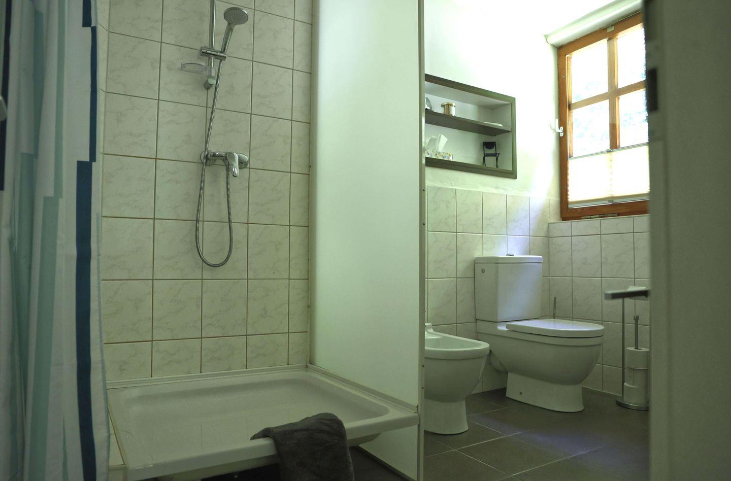 Im separaten Schlafzimmer finden Sie ein komfortables Doppelbett, und von hier aus gelangen Sie direkt ins Badezimmer, das mit einer geräumigen Dusche, WC und Bidet modernen Komfort bietet. Frische Handtücher, Bettwäsche und ein Wäscheständer sind ebenfalls vorhanden, um Ihnen den Aufenthalt so angenehm wie möglich zu gestalten.