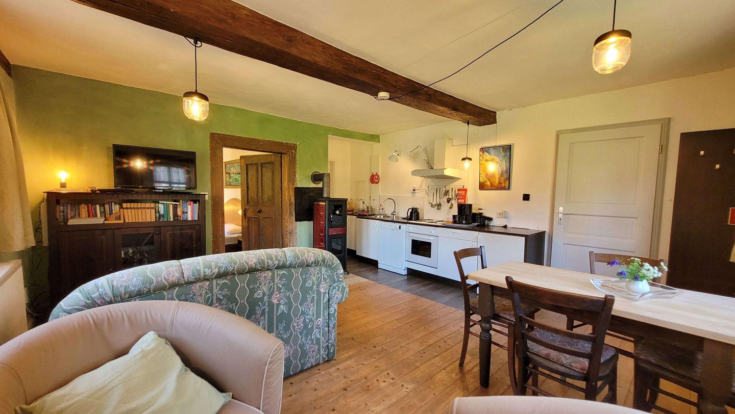 Der offene Wohnbereich bietet eine harmonische Kombination aus Komfort und Charme und lädt zum Entspannen ein. Die voll ausgestattete Küchenzeile ist direkt in den Wohnraum integriert und verfügt über Kochplatten, Backofen, Geschirrspüler, Kaffeemaschine, Wasserkocher und Kühlschrank. Eine gemütliche Essgelegenheit im Wohnbereich macht gemeinsame Mahlzeiten besonders einladend.
