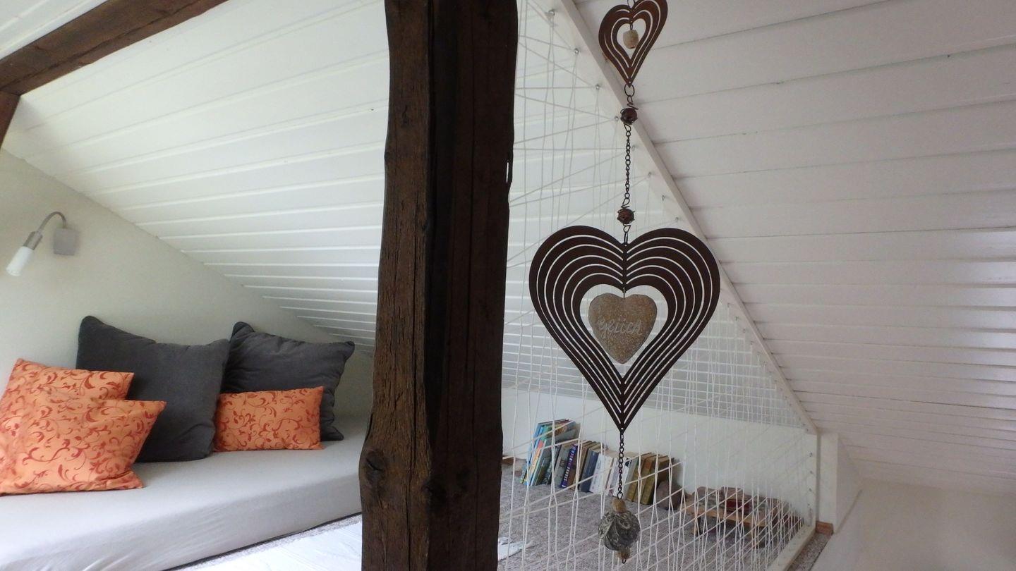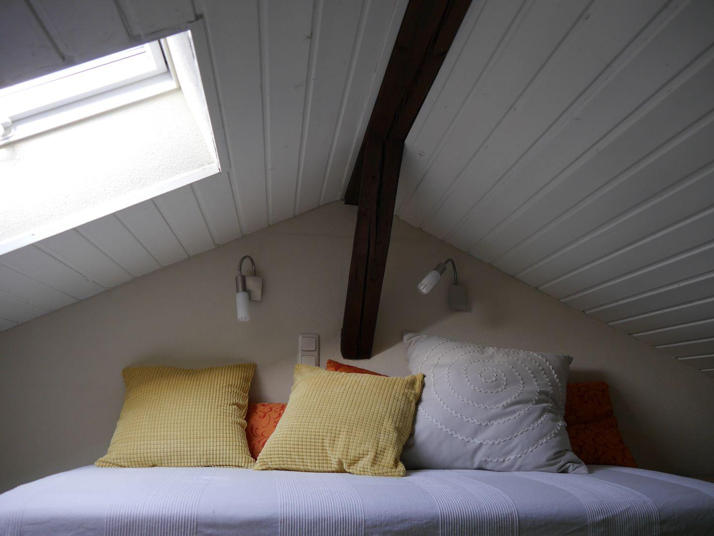Mit ihrer geschmackvollen Einrichtung und hochwertigen Möblierung lädt die Ferienwohnung Villa Bourguet zu einem unvergesslichen Aufenthalt ein: Große Fenster lassen Tageslicht hinein und sorgen für eine helle, freundliche Atmosphäre. Das kombinierte Wohn- und Schlafzimmer ist großzügig eingerichtet. Es bietet ein komfortables Doppelbett, einen Essbereich sowie eine gemütliche Sitzlounge mit TV. Ein Highlight ist die Galerie, die über eine Leiter erreichbar ist. Dort erwartet Sie ein abgeschiedener Platz, um in Ruhe ein Buch zu lesen oder einfach die Seele baumeln zu lassen.