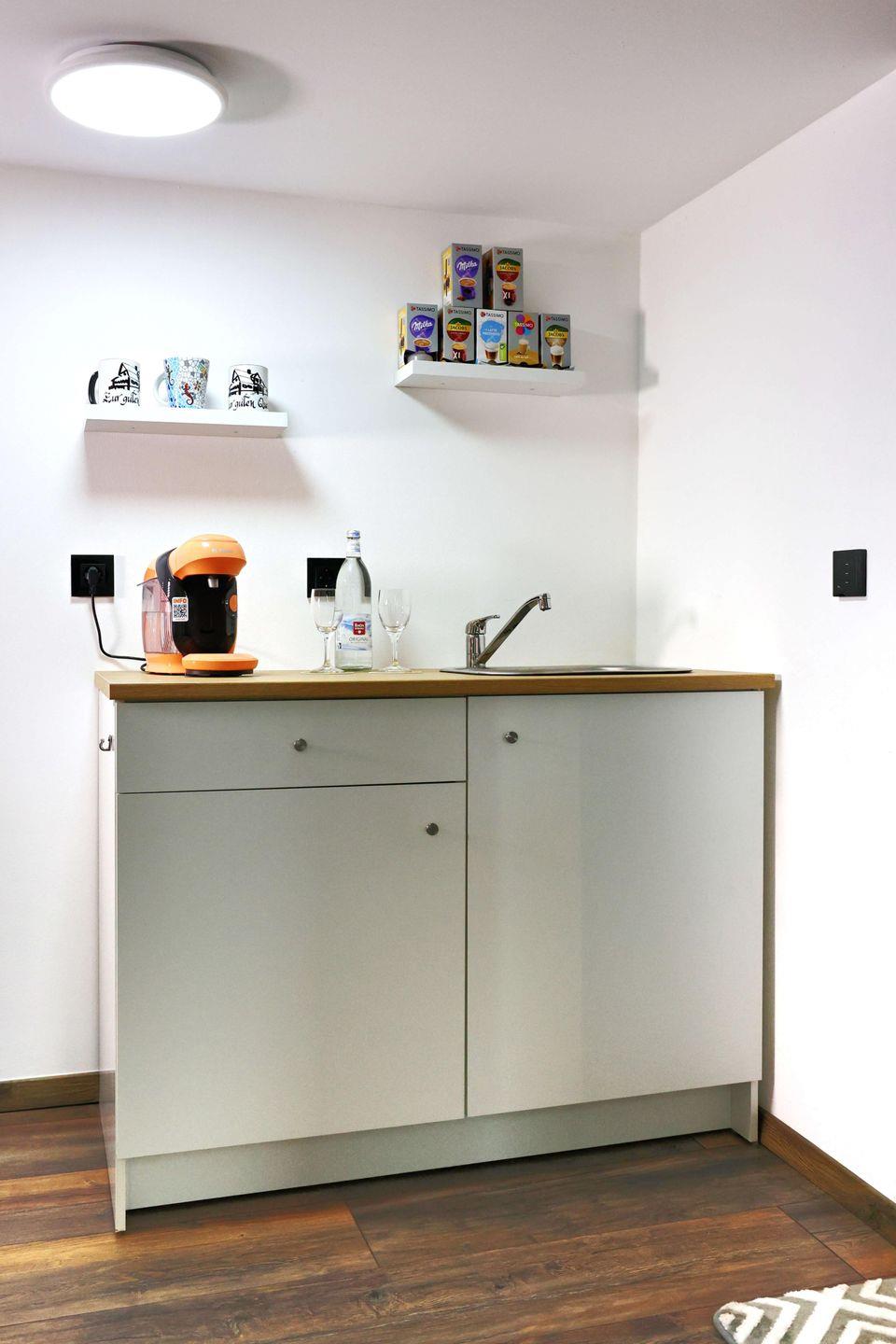 In der Fewo Storchennest erwartet Sie ein behagliches Schlafzimmer, das nach einem aktiven Urlaubstag erholsamen Schlaf verspricht. Der kleine Eingangsbereich führt Sie direkt zur praktischen Küchennische mit Espressomaschine. Hier lassen sich kleine Snacks mühelos zubereiten. Vom Eingangsbereich haben Sie direkten Zugang zum Schlafzimmer und einem Highlight der Ferienwohnung, der großen ebenerdigen Dusche.