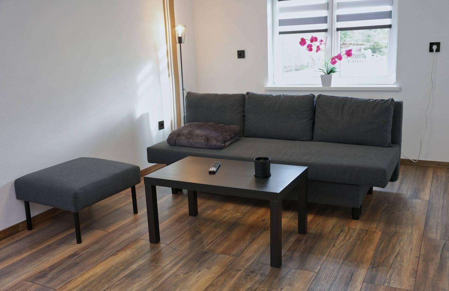 Über den Flur finden Sie ein Wohnzimmer für Ihre Nutzung mit modernem TV. Das Sofa lässt sich bequem als Doppelbett nutzen.