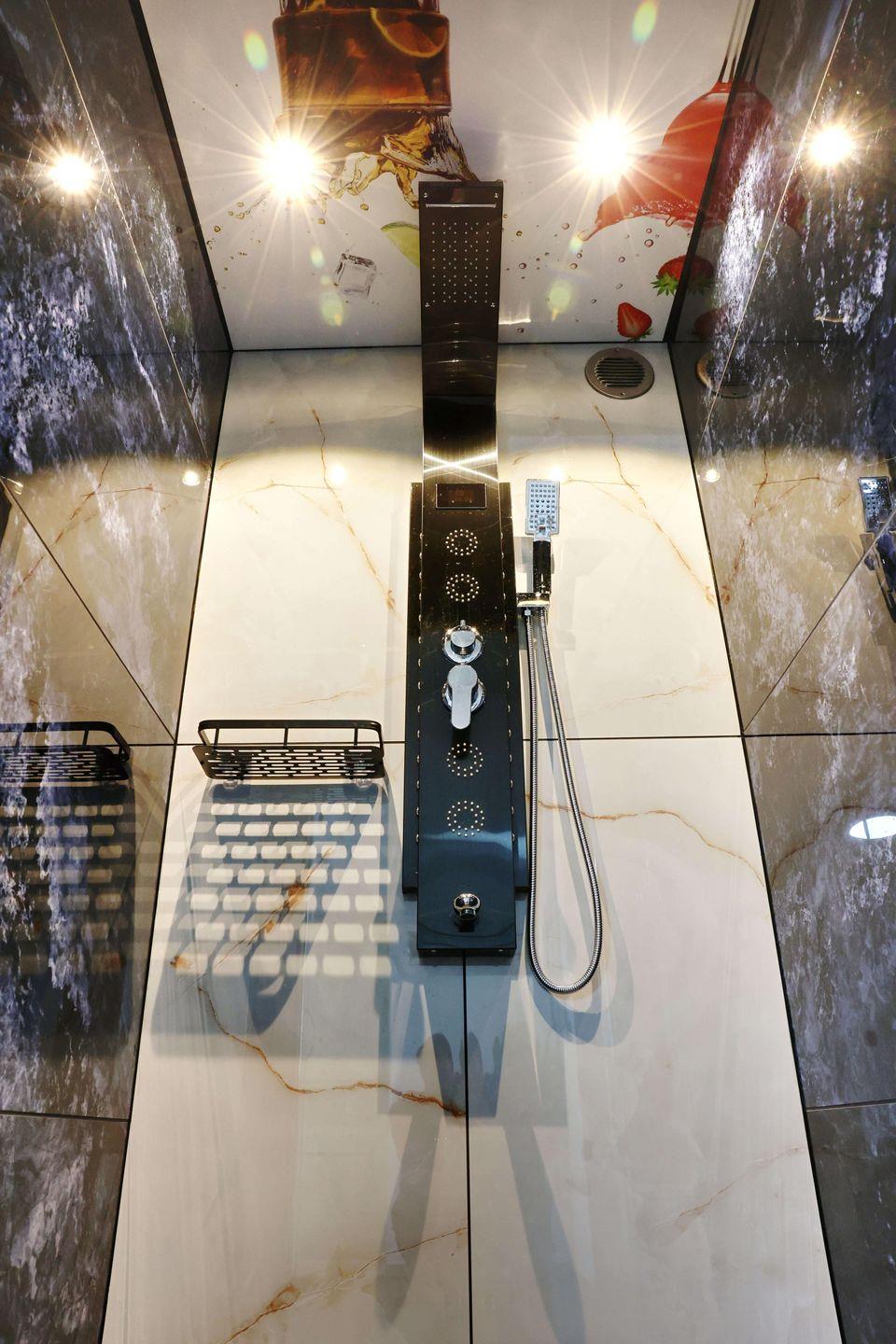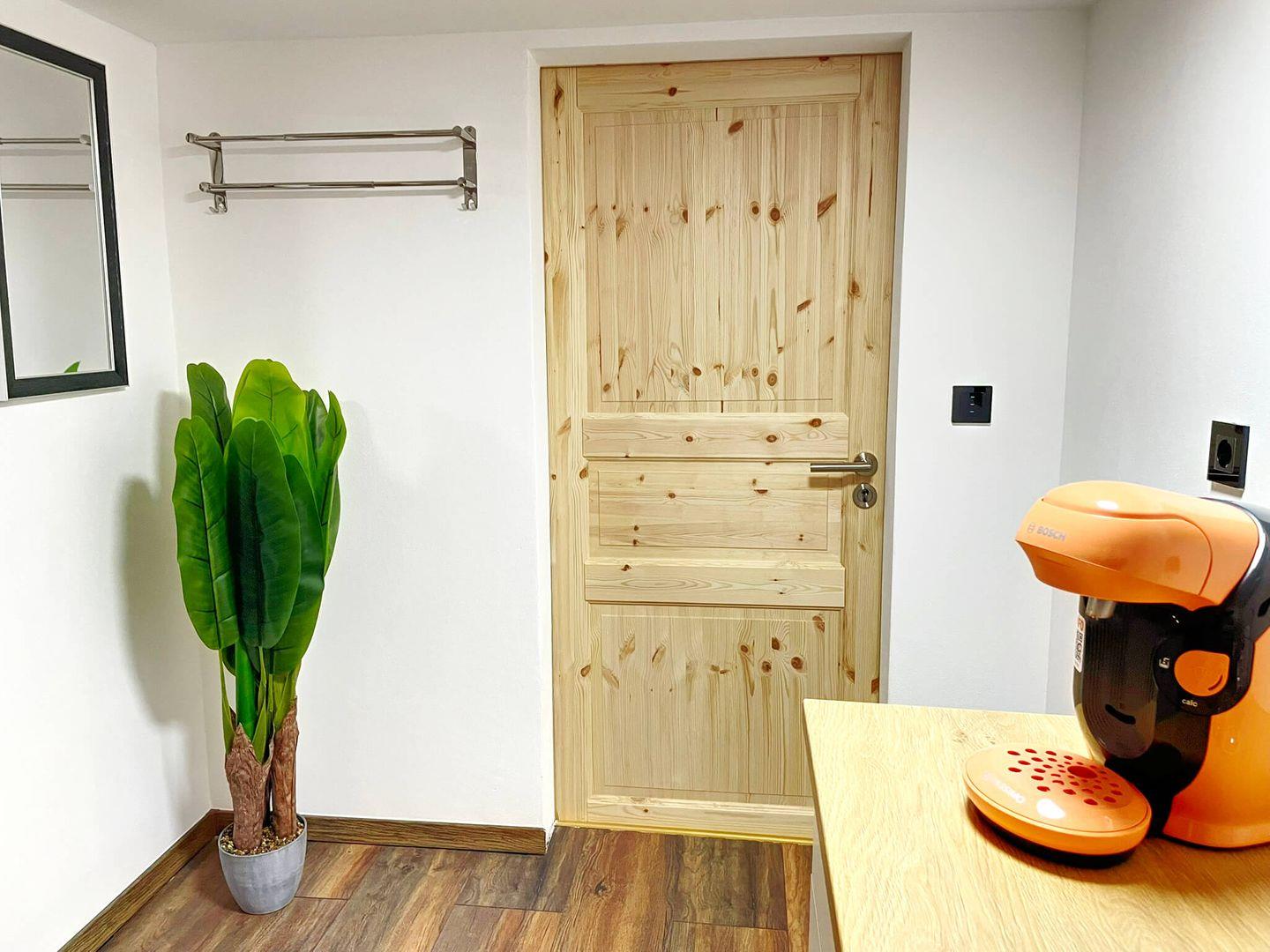 Ihnen steht ein separates Badezimmer mit privater Sauna und Badewanne zur Verfügung, das sich über den Flur befindet. Trotz der räumlichen Trennung steht Ihnen die gesamte Wohnetage zur alleinigen Nutzung bereit, sodass Sie Ihre Privatsphäre in vollen Zügen genießen können.