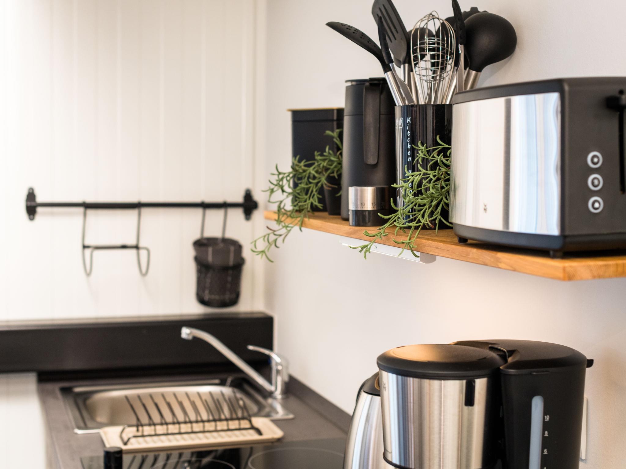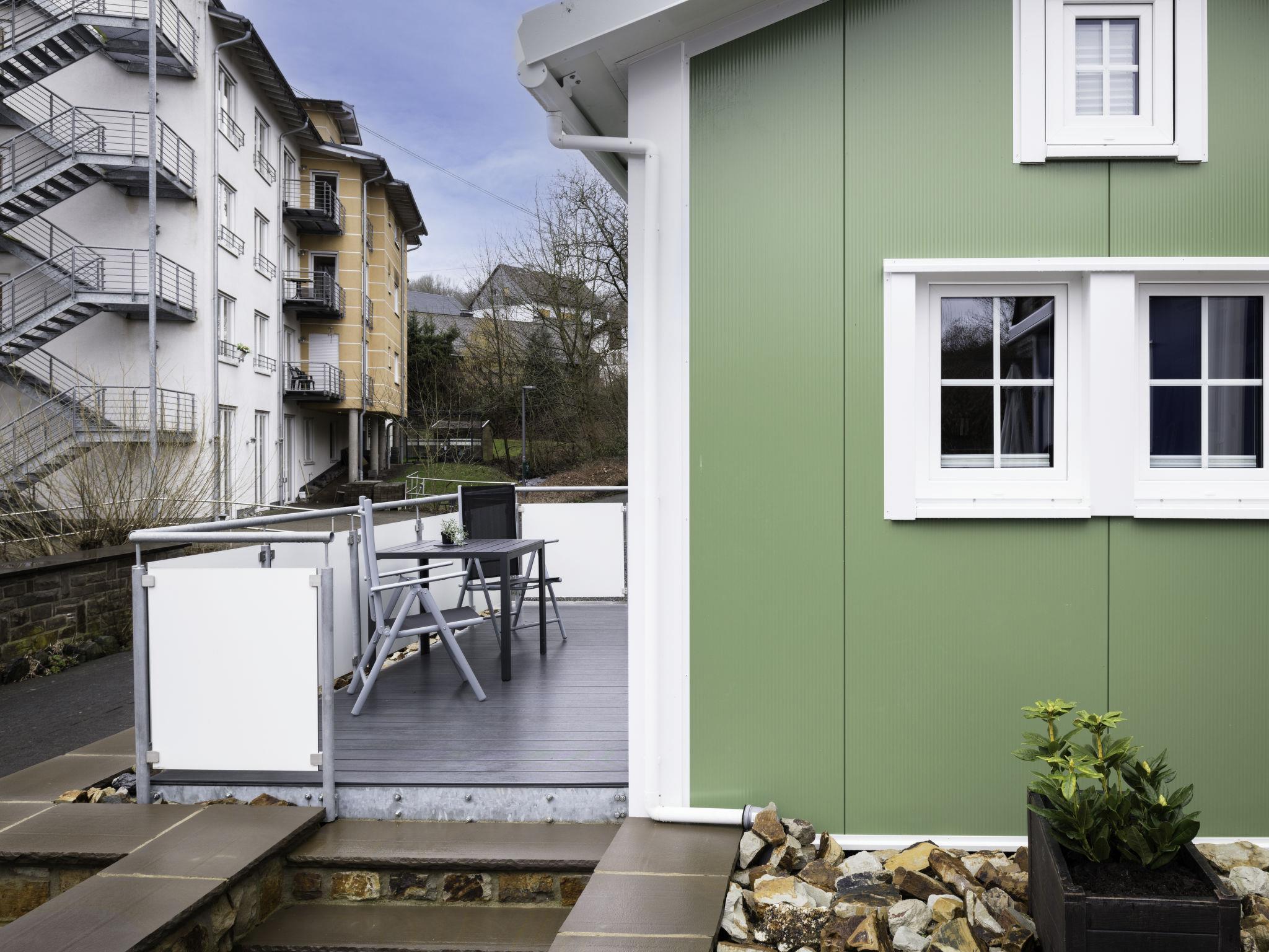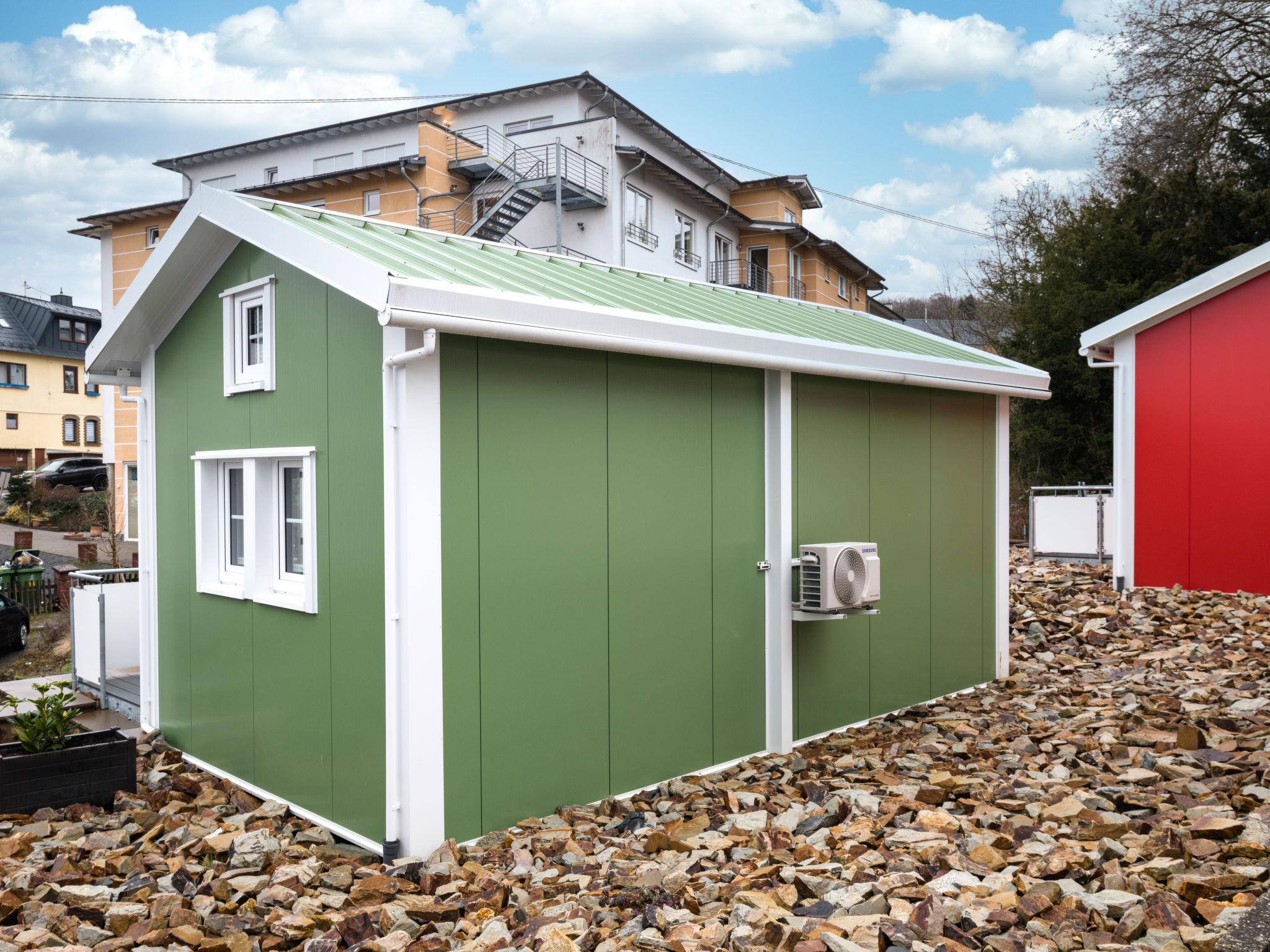 "Tiny Haus Westerwald 16 Green", 1-room house 28 m2. Modern and cosy furnishings: living/dining room, on 2 levels with TV. Exit to the terrace. Open gallery with sloping ceilings, ceiling height 1 - 120 cm, without wardrobe with 1 double bed (160 cm, length 200 cm). Kitchenette (2 ceramic glass hob hotplates, toaster, kettle, electric coffee machine). Shower/WC. Terrace. Terrace furniture. Parking at the house. Please note: non-smoking house. Smoke alarm. Instead of an enclosed bedroom, some sleeping areas are located in an open-plan area (gallery, alcove, etc.).