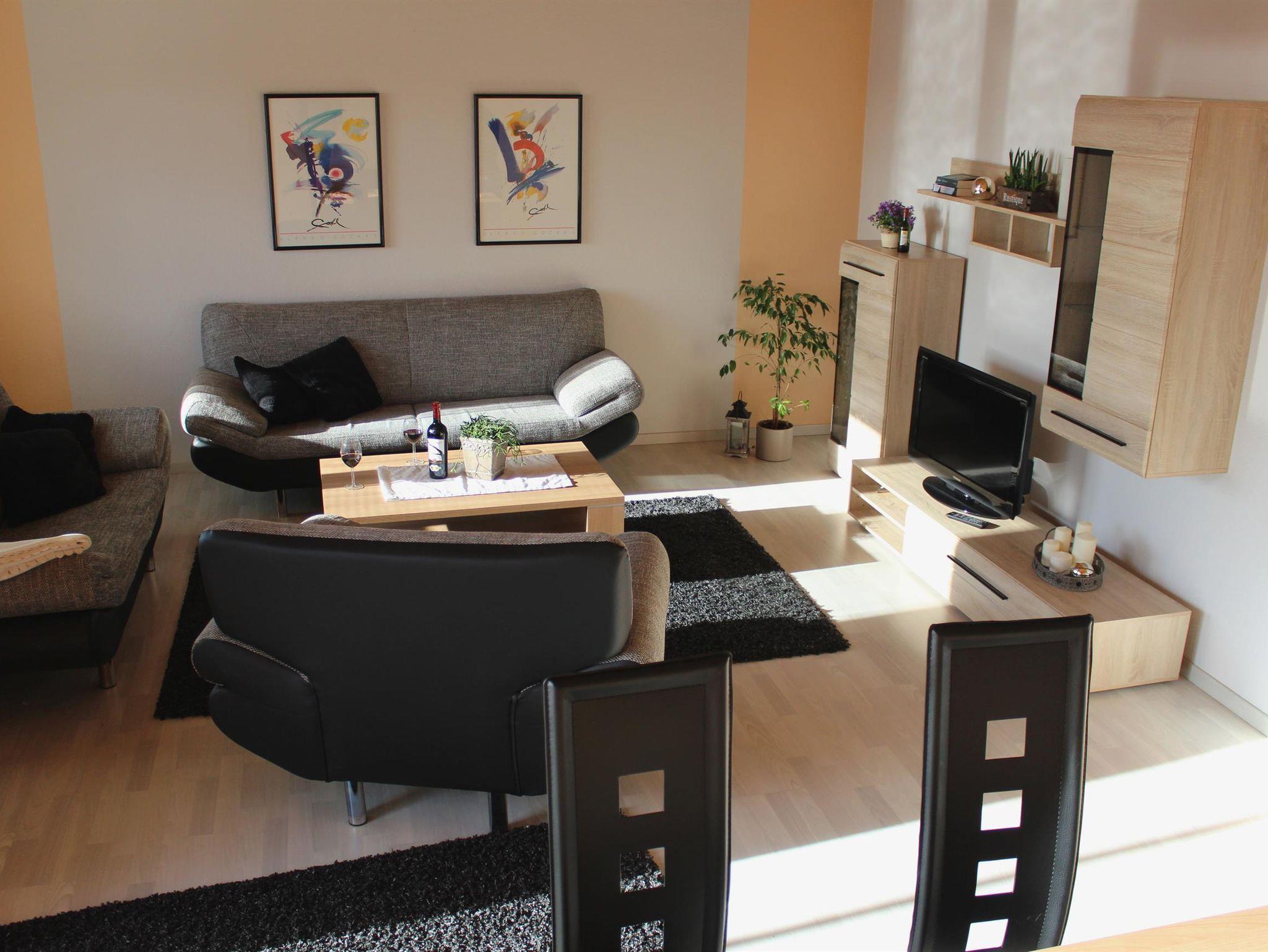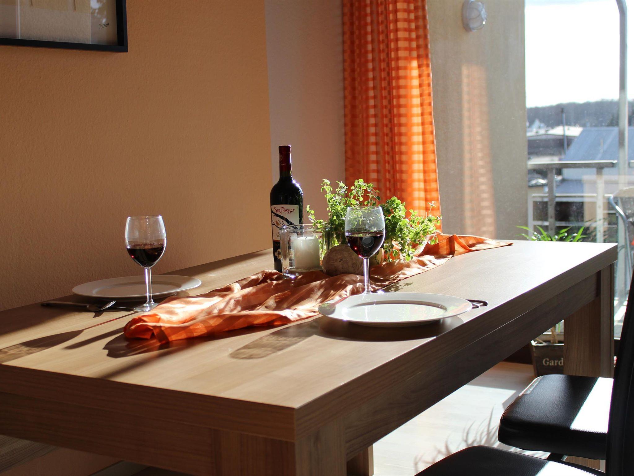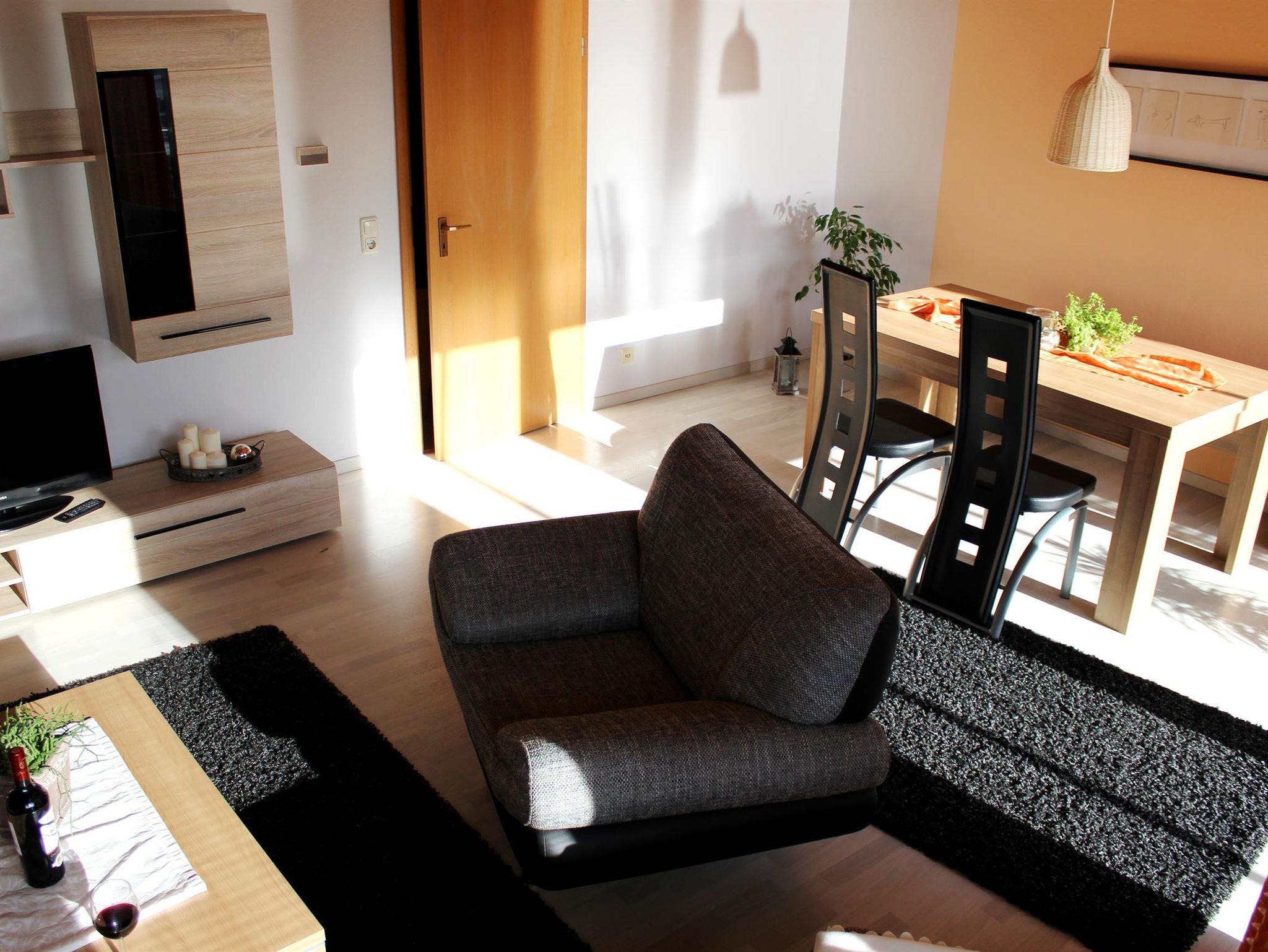Unsere Auszeit bietet Platz für 2 bis 4 Personen. Auf 65 m² erwartet Sie ein modern eingerichtetes Wohn-Esszimmer mit Schlafsofa (Platz für zwei Personen), Flachbildfernseher mit Kabel-TV und großem Essbereich. Von hier aus haben Sie direkten Zugang auf einen Südbalkon mit Tisch und Stühlen.
