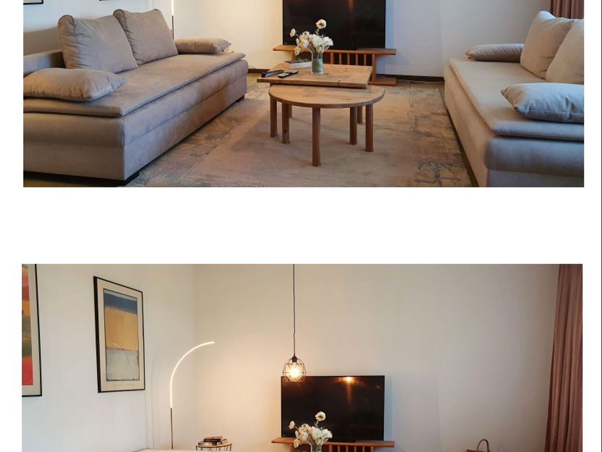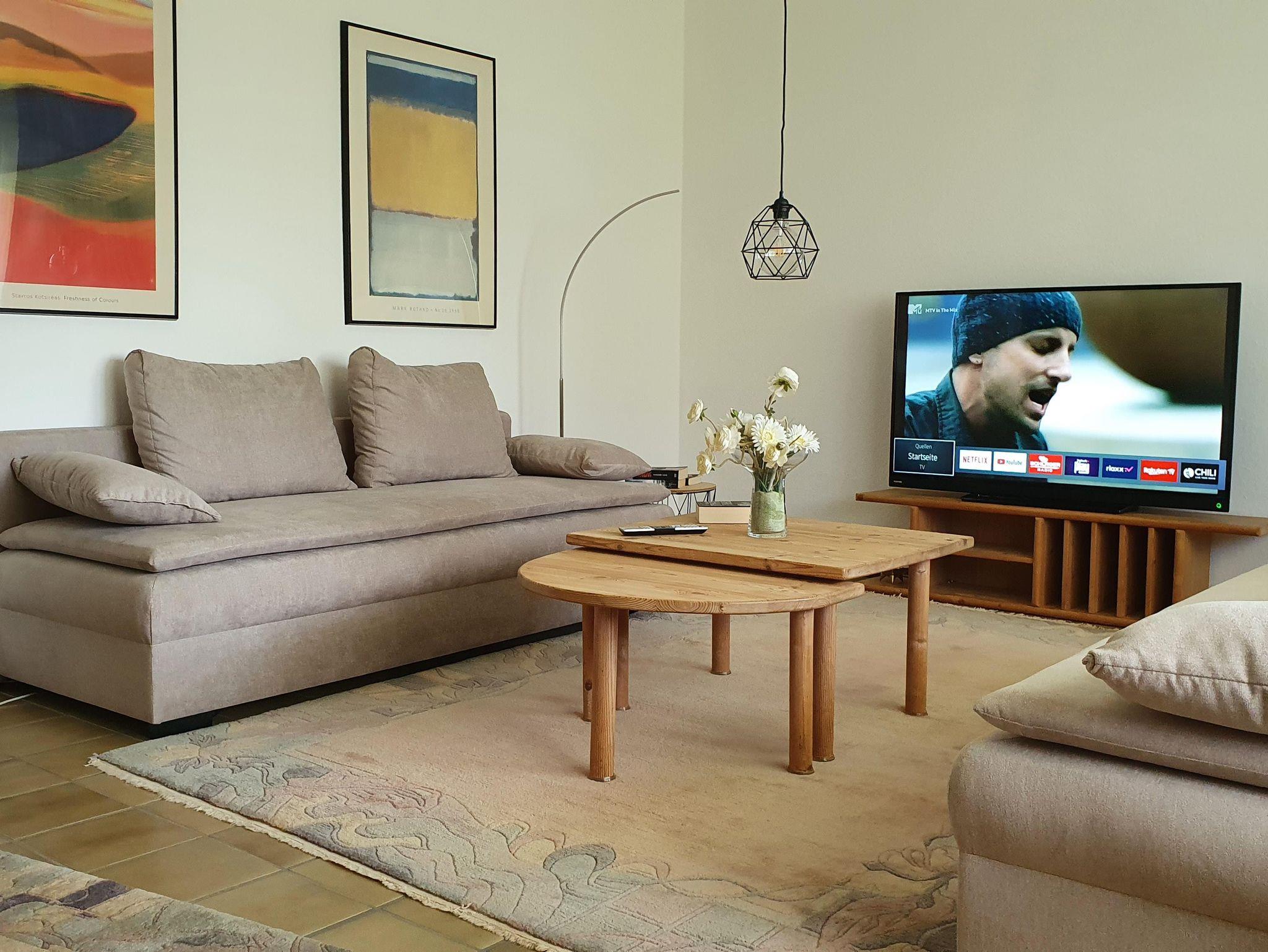 Im großzügigen Wohnzimmer machen Sie es sich auf zwei Sofas bequem,