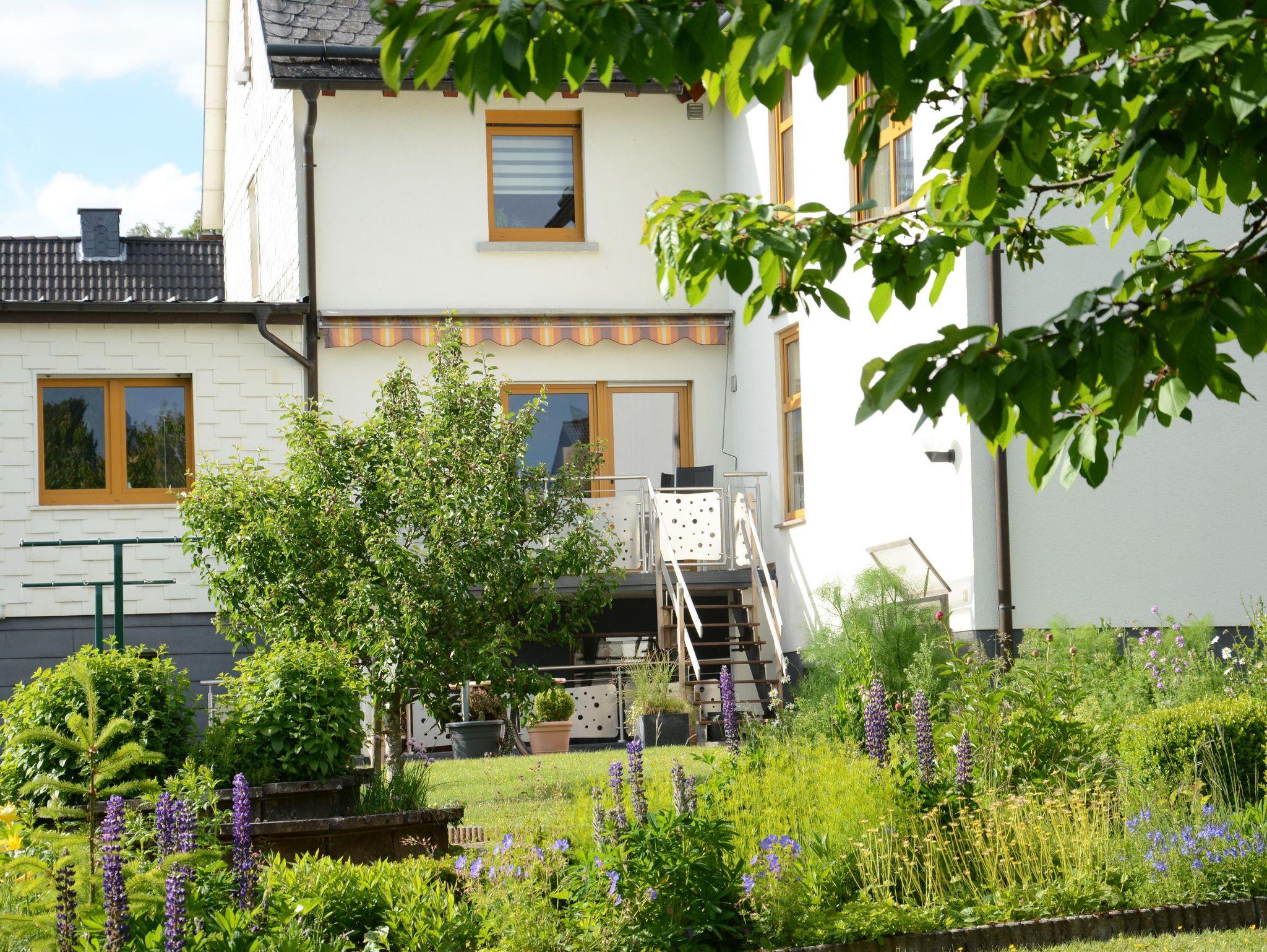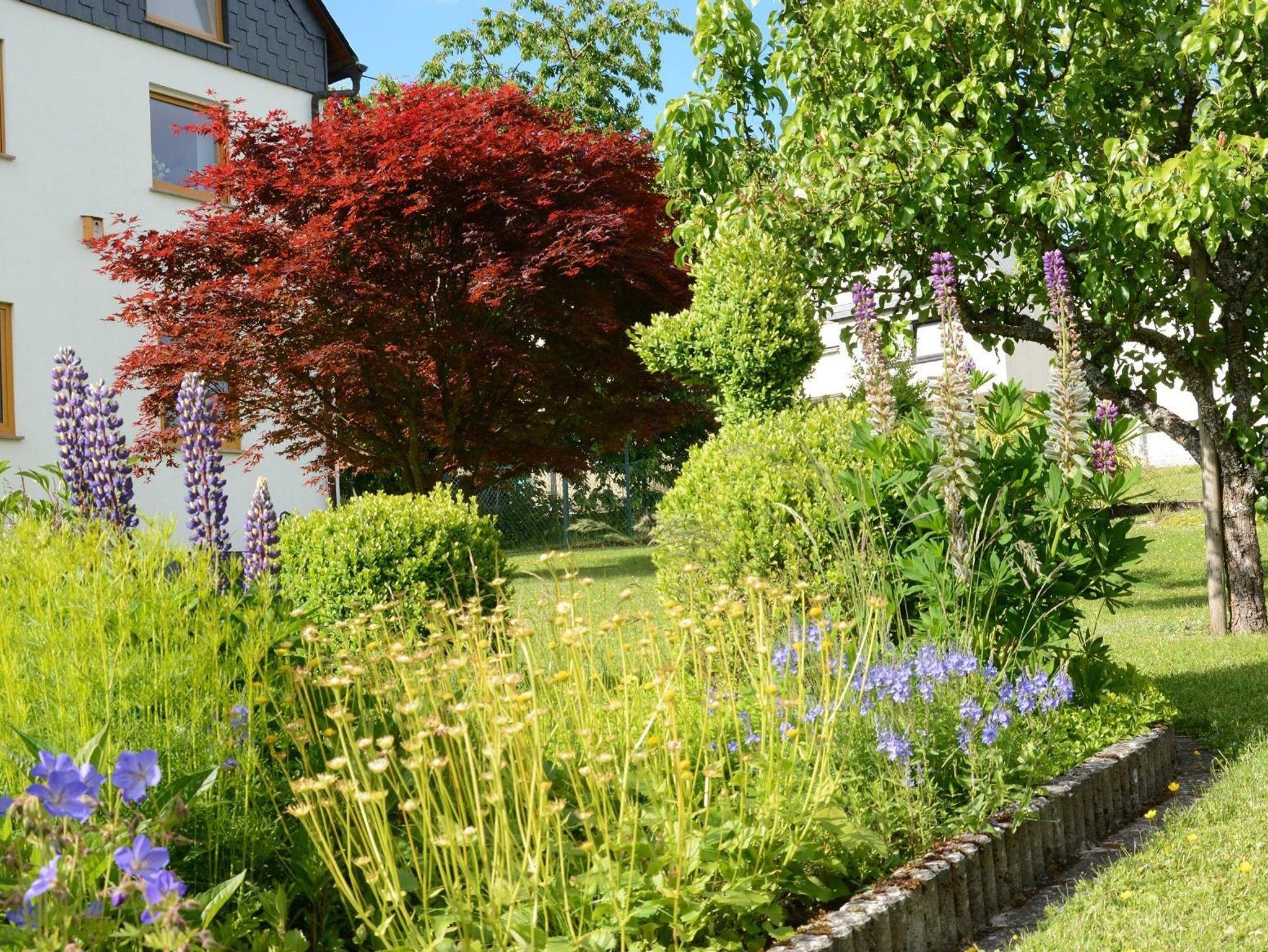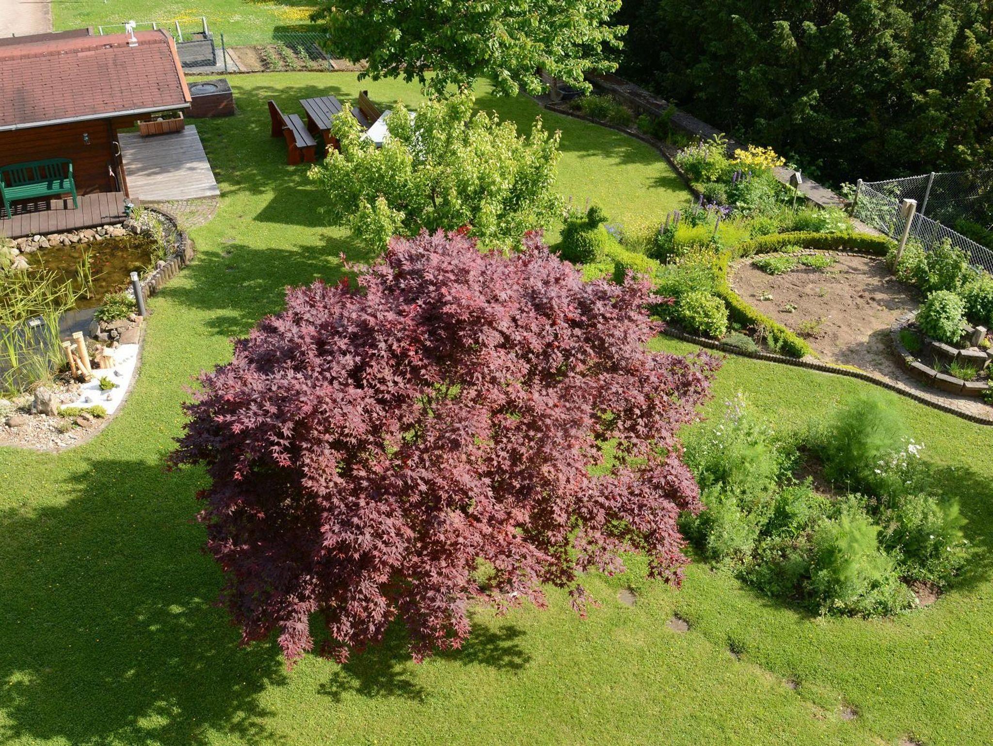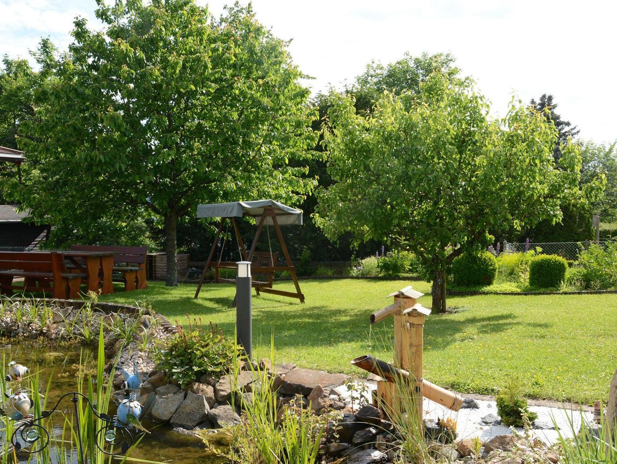 Die Terrasse grenzt an den Gartenbereich. Der Garten verfügt über eine große Liegewiese, mehrere Obstbäume und einen Gartenteich. Ein Gartenhaus mit Terrasse und Gartenbank erlaubt den Blick auf den Teich.