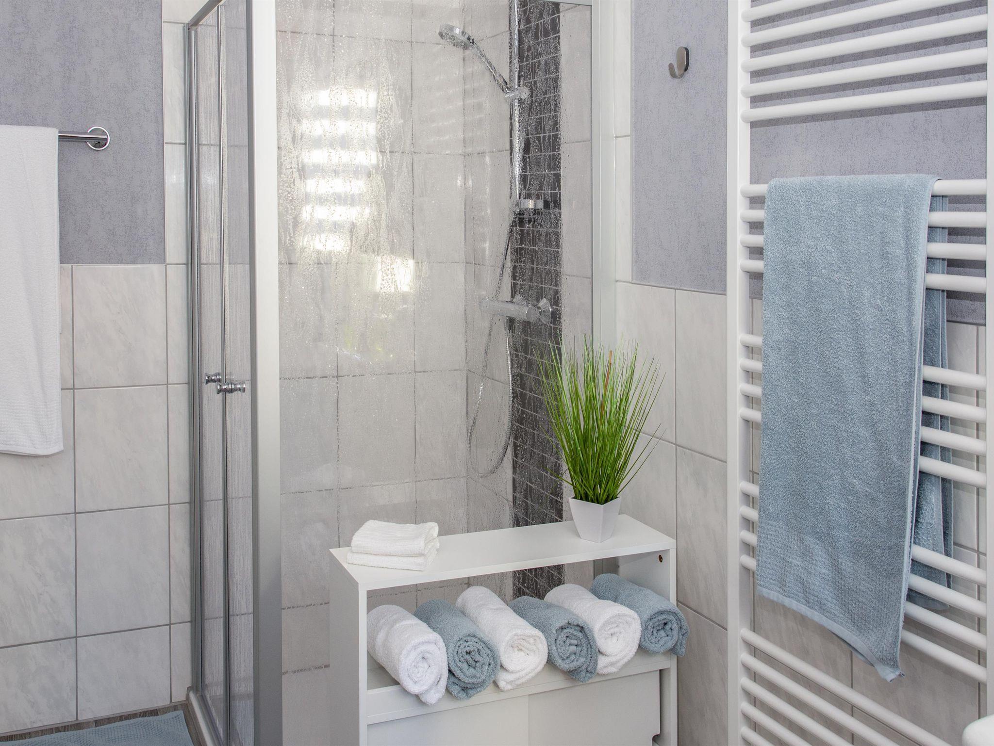 Die Küche besitzt eine Essecke und ist komplett eingerichtet. Im geschmackvoll eingerichteten Wohnzimmer befindet sich ein großer Fernseher, angrenzend gibt es noch ein kleines Lese-/Musikzimmer. Das Badezimmer hat eine Dusche und WC. Die Wohnung ist auf dem neusten Stand der Elektrotechnik mit Netzwerkanschlüssen, Lichtsteuerung über Präsenzmelder und LED-Beleuchtung. Alle relevanten Räume sind mit Rauchwarnmelder ausgestattet.