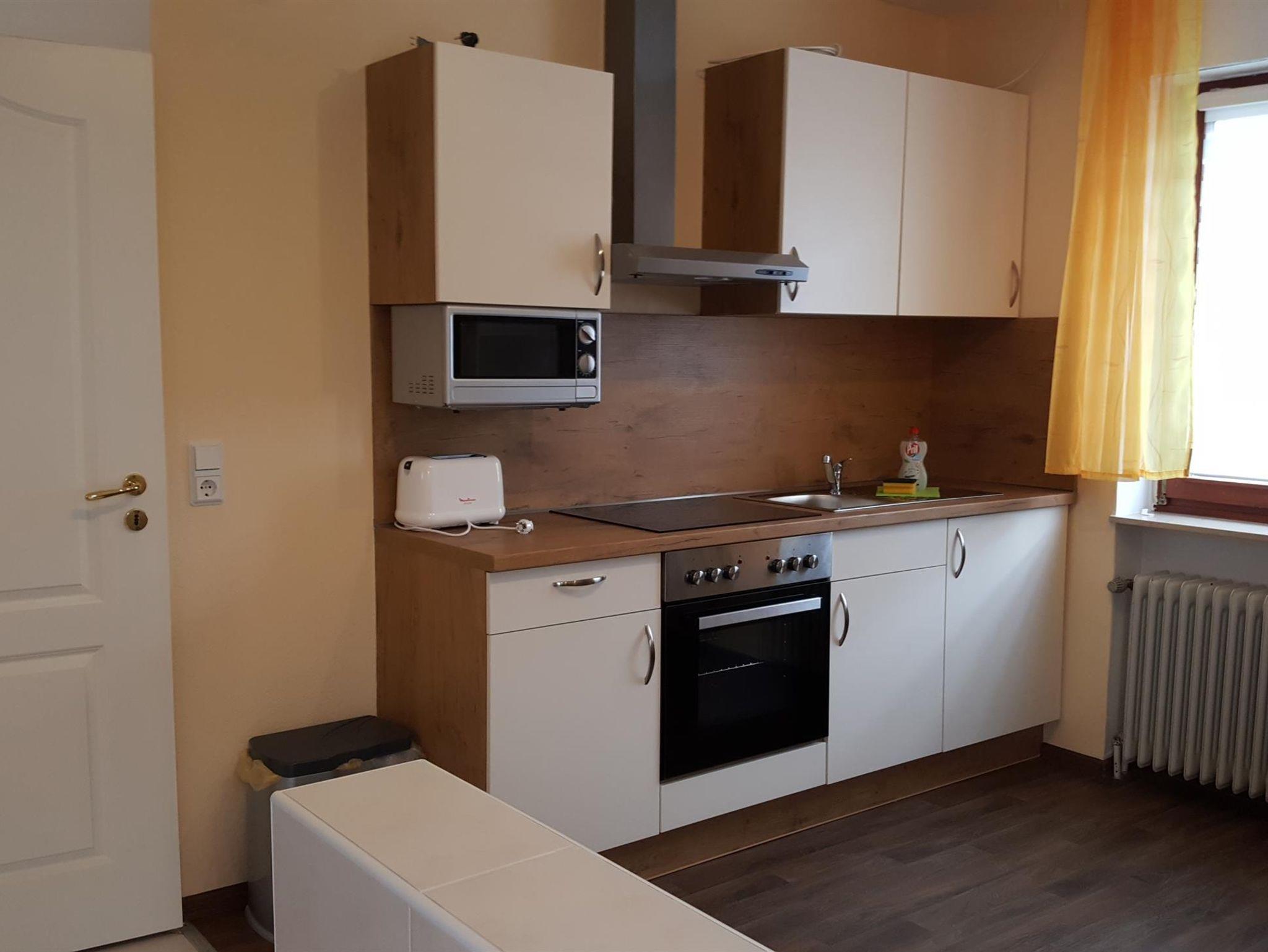 Küche: Einbauküche mit elektrischem Kochfeld, Kühlschrank, Mikrowelle, Kaffeemaschine, Wasserkocher, Toaster, Esstisch für 3 Personen. Kaffee, Tee, Gewürze & Küchenutensilien für die ersten Tage vorhanden.