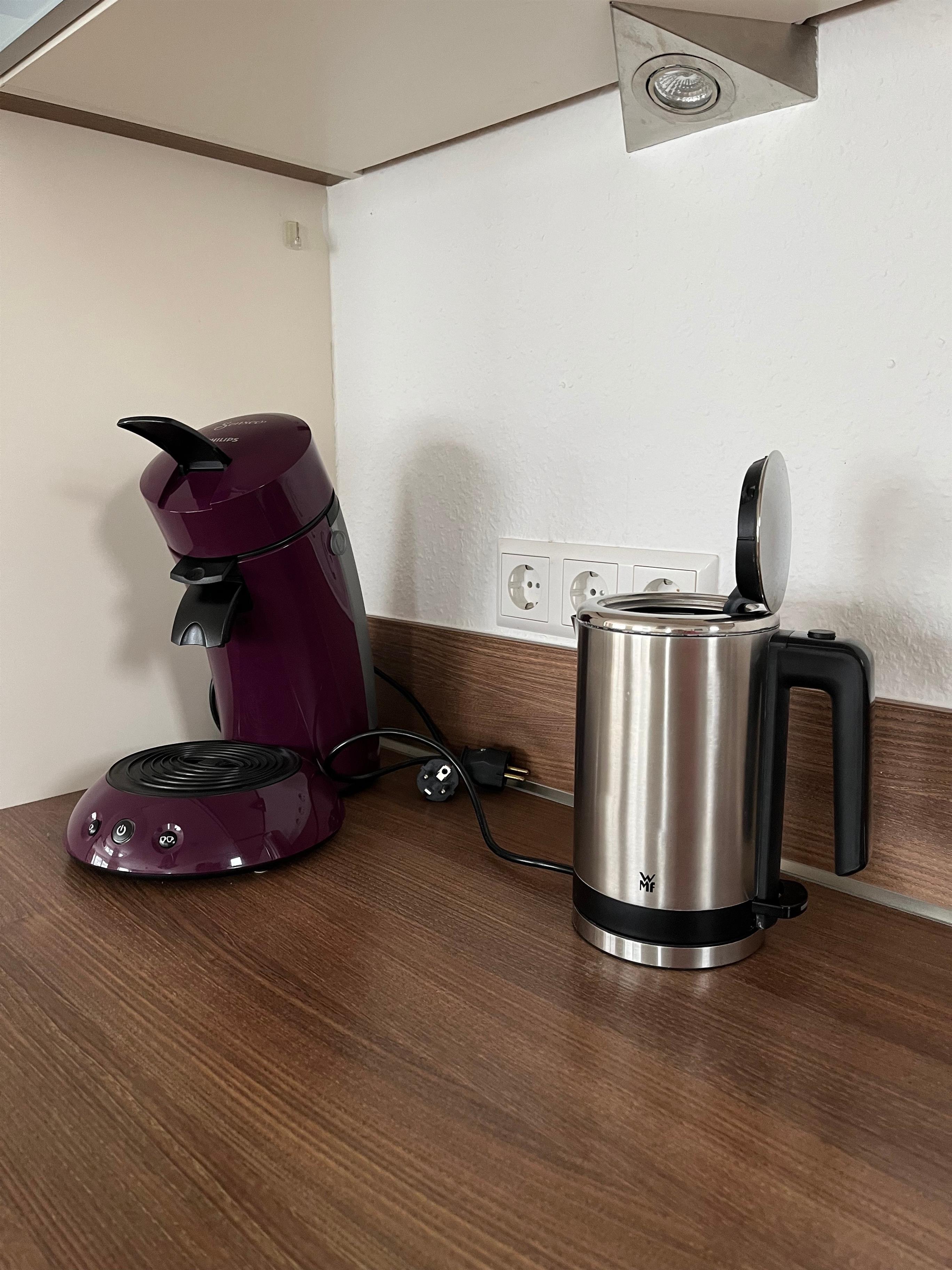 Die Küche ist mit einer Grundausstattung für bis zu 14 Personen sowie inkl. Wasserkocher, Toaster und einer Senseo Padmaschine ausgestattet.