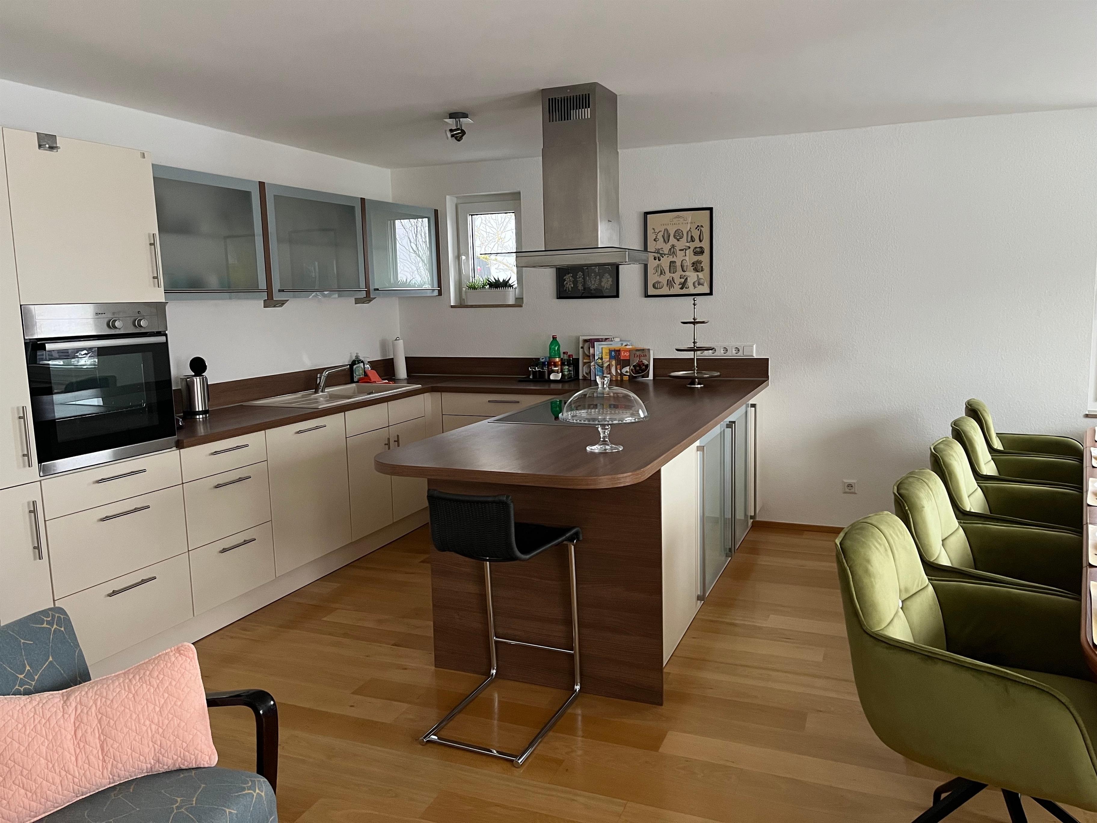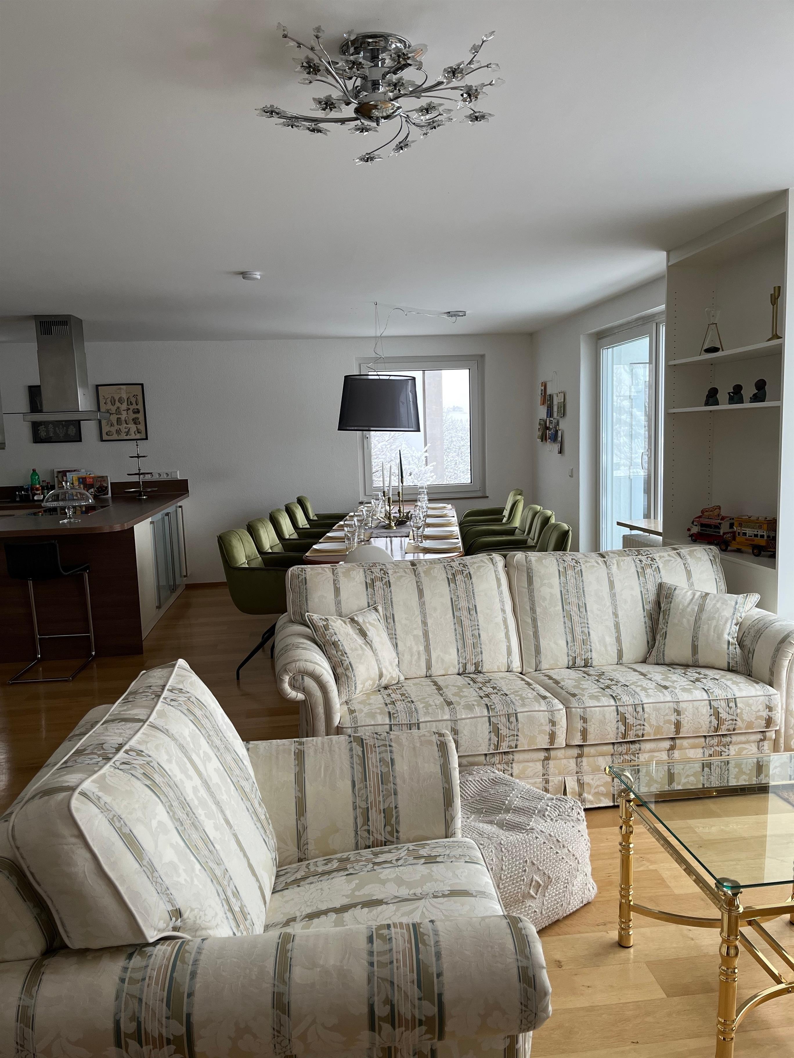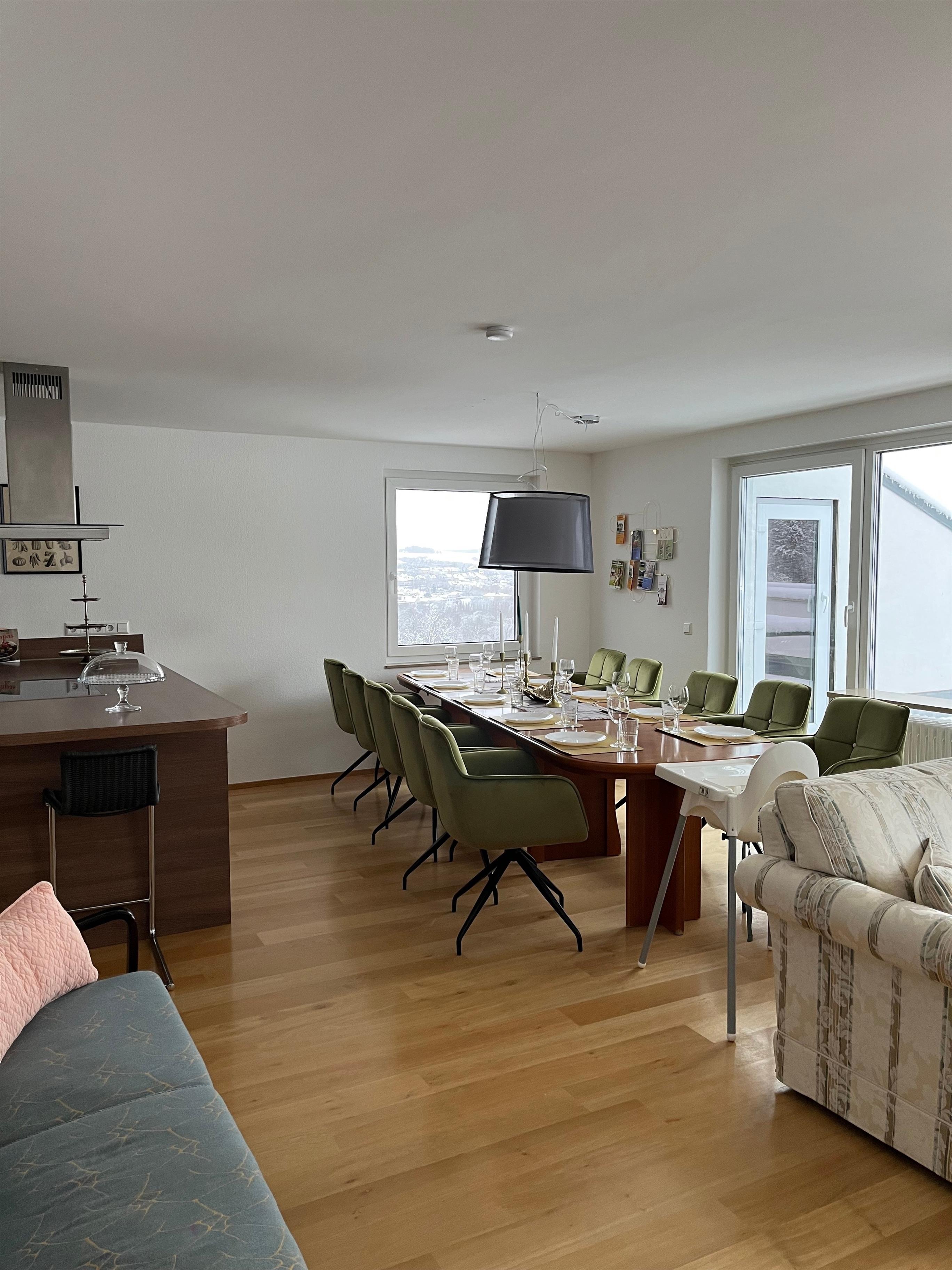 Im Mittelpunkt der lichtdurchfluteten Wohnung befindet sich der große Wohn und Essbereich mit einem sehr großzügigen Esstisch (3,4m lang/ 95cm breit mit Platz für bis zu 14 Personen) an welchem alle gemeinsam entspannt in den Tag starten oder ein tolles Essen genießen können. Den Abend lässt man am besten bei guten Wetter auf der Dachterrasse in der Lounge oder gemütlich im Wohnzimmer ausklingen ;-)