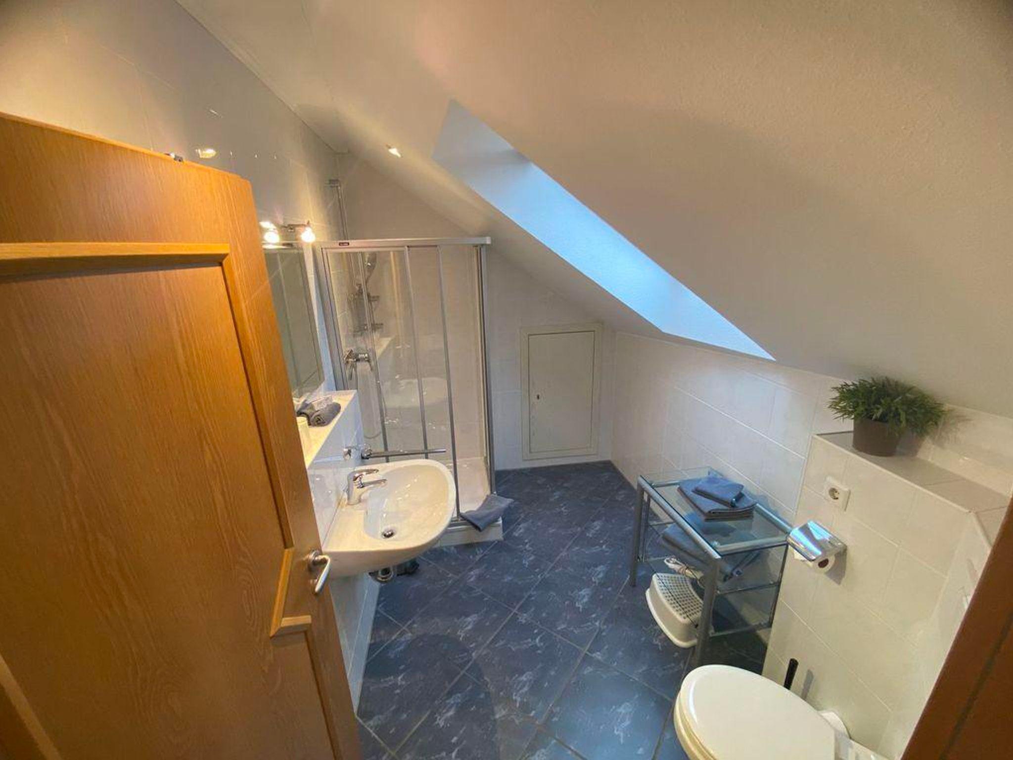 Das Bad mit Dusche und WC rundet den Komfort der Wohnung ab. Familien sind ebenfalls herzlich willkommen: Auf Wunsch stellen wir gerne ein Kinderbett und einen Hochstuhl zur Verfügung.