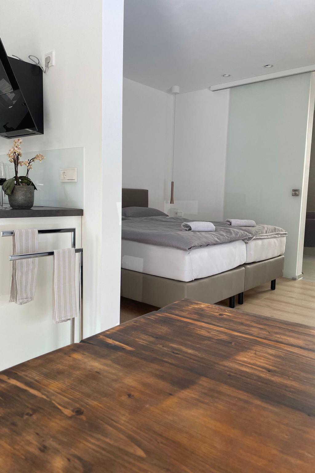 Low-rise building accessible at ground level with 48 square metres of living space. Completion 2023 Floor-to-ceiling windows offer plenty of light and can be darkened with electric blinds. Laminate flooring (allergy-friendly) with underfloor heating, TV (43 inch); wall cupboard with safe, kitchen with dishwasher, fridge including freezer compartment, convection bonnet, fully automatic coffee machine, toaster and kettle. Enjoy a good night's sleep in the cosy box-spring double bed. A pull-out couch is available if required. Fully equipped bathroom with barrier-free accessible rain shower, WC, washbasin and hairdryer. A washing machine and tumble dryer can be used in the flat for an additional charge. Bed linen and towels are included in the price.