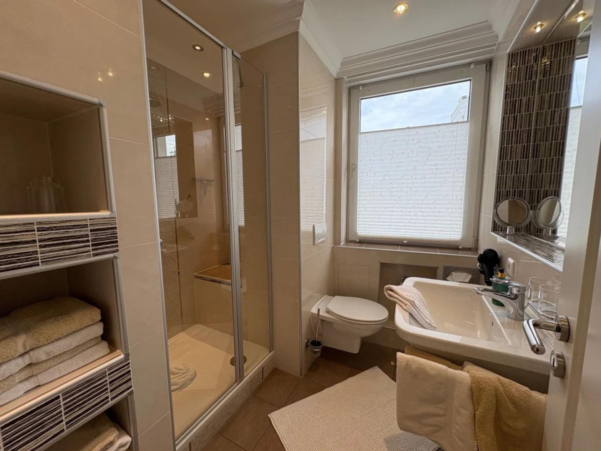 Die Ferienwohnung „Carina“ im Vorderhaus in der 1. Etage bietet auf 75 m² komfortables Wohnen mit direktem Blick auf den Garten. Sie verfügt über zwei Schlafzimmer, eines davon mit einem gemütlichen Doppelbett sowie frischer Bettwäsche und Handtüchern. Das helle Wohnzimmer ist ausgestattet mit Flachbild-TV, Telefon, Kabelanschluss, DVD-Player und Radio, sodass Unterhaltung und Kommunikation jederzeit möglich sind. Die voll ausgestattete Küche bietet Backofen, Mikrowelle, Geschirrspüler und Kaffeemaschine, ideal für die Zubereitung eigener Mahlzeiten. Das Badezimmer verfügt über eine erfrischende Dusche, Handtücher und einen Fön. „Carina“ verbindet stilvolle Einrichtung, moderne Ausstattung und eine ruhige Lage für einen entspannten Aufenthalt in Bad Neuenahr-Ahrweiler.