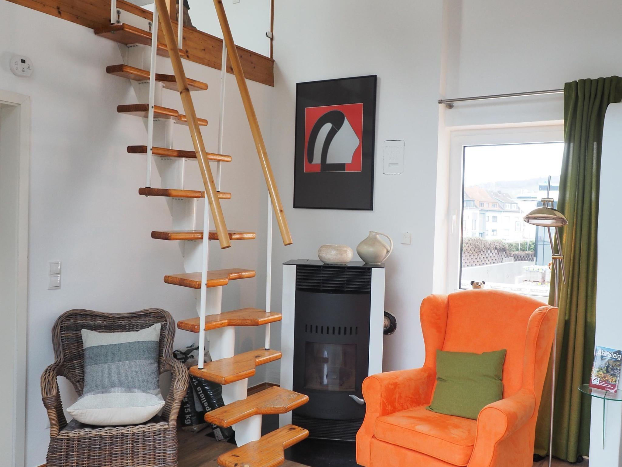 Wohnen überm Atelier ist eine helle und liebevoll eingerichtete Wohnung geeignet für 1-3 Personen.Sie bietet ein geräumiges helles Schlafzimmer mit Boxspring-Doppelbett 180 x 200 cm , Nachttische mit Beleuchtung , Steckdosen am Bett und einem Regal mit einigen gut erhaltenen spannenden Büchern. Über eine steile Treppe erreicht man den Raum mit einen Einzelbett.Die offene Wohnküche ist mit Mikrowelle, Herd mit Ceranfeld und Kühl-Gefrierschrank ausgestattet. Ebenso stehen viele Gewürze, Essig,Öl, Zucker, Süßstoff,Küchentücher und Spülmittel zur Benutzung bereit.Im Tageslicht-Bad befindet sich eine große Dusche , sowie Föhn , Badetücher sowie Besen und Staubsauger. Kabel-TV und freies WiFi sind ebenso vorhanden. Der Balko ist windgeschützt und auf ihm dürfte geraucht werden. Für den Hund stehen Näpfe bereit.