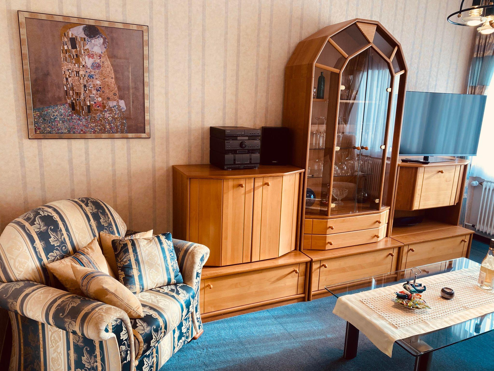 Die Ferienwohnung ist ca. 50 qm groß. Sie verfügt über ein Wohnzimmer mit einem gemütlichen Sofa, einem Fernsehsessel sowie einem Flachbild - TV. Die Küche besteht aus einer Küchenzeile mit Herd und Backofen und einem Kühlschrank mit Gefrierfach. Die gemütliche Sitzecke in der Küche läd zu einem schönen Frühstück ein. Hierfür steht Ihnen eine Kaffeemaschine, ein Toaster sowie ein Wasserkocher zur Verfügung. Das Schlafzimmer ist mit einem Doppelbett ausgestattet, außerdem finden Sie in einem Schrank im Schlafzimmer, sowie im Flur der Wohnung genügend Platz für Ihre mitgebrachten Sachen. Das Bad ist mit Dusche sowie Fön und Spiegelschrank bestückt. Handtücher, Bettwäsche und Spültücher werden selbstverständlich von uns zur Verfügung gestellt.