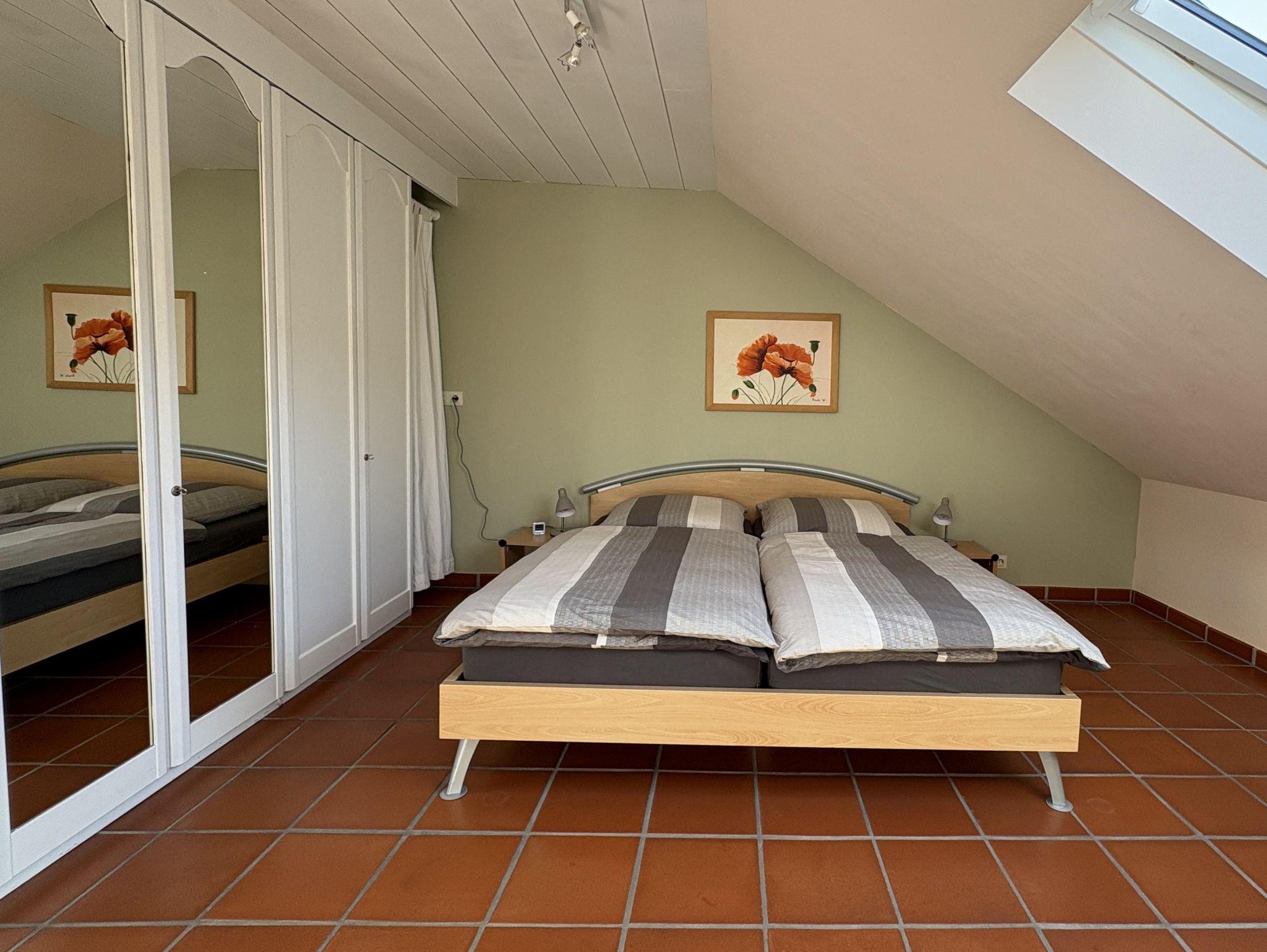 Das separate Schlafzimmer verspricht mit einem komfortablen Doppelbett (1,80 x 2,00 m) erholsame Nächte. Das moderne Badezimmer ist mit einer Dusche ausgestattet und rundet das stimmige Gesamtbild dieser charmanten Dachwohnung ab.