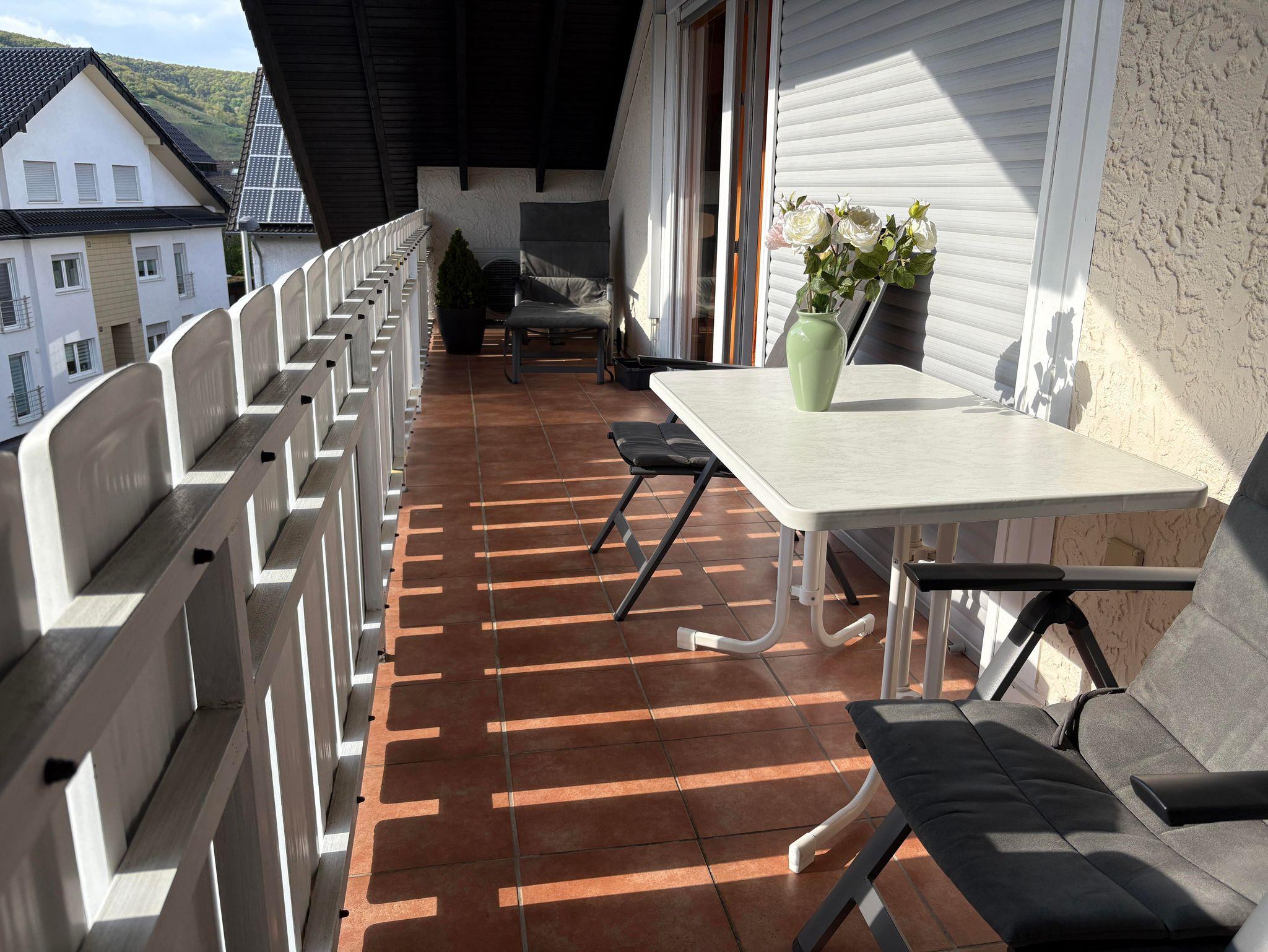 Ein Highlight ist der sonnige Balkon: Genießen Sie hier entspannte Stunden an der frischen Luft – mit einem Tisch, zwei Hochstühlen, einer bequemen Sonnenliege und einem praktischen Wäschegestell für längere Aufenthalte.
