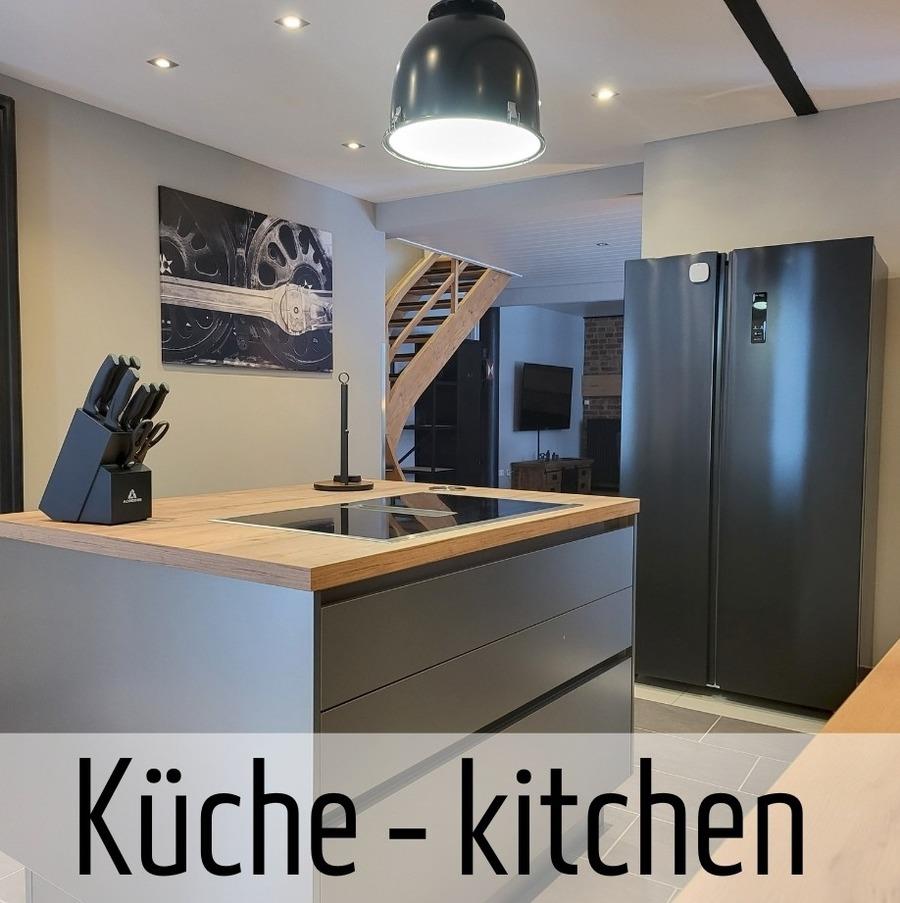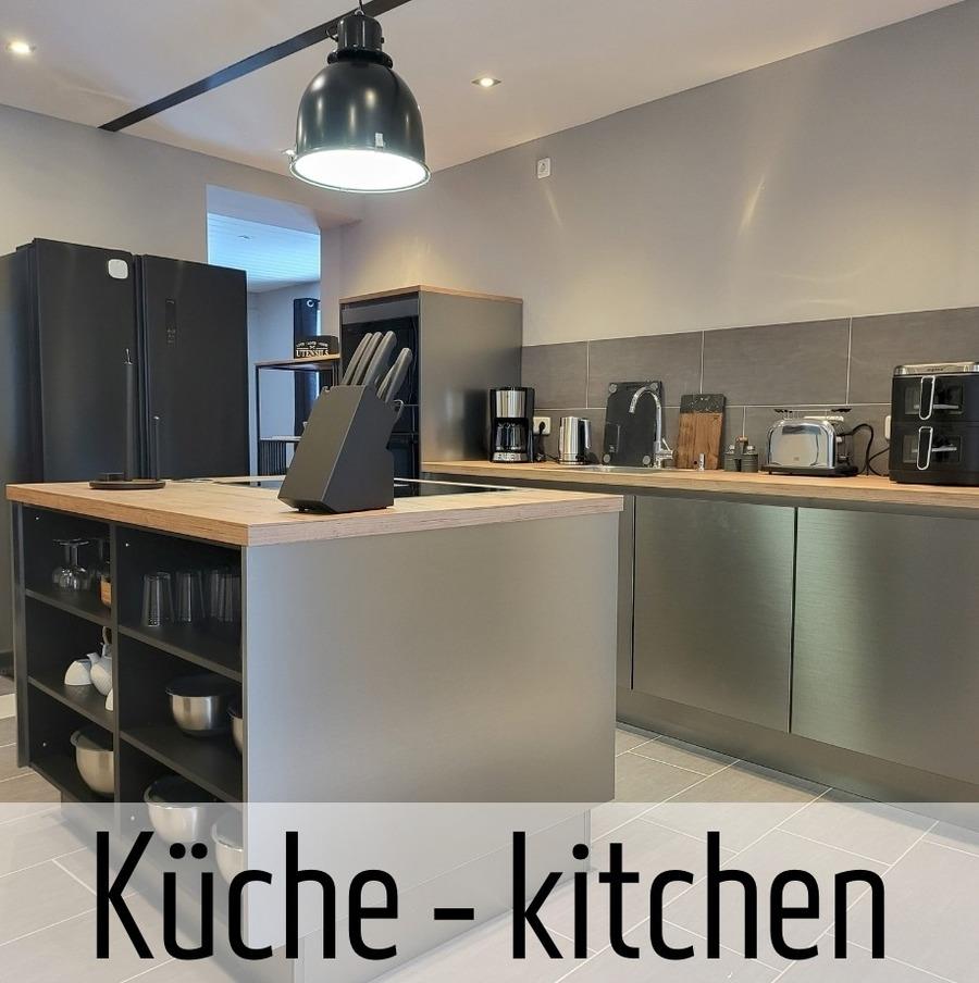 Ein besonderes Highlight ist die offene Edelstahl Küche mit Kochinsel. Die Küche ist vollausgestattetet mit Mikrowelle, Geschirrspüler, Kaffeemaschine, Heißluftfriteuse, Toaster und Wasserkocher.