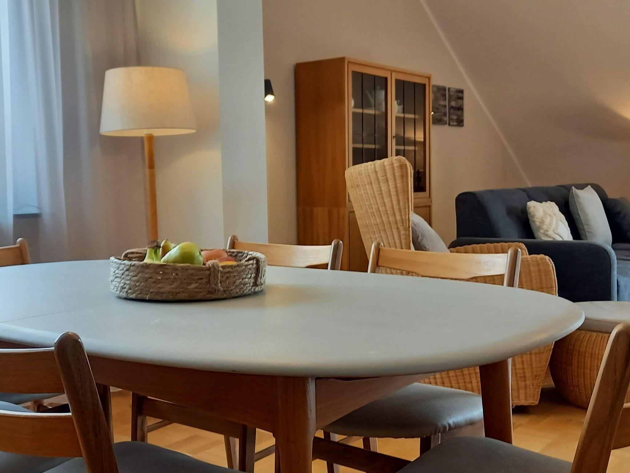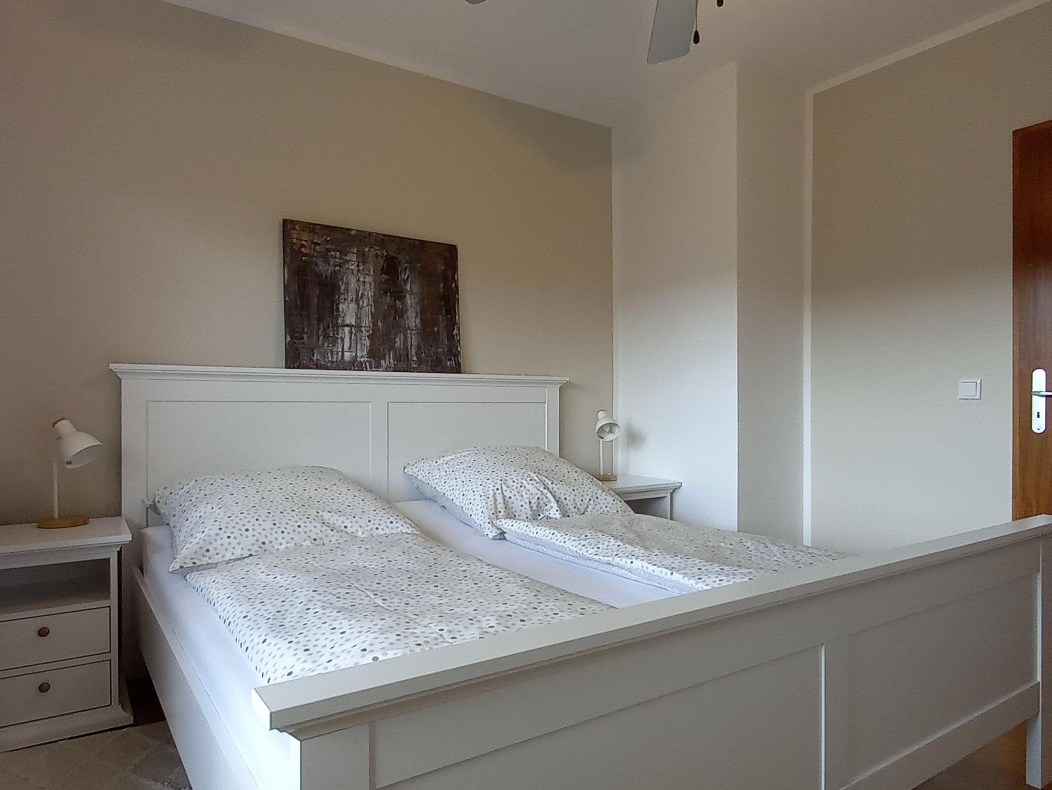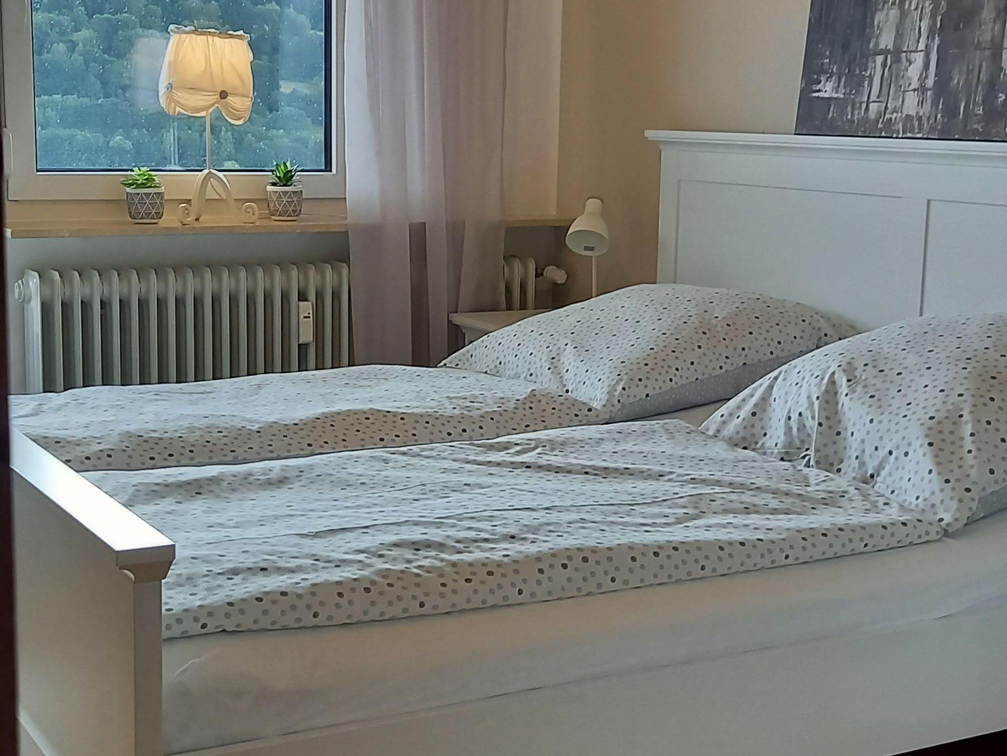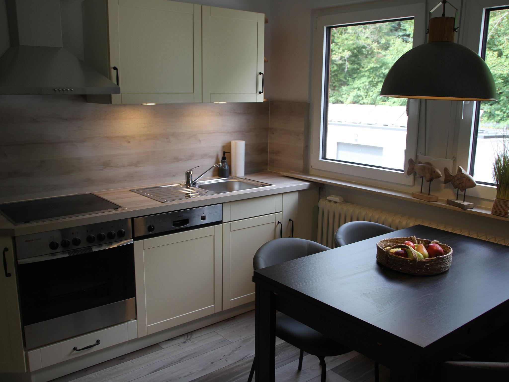 Die Ferienwohnung besteht aus einer vollständig eingerichteten Küche mit Cerankochfeld (4 Platten), Backofen, Dunstabzugshaube, Mikrowelle, Geschirrspüler, Kaffeemaschine (Senseo), Wasserkocher, Toaster sowie Kühlschrank mit Gefrierfach u.v.m, ein Esszimmer mit Durchbruch zum Wohnzimmer, einem separaten Schlafzimmer mit einem Doppelbett (180x200 cm) und Kleiderschrank, einem geräumigen Flur sowie Balkon mit herrlichem Ausblick. Tee, einige Kaffeepats, Dosenmilch und eine Flasche Wasser stehen für Sie bereit. Die Wohnung ist 66 qm groß und bietet viel Platz für max. 3 Erwachsene oder 2 Erwachsene mit max. 2 Kindern. Im Wohnzimmer befindet sich eine ausziehbare Couch (130x200 cm). Ein Kinderreisebett kann bei Bedarf ebenfalls aufgestellt werden. Im Preis enthalten sind Bettwäsche, Handtücher, 2 Bademäntel sowie Wäsche für die Küche. Kostenfreies Wlan ist ebenfalls vorhanden. Ihr Fahrzeug kann im Hof (je nach Größe, bei Buchung bitte nachfragen) kostenfrei geparkt werden. Das Badezimmer besteht aus Dusche, WC und Waschtisch inklusive Fön. Das Rauchen in der Wohnung ist nicht gestattet.