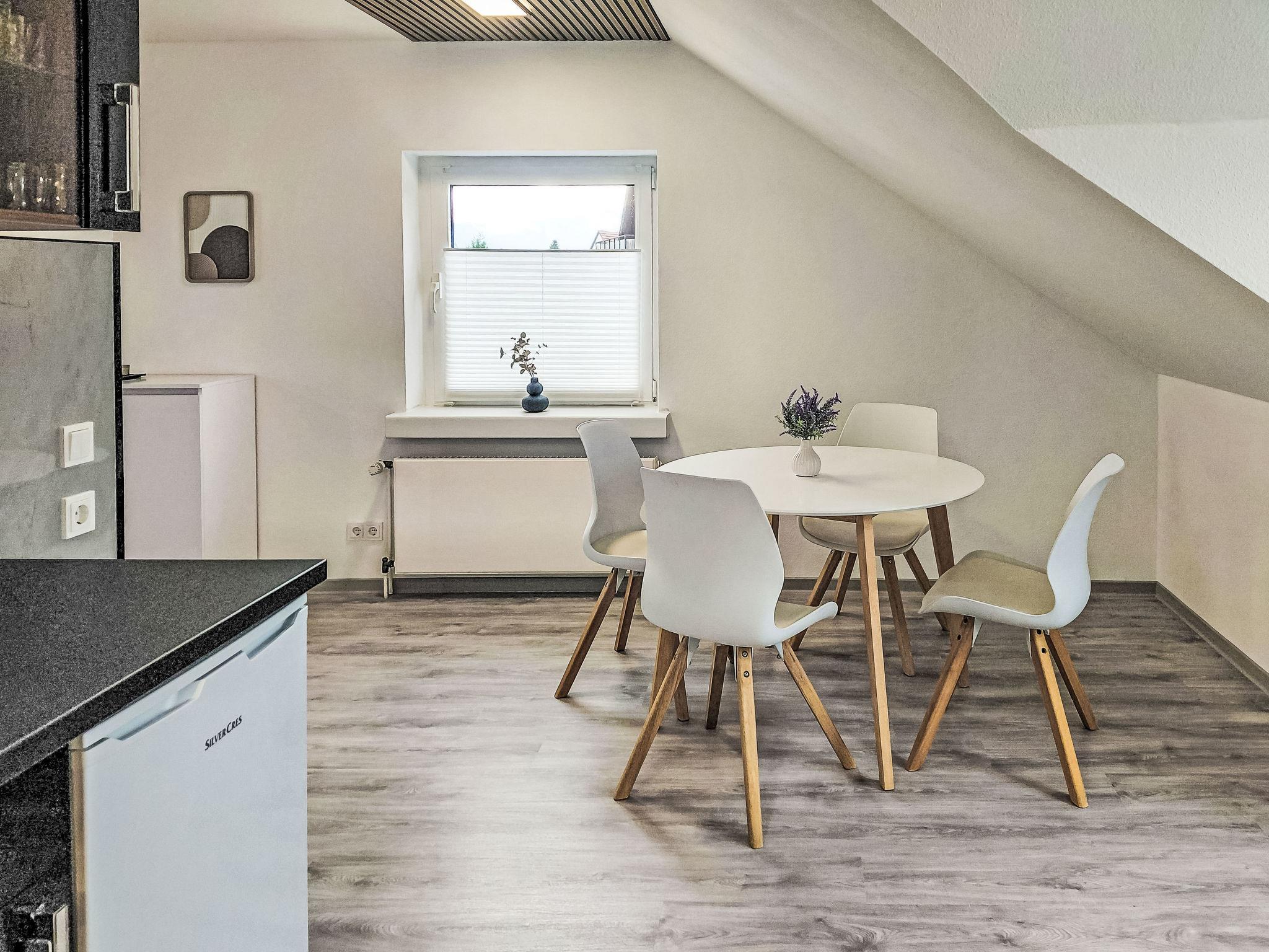 "Sonnenschein", 2-room apartment 80 m2, on the top floor. With sloping ceilings, renovated in 2025, practical and modern furnishings: living/sleeping room with 1 sofabed (110 cm, length 200 cm), dining table and cable TV (flat screen). 1 room with 1 double bed. Open kitchen (oven, dishwasher, 4 ceramic glass hob hotplates, toaster, kettle, microwave, freezer, electric coffee machine). Shower/WC. Gas heating. Facilities: washing machine, children's high chair, baby cot, hair dryer. Internet (WiFi, free). Please note: non-smokers only. Smoke alarm, fire extinguisher.