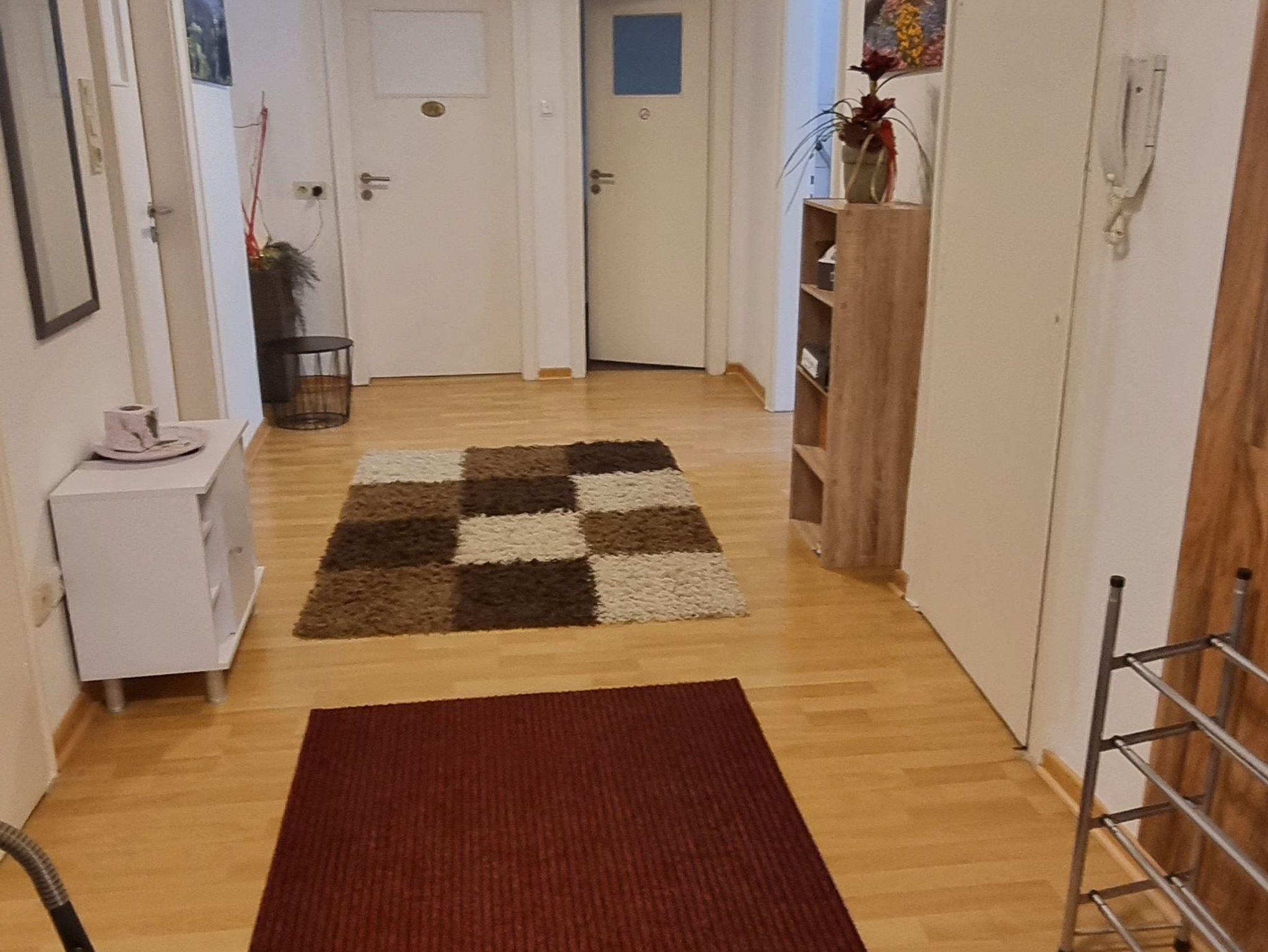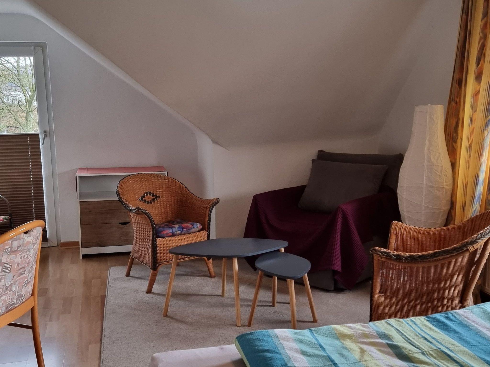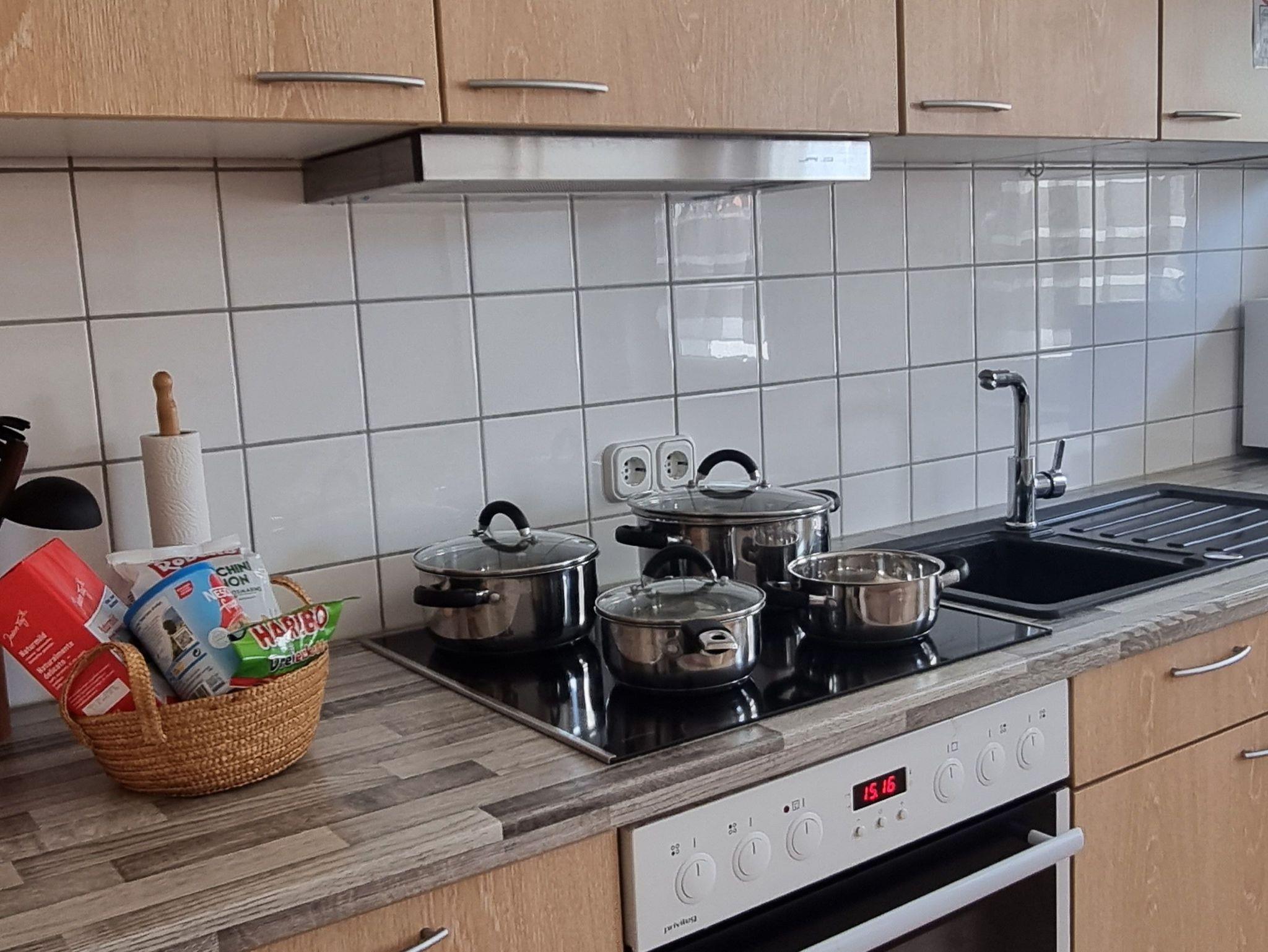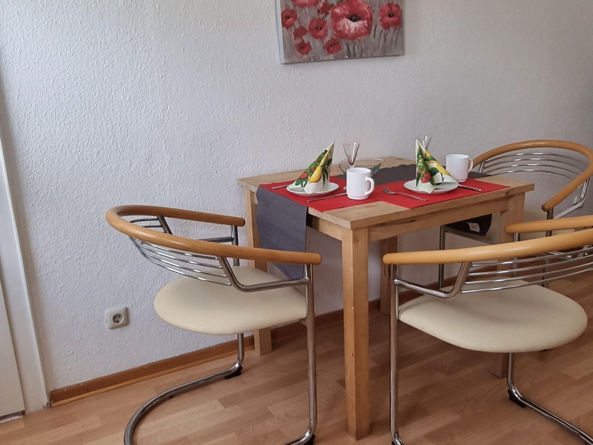 Im Esszimmer befindet sich eine Küche mit Kühlschrank, 4 Platten-Herd, Backofen, Mikrowelle, Geschirrspülmaschine und eine Waschmaschine. Spüle, Wasserkocher und Kaffeemaschine. ebenfalls ein KüchenhandtücherSet. Angrenzend ein Abstellraum. mit Müllsortierungscontainer, diverse Putzutensilien, ein Bügelbrett, Bügeleisen, Wäscheständer, Müllplan und ein Küchenfeuerlöscher. Ein Essbereich bietet Platz für 3 bis 4 Personen. erwähnen möchte wir, das Einkaufsmöglichkeiten fussläufig in der Umgebung, entlang der Schillerstrasse vorhanden sind.