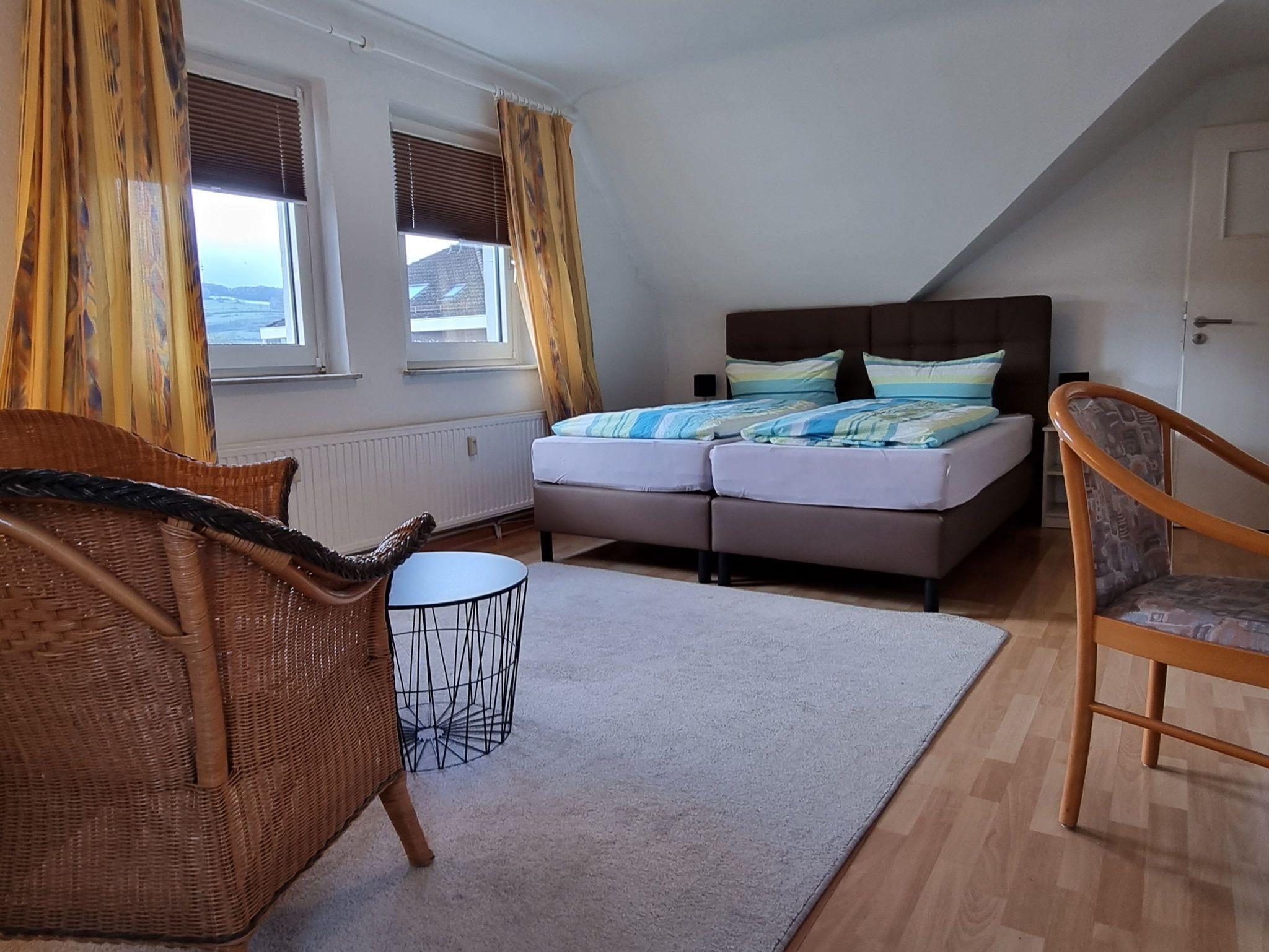 Ausgestattet ist dieses Gäste-Appartment mit zwei Schlafräumen- einem Einzelzimmer ( Einzelbett) und einem Doppelzimmer (Doppelbett auch trennbar als TWIN-Bett), voll ausgestattet wie Hotelzimmer, mit Schreibtisch, Sitzgruppe, TV, Zugang zum gemeinsamen kleinem Balkon mit Blick auf die Stadtmitte und der Kurparkanlage.. Eine Aufbettung für 3te Personen, z.b. Kinder ist mit den vorhandenen Schlafsessel (da aufklappbar) mit einer Größe bis zu 1,70 m möglich. Ein Klappbett (2,00 m Größe) auf Anfrage! Babybettchen sind nicht vorhanden.