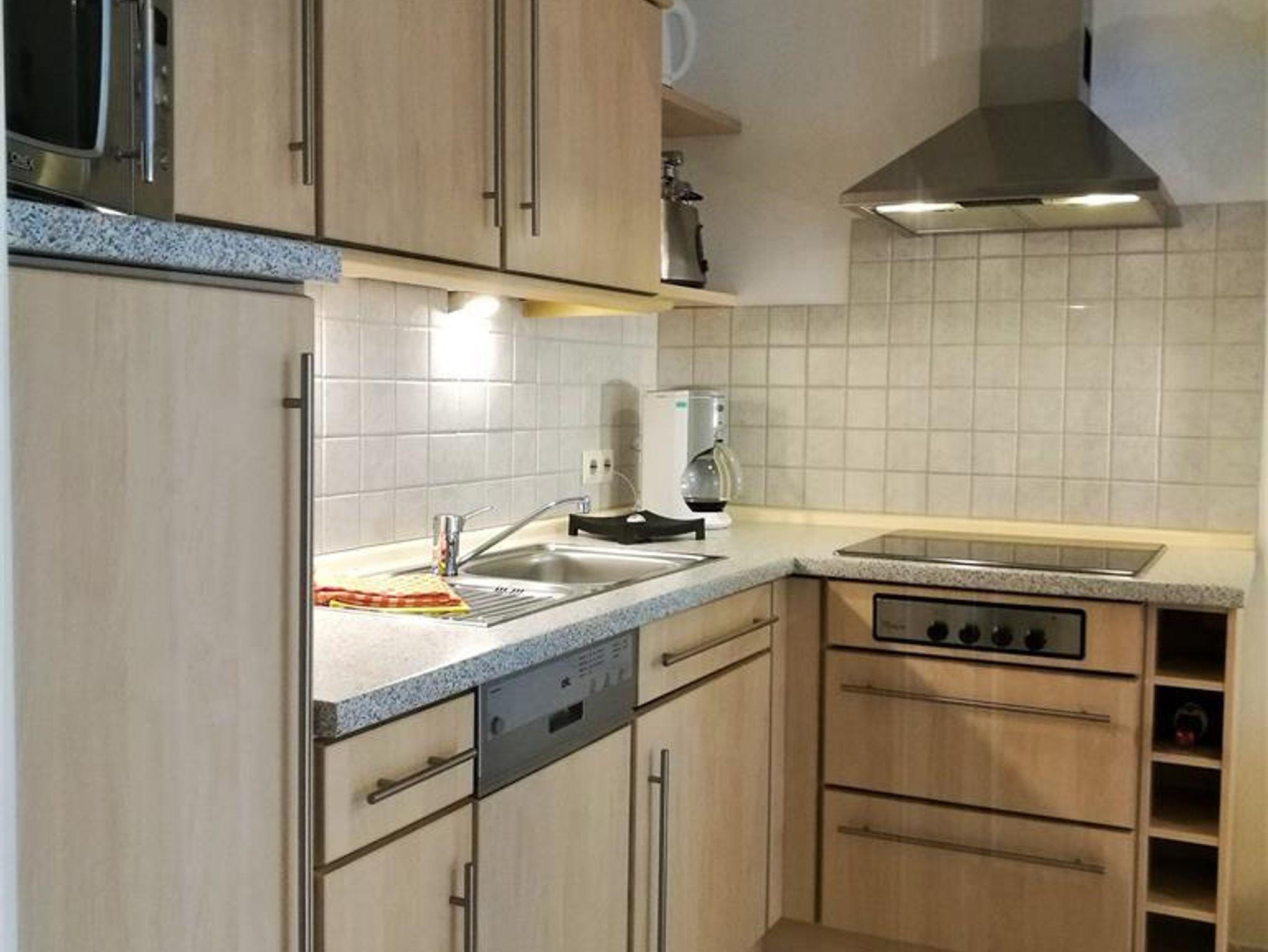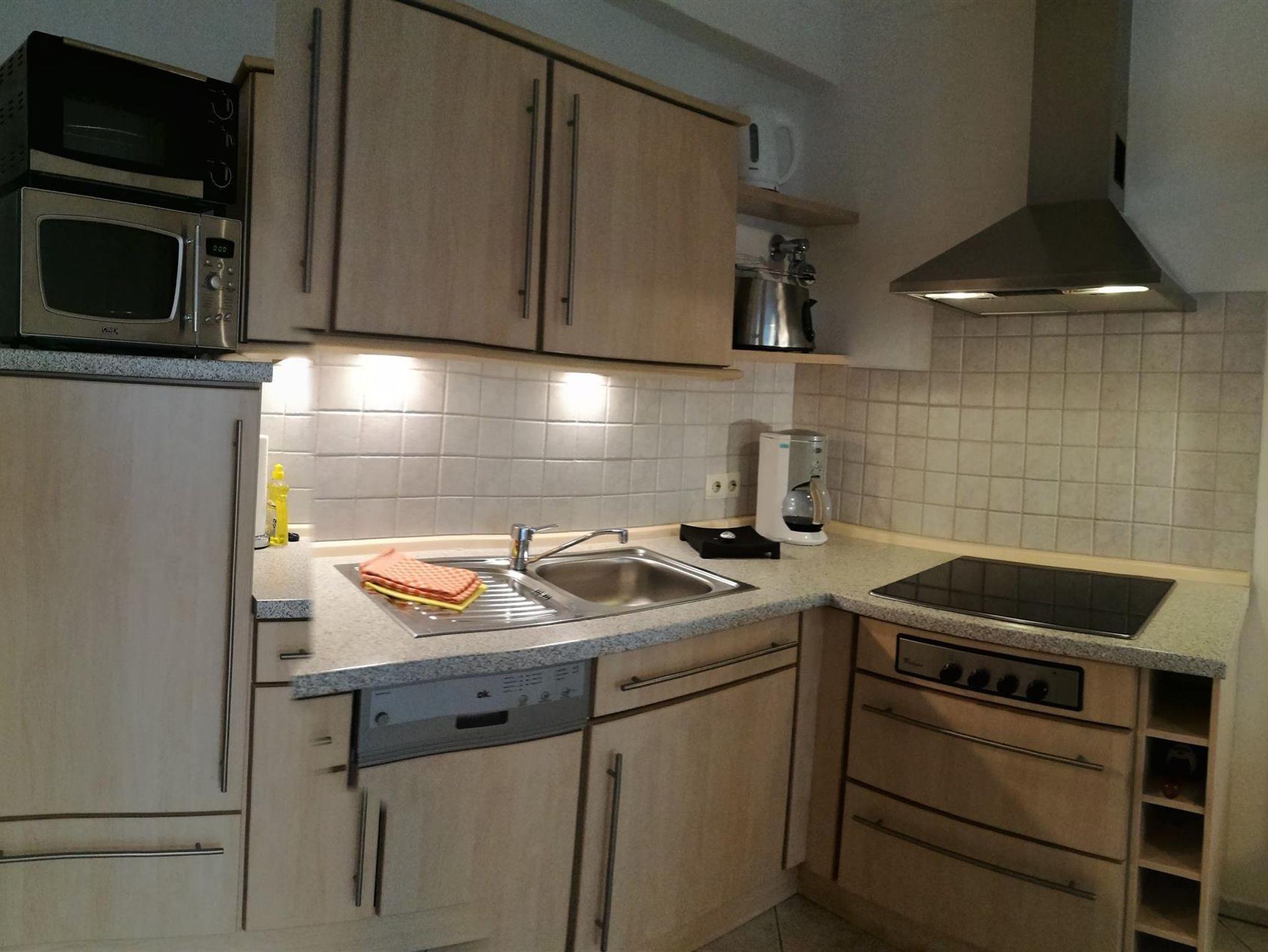 Eine komplett eingerichtete Einbauküche mit Spülmaschine, Backofen, Mikrowelle, Kaffeemaschine, Wasserkocher, Toaster, Ceranfeld mit Abzugshaube, Kühlschrank steht Ihnen zur Verfügung. Selbstverständlich ist die Küche mit reichlich Besteck, Geschirr, Gläsern, Töpfen usw. ausgestattet.