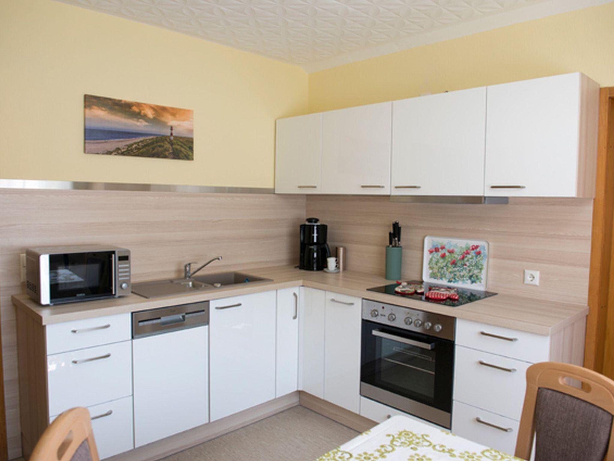 Voll ausgestattete Einbauküche mit viel Geschirr für Geschirrspüler, Kaffee- u. Espresso-Maschine, Backofen, Dunstabzugshaube, Kühl-/Gefrierschrank, Mikrowelle etc., praktische Eckbank-Gruppe.