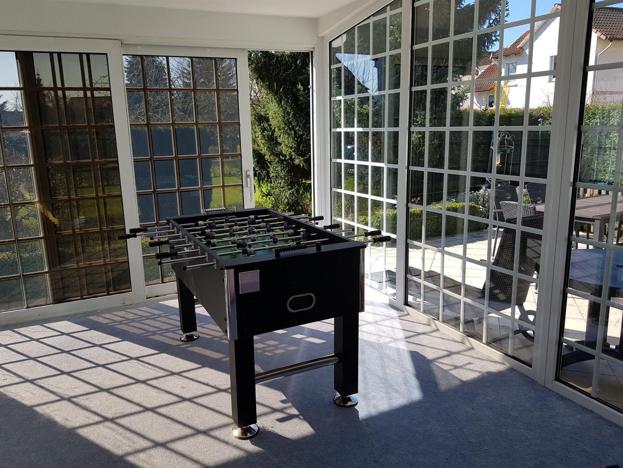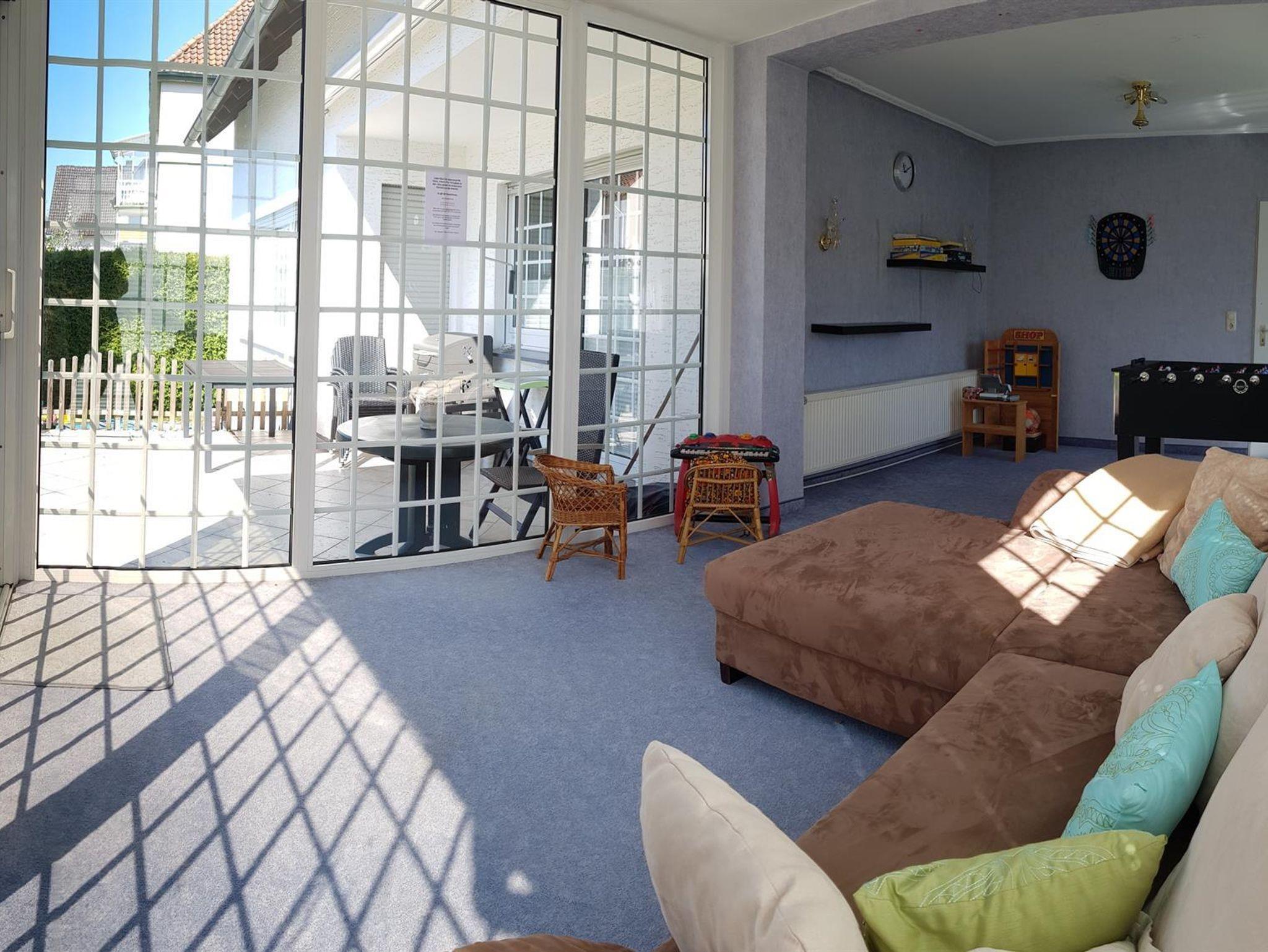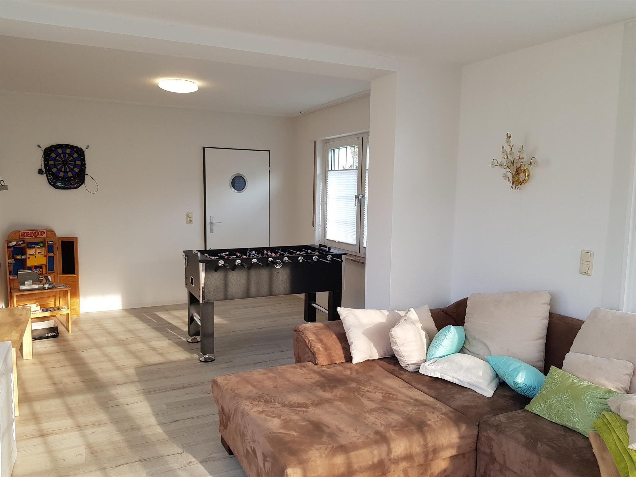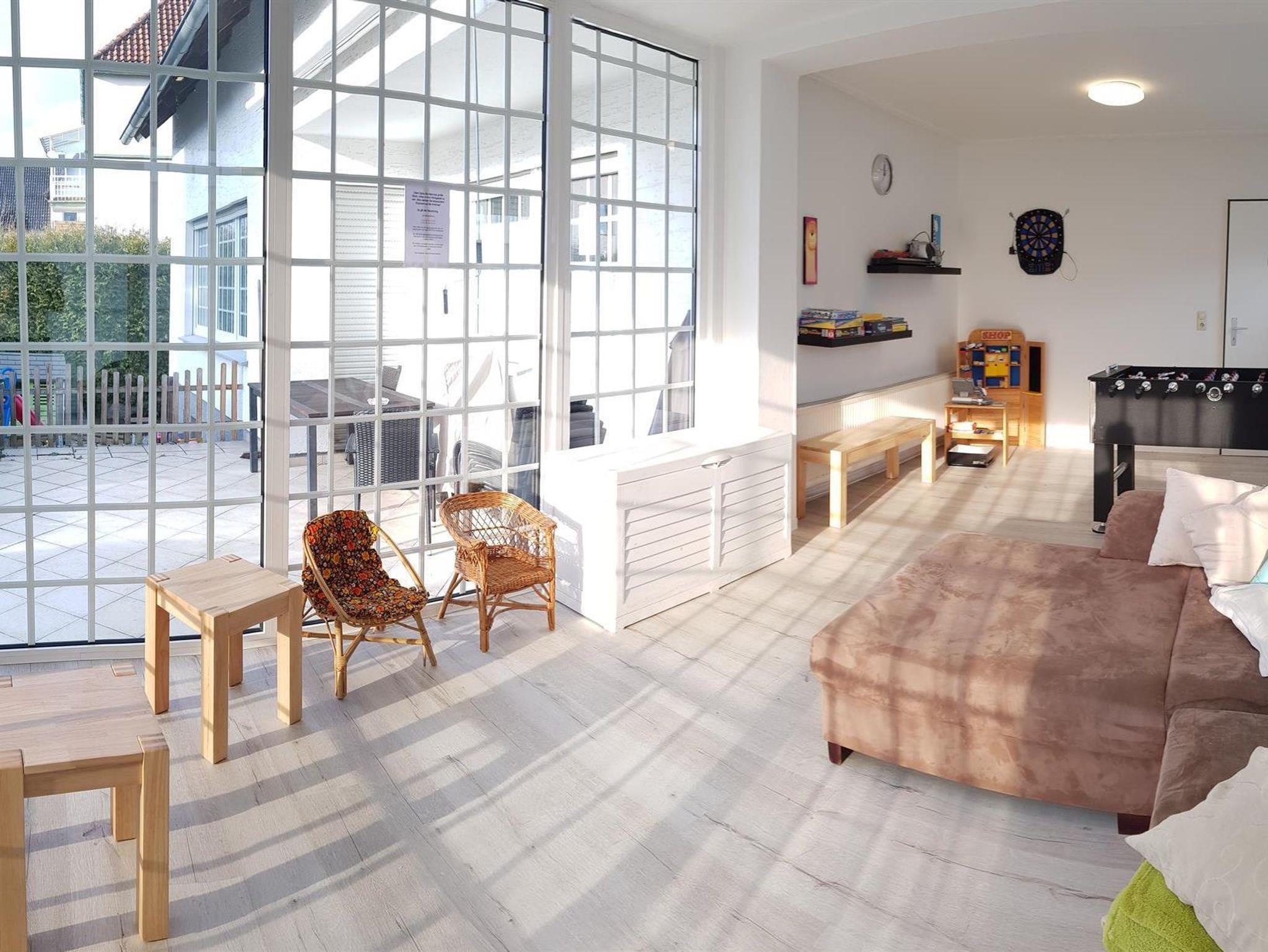Weiterhin gibt es einen Wohn-/Essbereich mit Kabel-TV, eine moderne, voll ausgestattete Küche mit Spülmaschine, Backofen, Mikrowelle und Herd sowie eine Terrasse mit Grillmöglichkeit (erreichbar aus Küche, Wintergarten und Wohnzimmer). Weiterhin steht ein großer Wintergarten mit Kickertisch, Dartscheibe und Kindereinkaufsladen zur Verfügung. W-Lan kostenlos. 5 kostenlose Parkplätze am Haus.