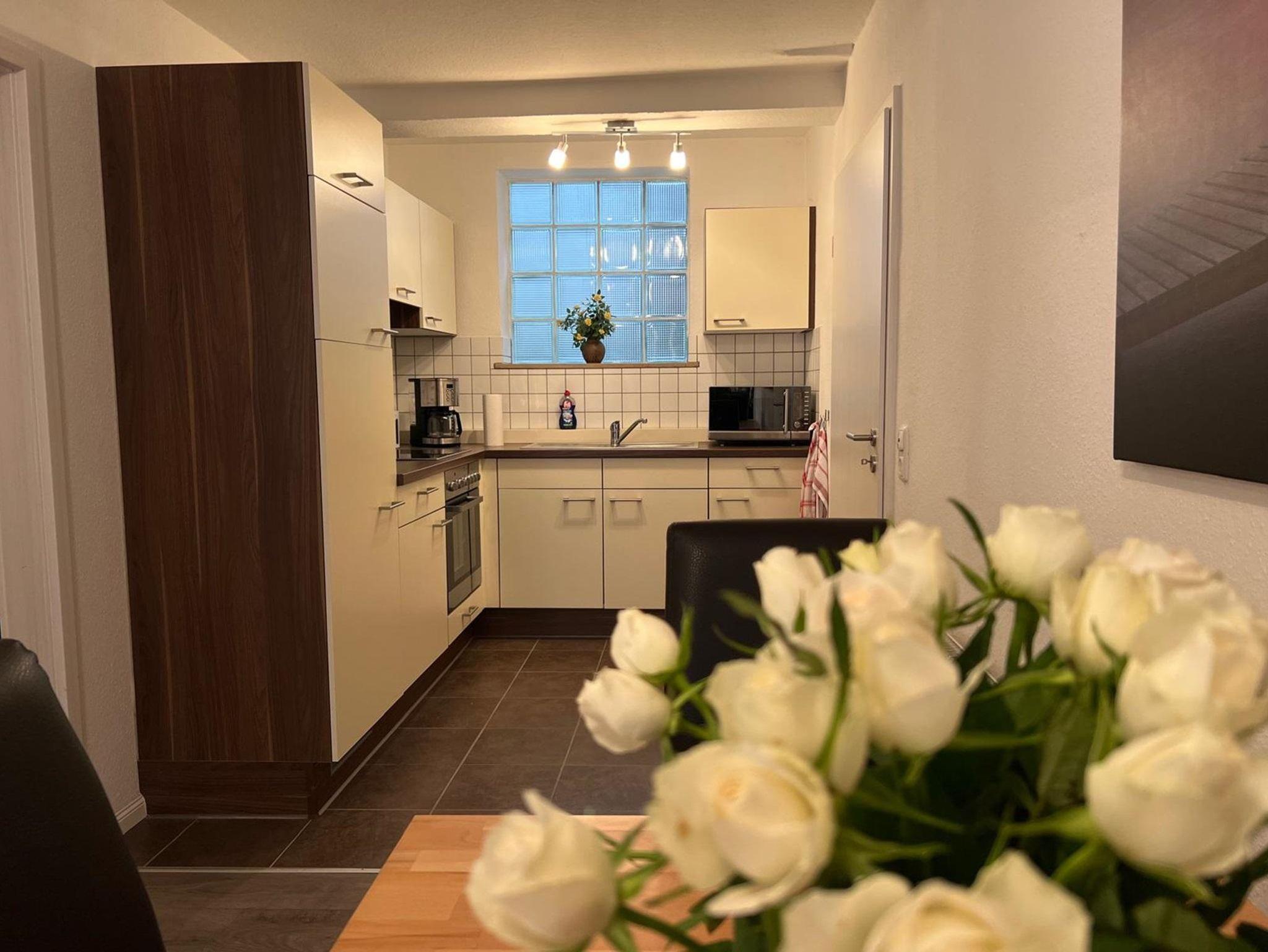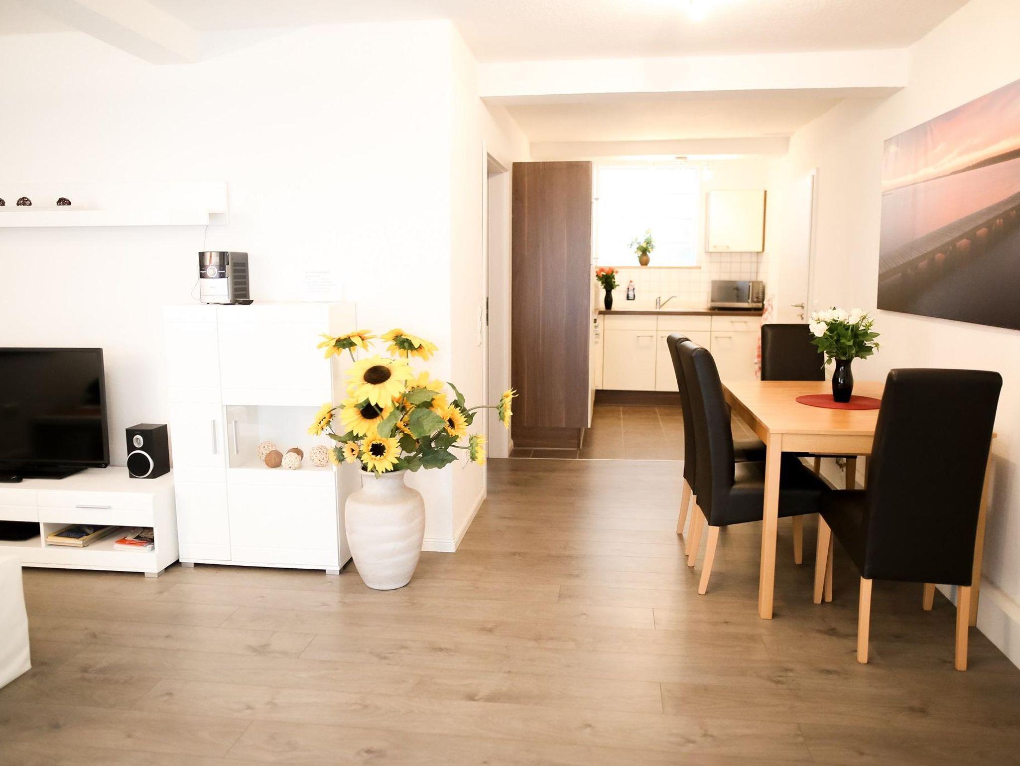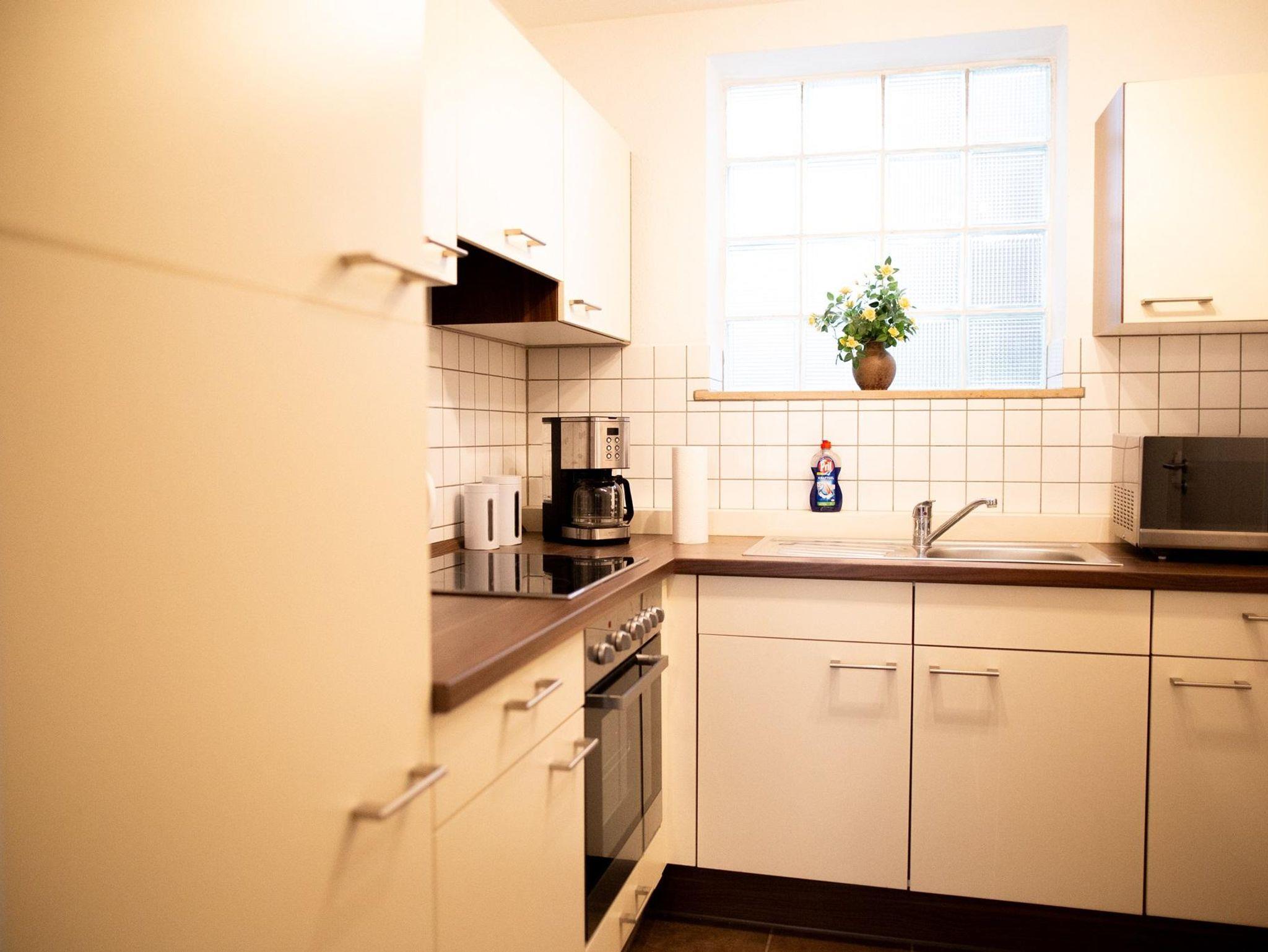 Unsere große Ferienwohnung ist barrierefrei und damit seniorengerecht. Direkt an dem großen Wohnzimmer gelegen ist die gemütliche Essecke, mit offener moderner Küche. Die komplett eingerichtete Einbauküche mit, Backofen, Mikrowellenbackofen, Kaffeemaschine, Wasserkocher, Toaster, Ceranfeld mit Abzugshaube, Kühlschrank und Gefrierschrank steht Ihnen zur Verfügung. Selbstverständlich ist die Küche mit reichlich Besteck, Geschirr, Gläsern, Töpfen usw. ausgestattet.