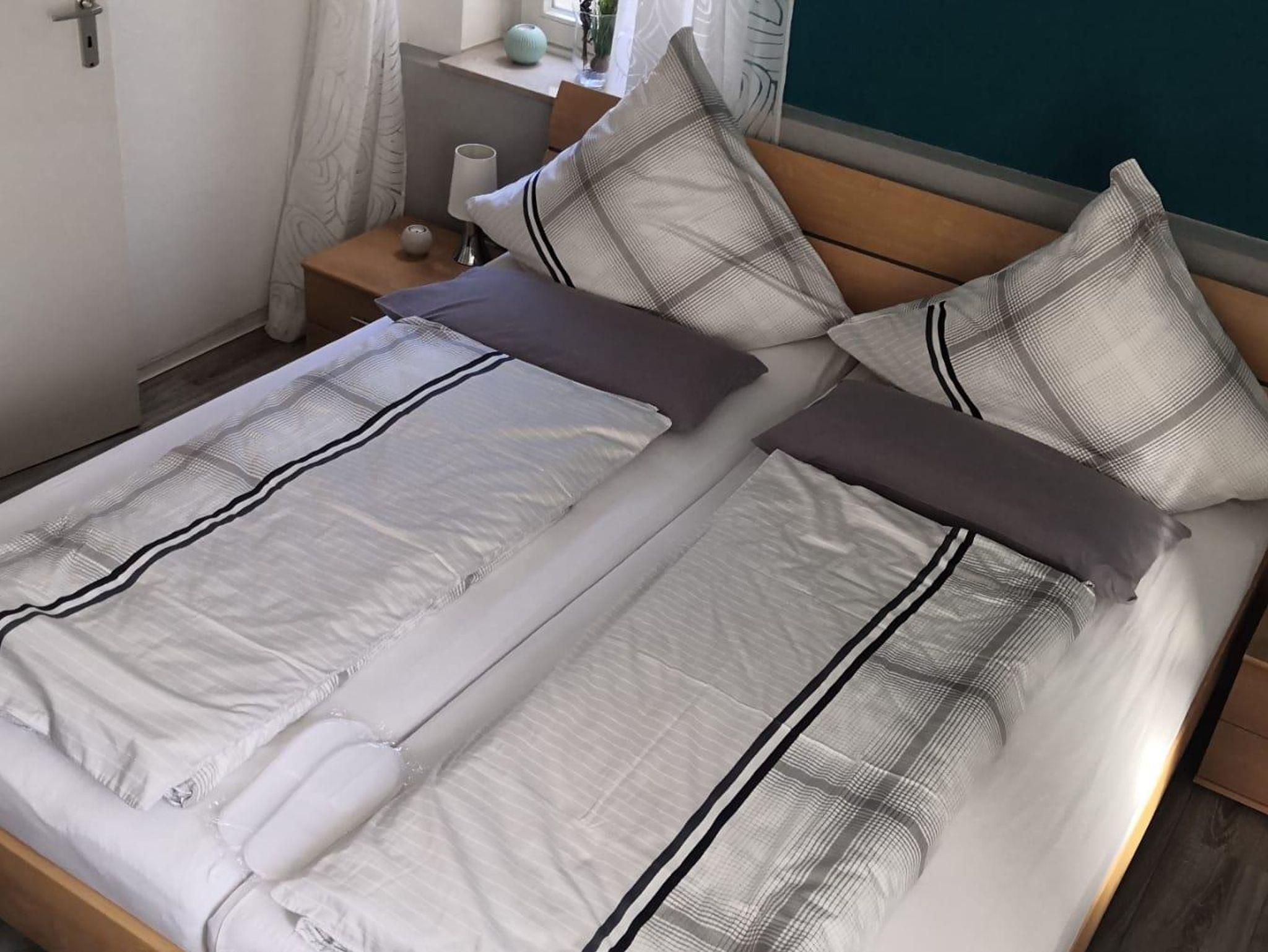 Betten für 3 Personen: ein Doppelbett im Schlafzimmer und ein Schlafsofa (140x200) im Wohnzimmer. Beim Bedarf kann auf Nachfrage ein Zustellbett für eine weitere 4. Person, oder 1 Babyreisebett mit Decke, Kissen und Bettwäsche (0-3 Jahre) mit einmaligem Aufpreis von 15€ zur Verfügung gestellt werden.
