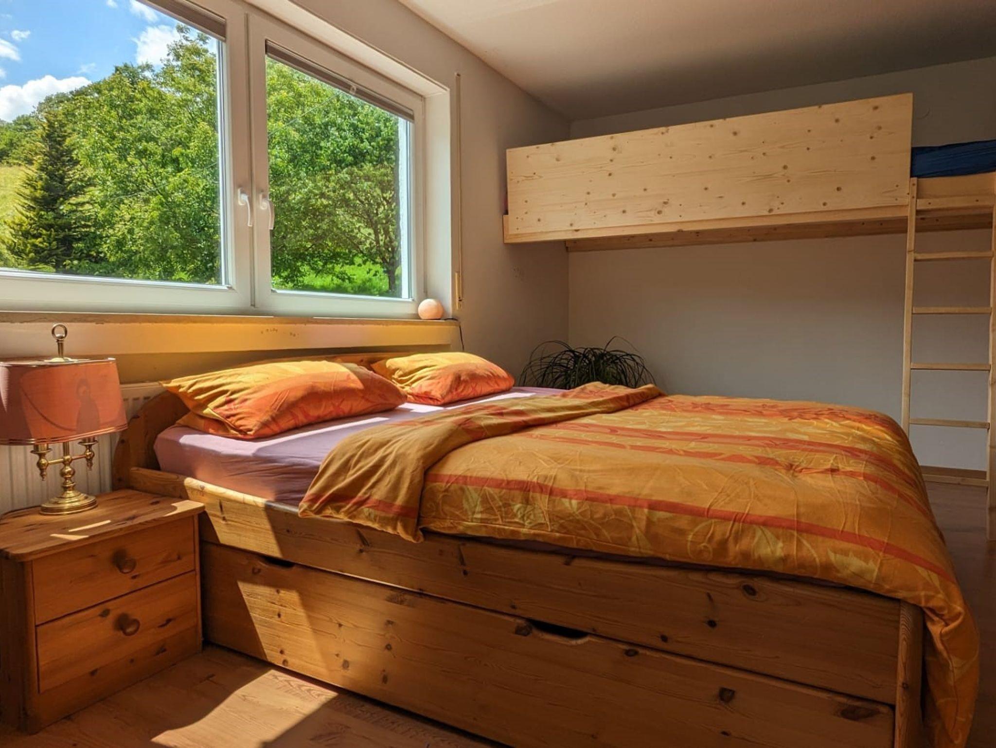 Willkommen in unserer Ferienwohnung Natur PUR. Diese gemütliche Unterkunft bietet Ihnen ein Wohnzimmer mit einer Schlafcouch (140 x 200 cm mit zusätzlichem Topper), die sich mit wenigen Handgriffen in ein komfortables Bett verwandeln lässt. Von hier aus haben Sie direkten Zugang zur Südterrasse und zum Garten. Das geräumige Schlafzimmer verfügt über ein Doppelbett und ein Stockbett, sowie einen TV und einen kleinen Tisch. Auch hier gelangen Sie auf die Terrasse. Im liebevoll eingerichteten Kinderzimmer befindet sich ein weiteres Stockbett sowie Spielsachen und Bücher für Kinder im Alter von 1-6 Jahren. Auf Anfrage stellen wir gerne ein Kinderreisebett mit Bettwäsche zur Verfügung. Das Badezimmer ist mit einer begehbaren Dusche und einer Badewanne ausgestattet, das WC befindet sich ebenfalls im Badezimmer. Wir freuen uns darauf, Sie bei uns begrüßen zu dürfen!