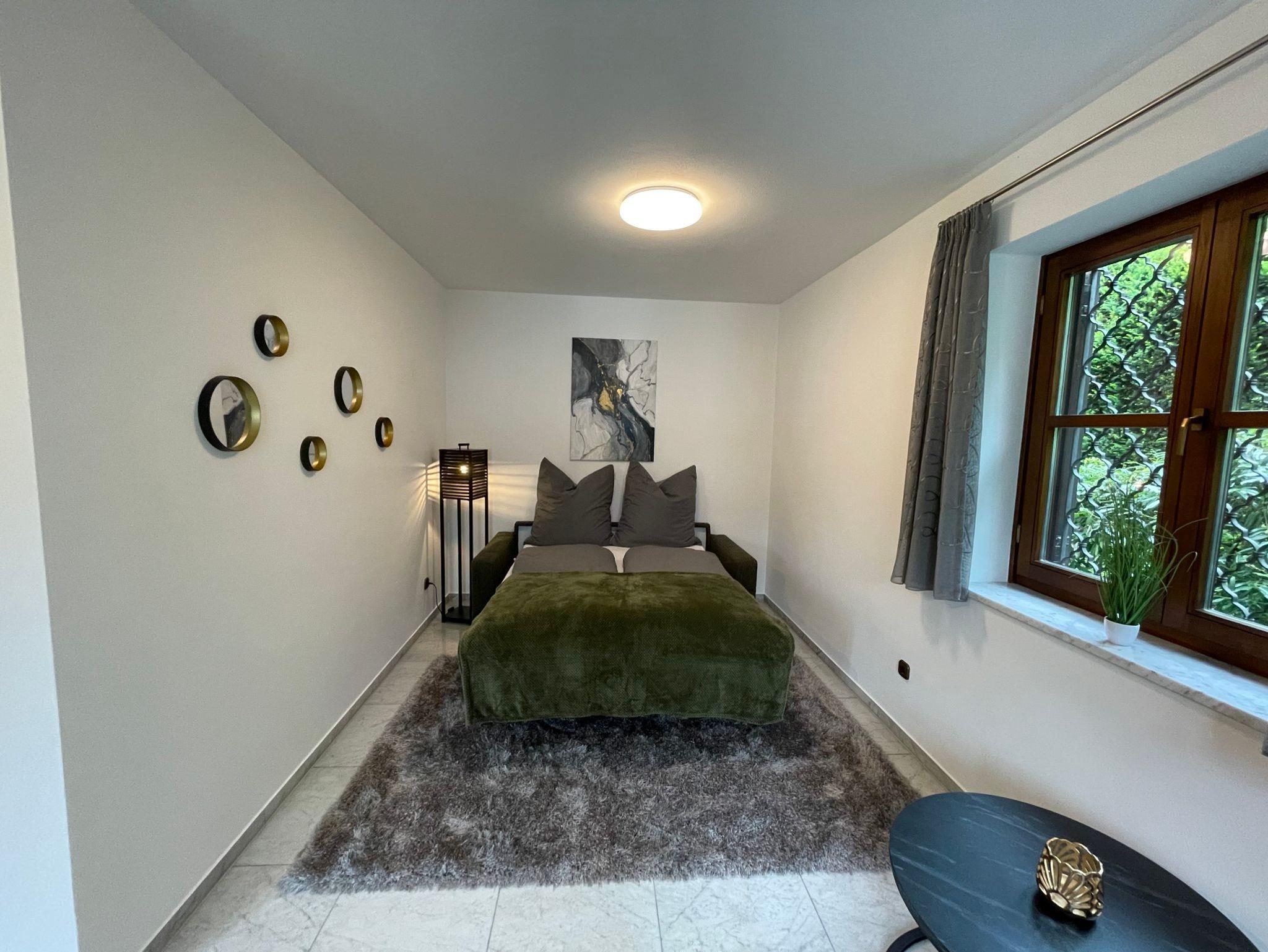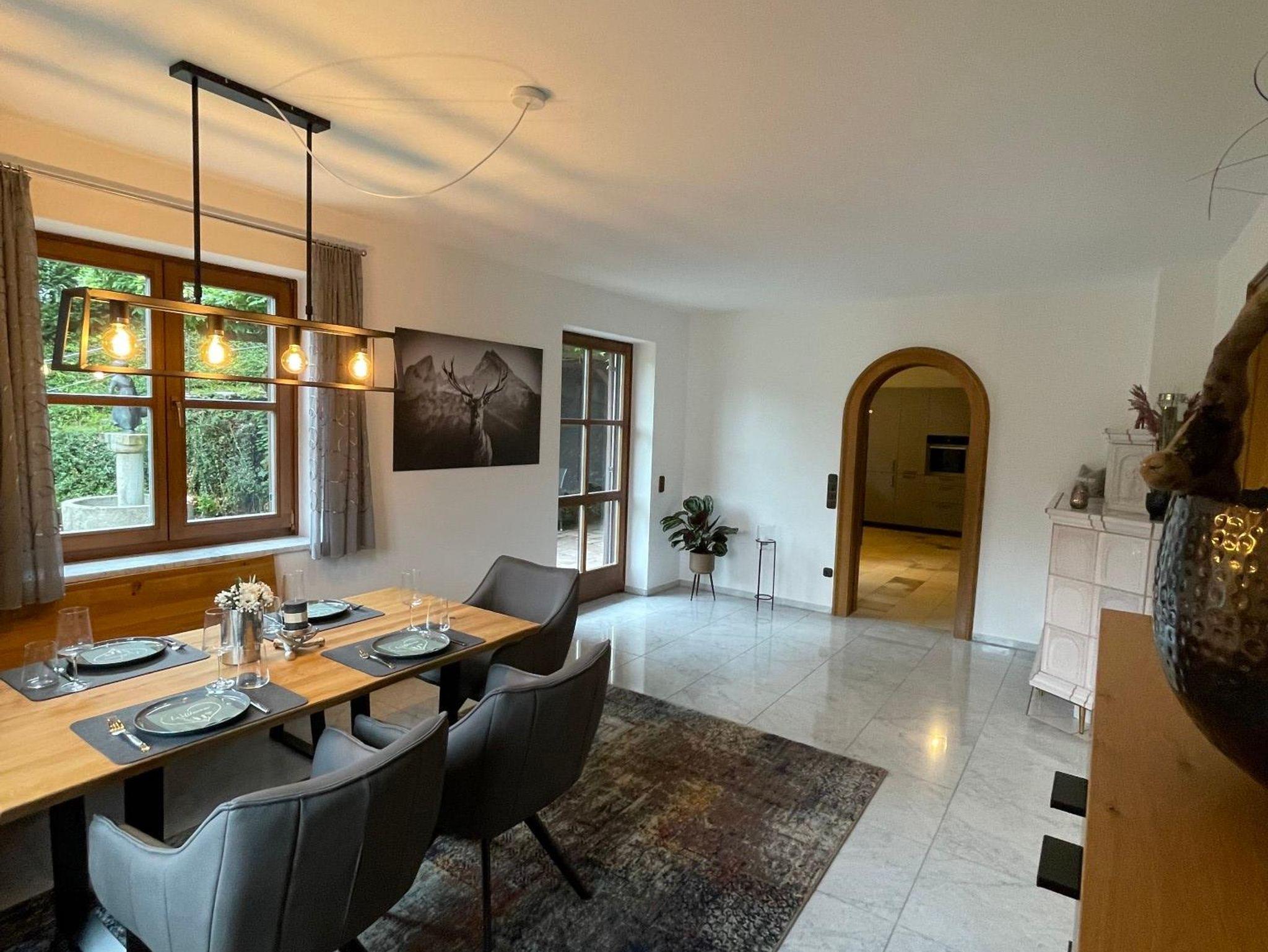 Unsere liebevoll gestaltete 140 qm große Ferienwohnung vereint mit erstklassigem Komfort befindet sich in Nonn, einem charmanten Ortsteil von Bad Reichenhall. Das geräumige 140 qm große Apartment mit Terrasse und Bergblick verfügt über 2 Schlafzimmer. Das erste Schlafzimmer ist mit einem Doppelbett (180 x 200 cm) ausgestattet. Das zweite Schlafzimmer ist mit einem französischem Doppelbett (160x200cm) ausgestattet. Das geräumige Wohnzimmer verfügt über eine Couch und einen Flachbild-TV. Die voll ausgestattete Küche mit einem Geschirrspüler, einem Backofen, einem Toaster und einem Kühlschrank lässt keine Wünsche offen. Der Essbereich mit einem gemütlichen Kamin lädt zum Verweilen ein. Das Badezimmer ist mit einer Dusche ausgestattet. Den Abend können Sie dann gemütlich auf der Terrasse mit dem wunderschönen Bergblick genießen.