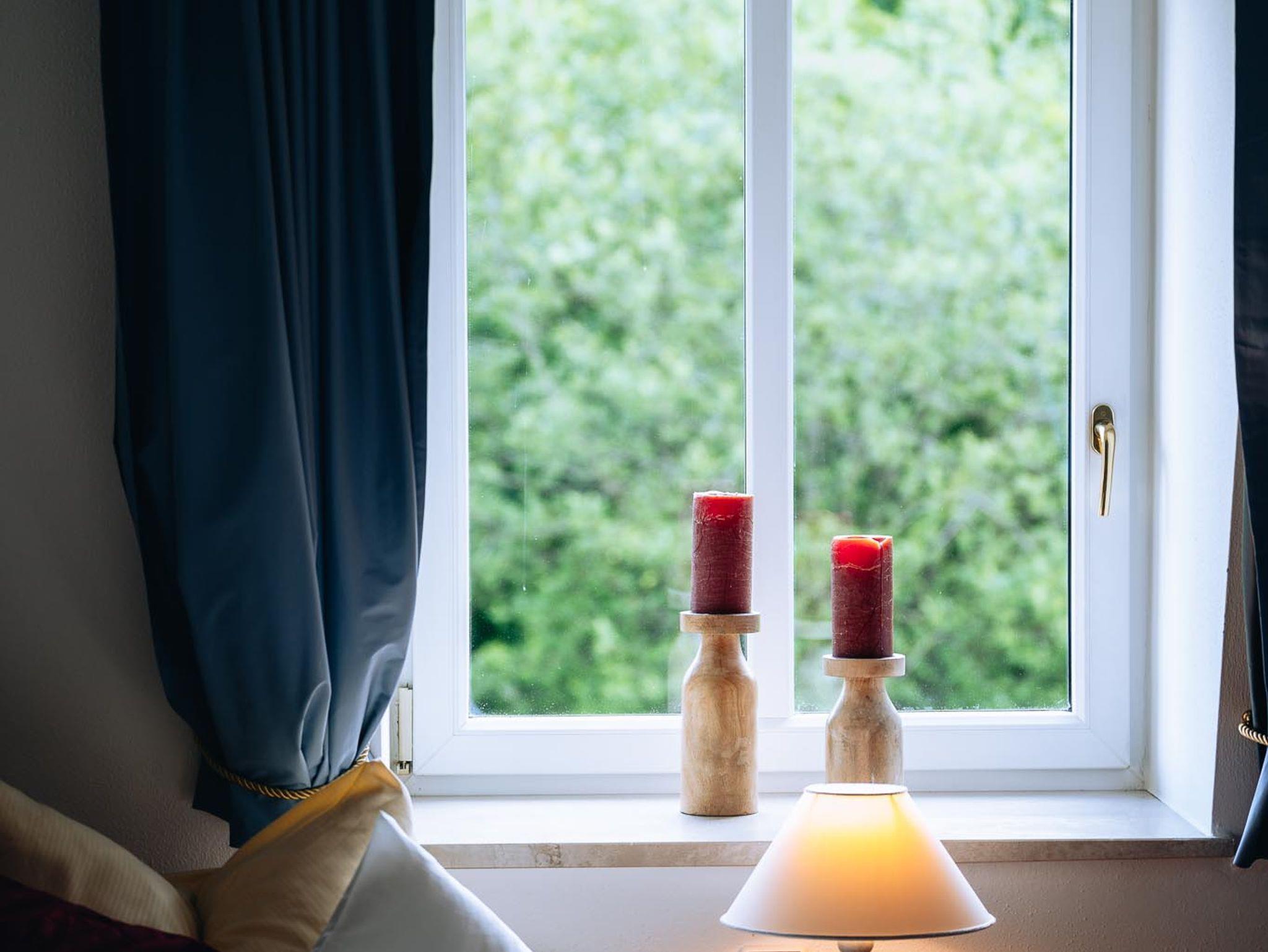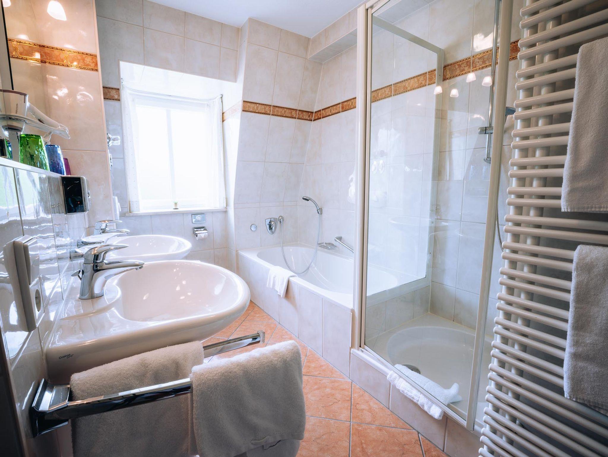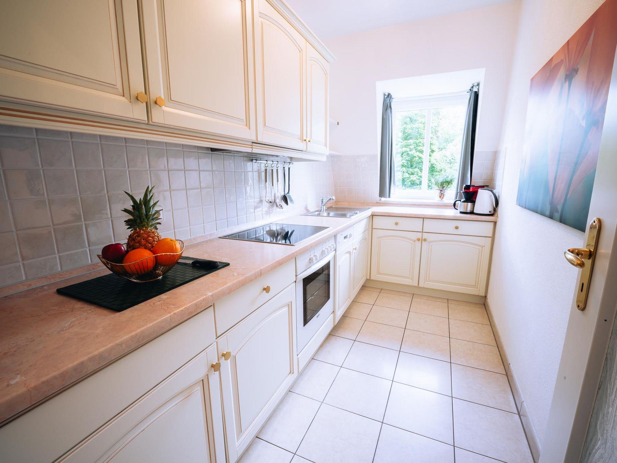 Das großzügige Appartement verfügt über zwei Schlafzimmer mit Doppelbett bwz. zwei Einzelbetten (Boxspringmatratzen), ein Wohnzimmer mit Essecke, eine große Küche sowie ein Bad mit Dusche und Badewanne. Von Ihrem Balkon (Ostseite) aus können Sie den Blick in die Natur genießen, wo sie mit etwas Glück manchmal Rehe oder Hasen beobachten können.