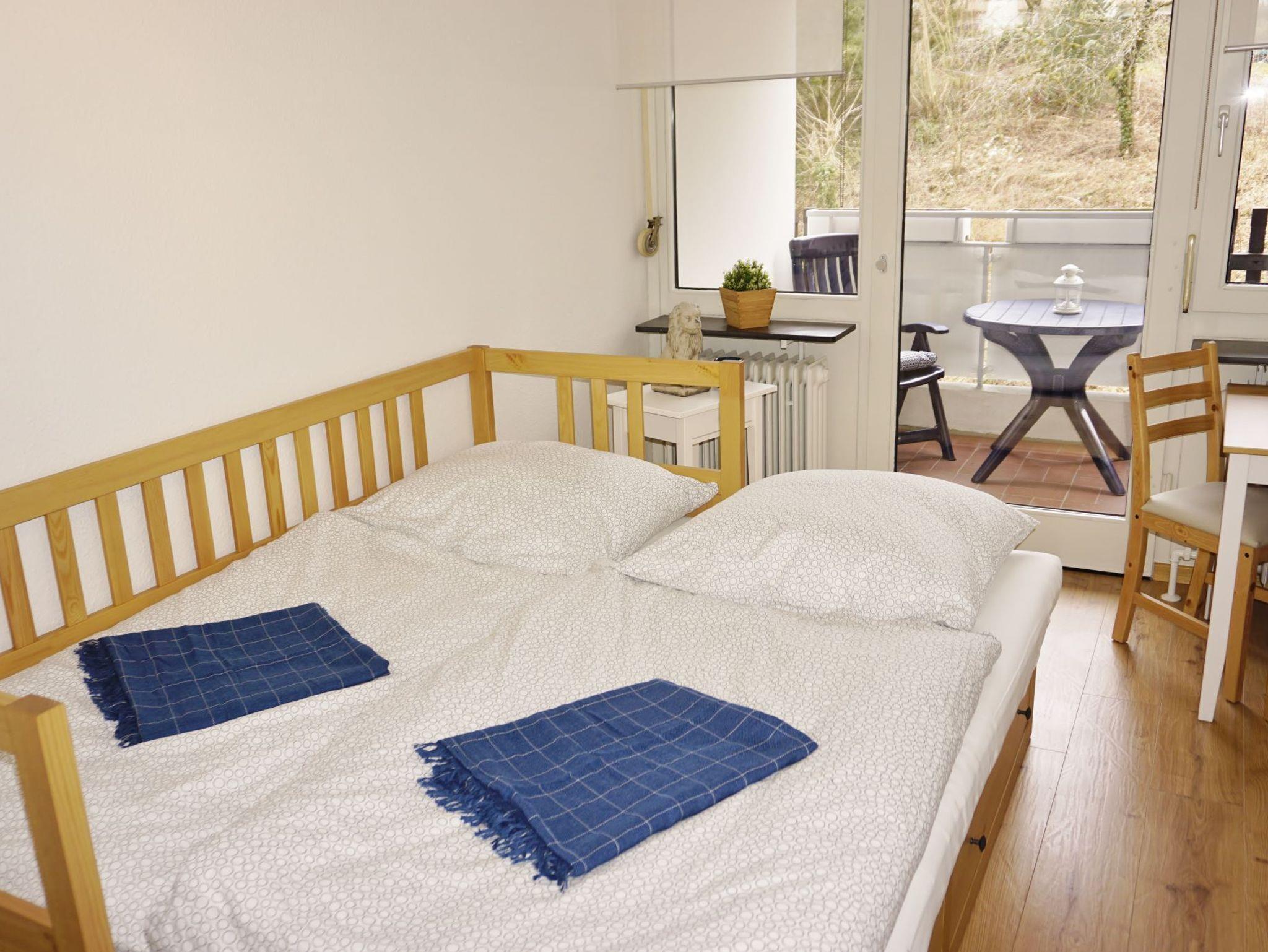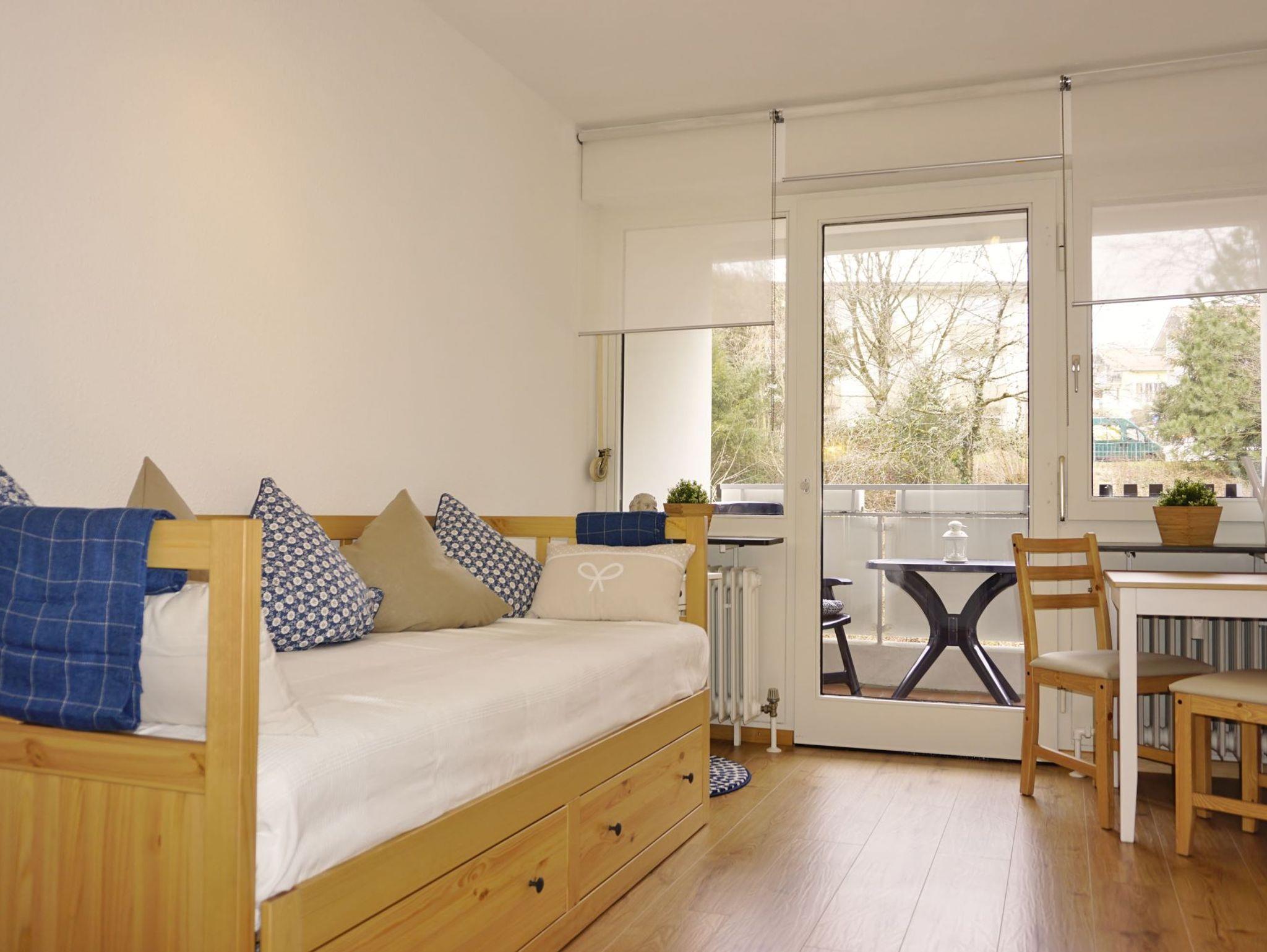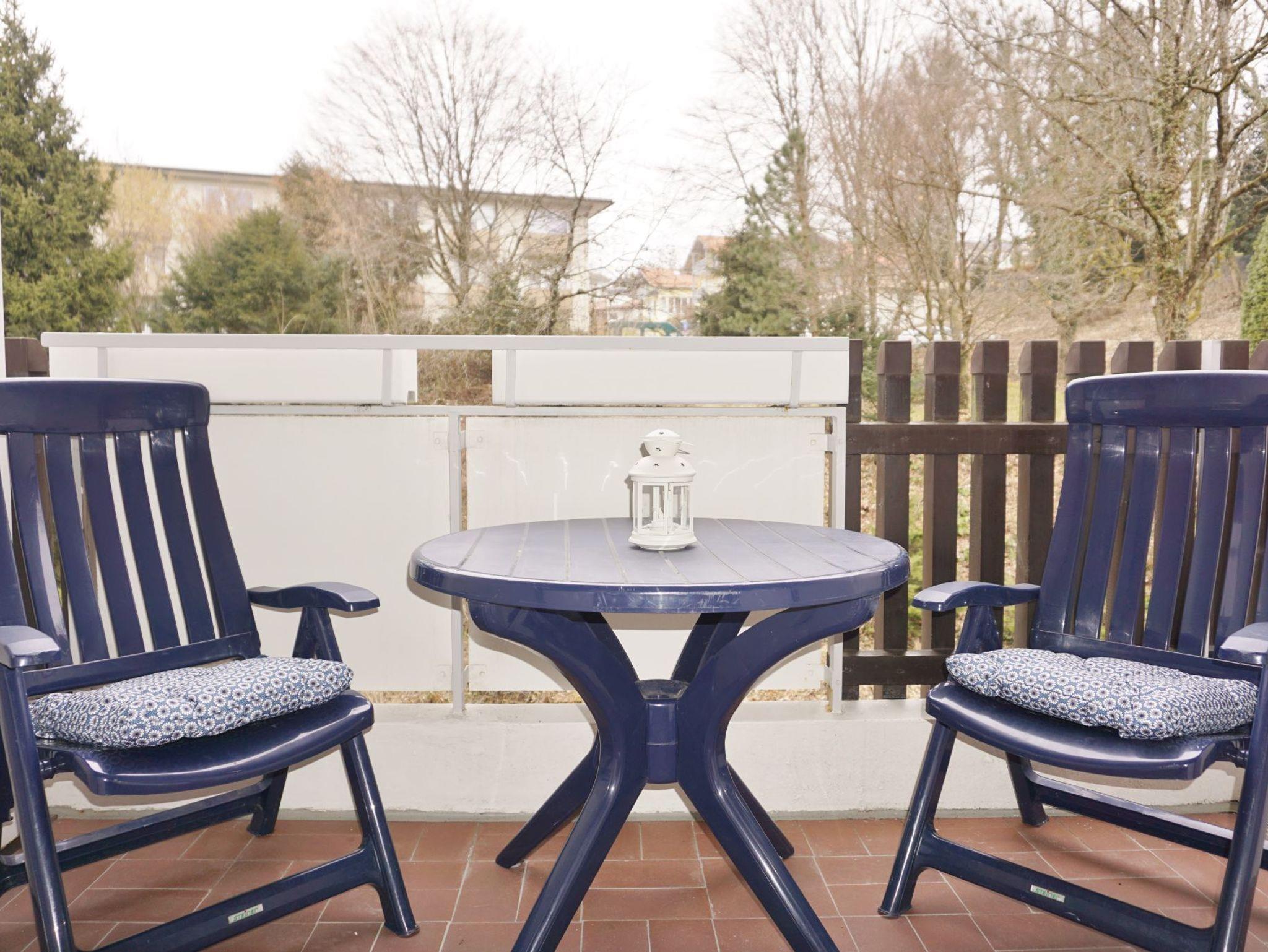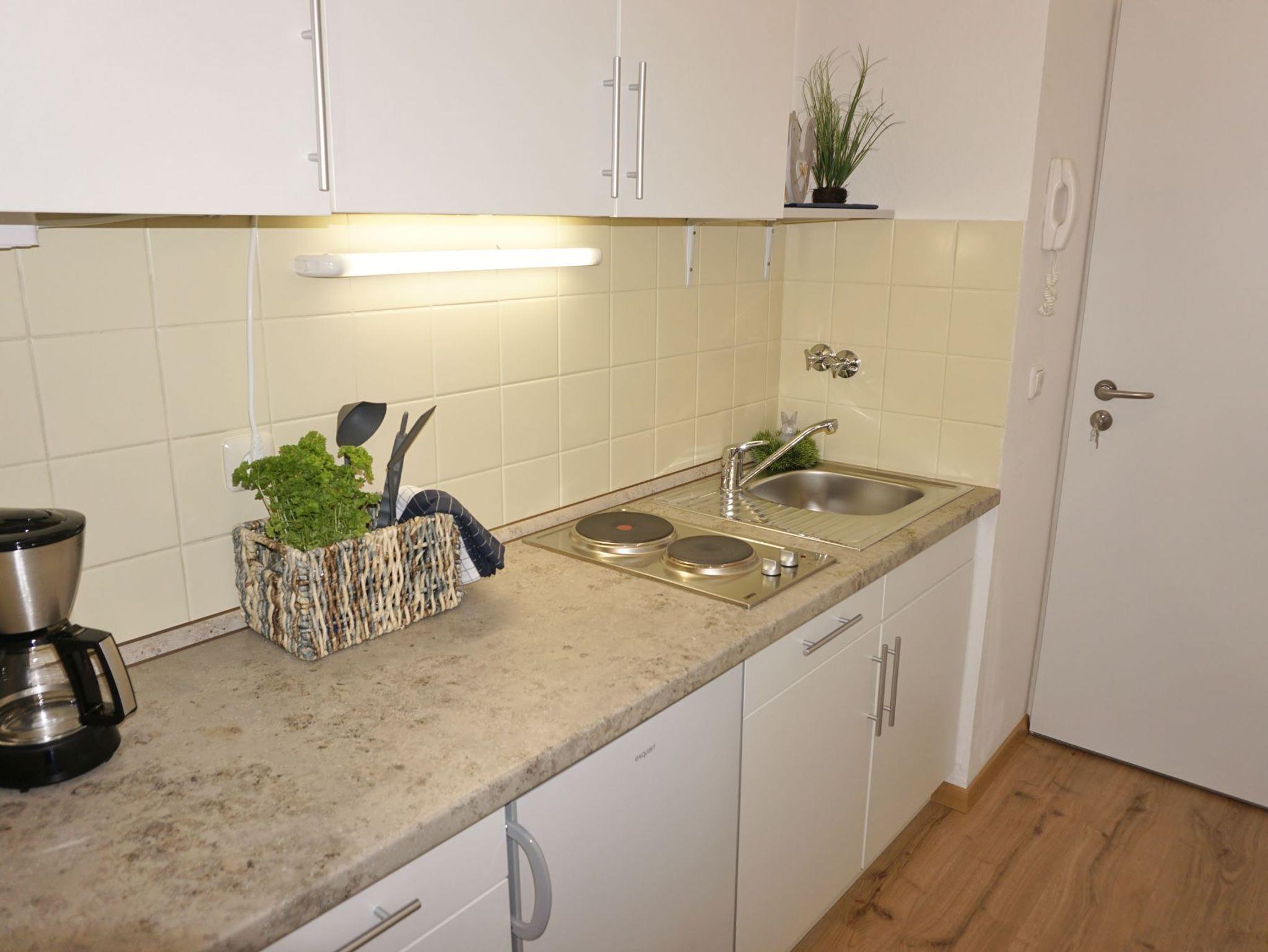Der kombinierte Wohn-/Schlafraum ist sehr geschmackvoll möbliert. Das funktionale Tagesbett lässt sich im Handumdrehen von einer gemütlichen Schlafgelegenheit für ein oder zwei Personen zu einem hübschen Sofa umbauen. In den beiden vorhandenen Schubladen lassen sich Bettwaren wie Kissen und Decken wunderbar unterbringen. Ihre Kleidung findet in einem großzügigen Schrank Platz, auch Ihre Koffer lassen sich hier ohne weiteres verstauen. Kommode und ein Essplatz für Zwei vollenden die Inneneinrichtung und ermöglichen Erholung pur. Der überdachte Balkon in Richtung Südost ist ebenfalls möbliert und bietet einen herrlichen Blick ins Grüne. Die Einbauküche mit 2-Plattenherd ist voll ausgestattet und lässt keine Wünsche offen. In dem vorhandenen Minibackofen lassen sich bereits am Morgen frische Brötchen aufbacken. Eine vorhandene Kaffeemaschine lässt den Tag mit einer guten Tasse Kaffee starten. Ein kleines aber feines Duschbad rundet das Angebot ab. Zudem ist ein Tiefgaragenstellplatz vorhanden.