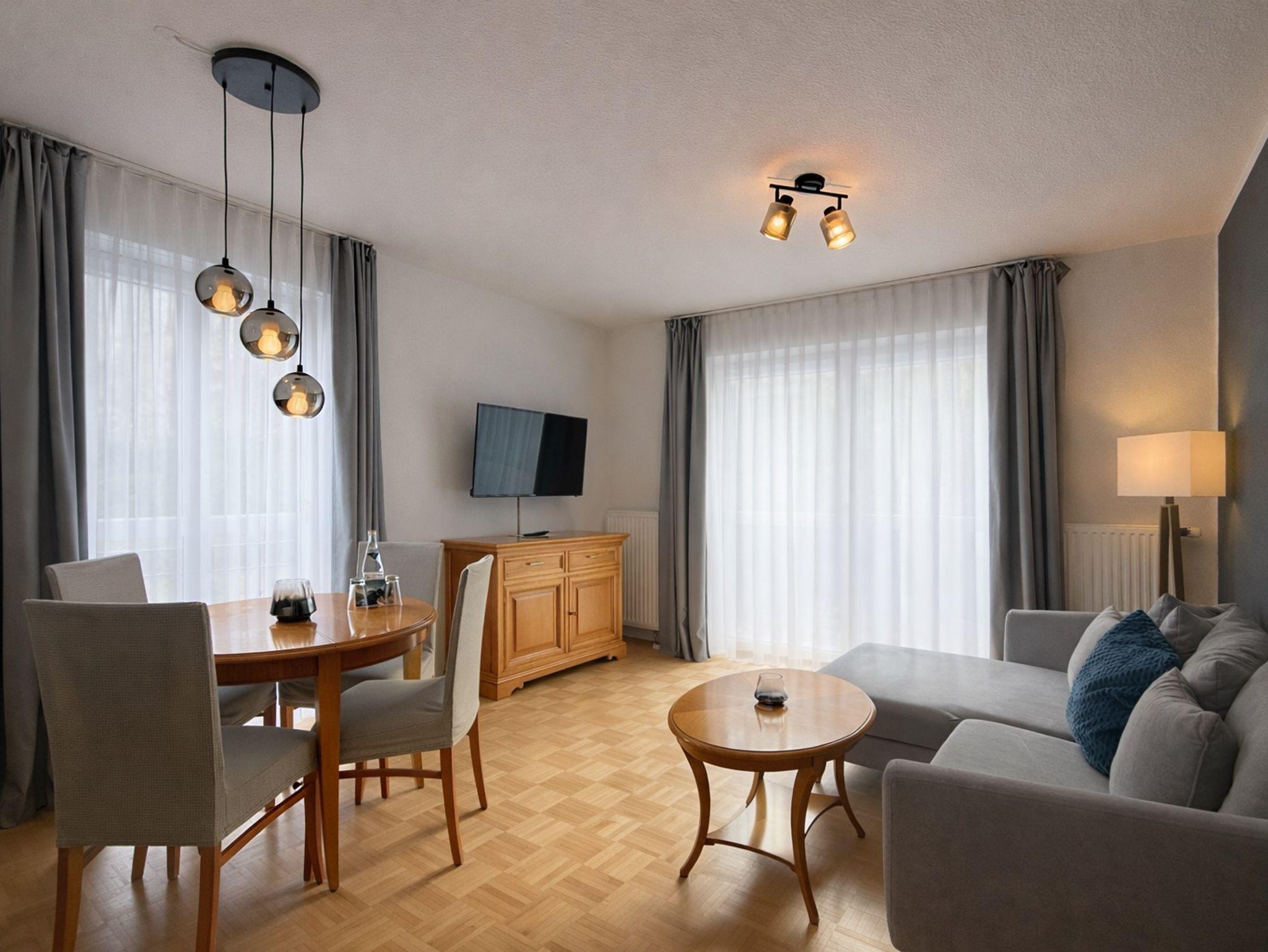 Unser schönes, gemütliches Apartement ist im klassisch- eleganten Stil eingerichtet. Die Wohnung befindet sich im 2. OG und verfügt über ein separates Schlafzimmer mit einem Doppelbett (Boxspringmatratzen - 1,80 x 2,00), ein Wohnzimmer mit Essecke, eine voll ausgestattete Küche mit Geschirrspüler, sowie ein Bad mit Dusche/WC. Von Ihrem Balkon (Ostseite) aus können Sie den Blick in die Natur genießen, wo sie mit etwas Glück manchmal Rehe oder Hasen beobachten können.